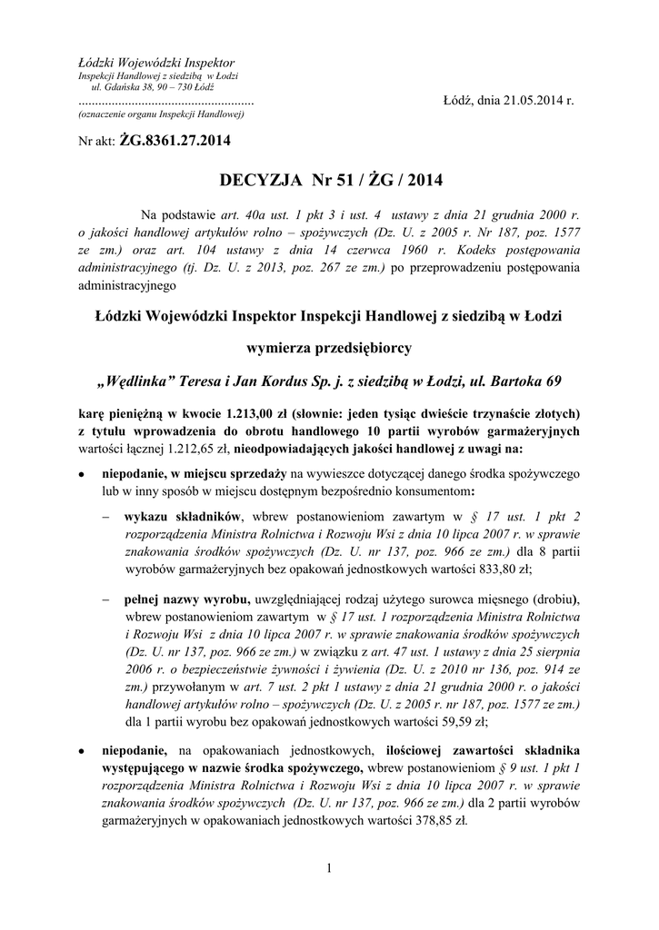 Łódzki Wojewódzki Inspektor Inspekcji Handlowej z siedzibą w Łodzi ul. Gdańska 38, 90 – 730 Łódź Łódź, dnia 21.05.2014 r. ..................................................... (oznaczenie organu Inspekcji Handlowej) Nr akt: ŻG.8361.27.2014 DECYZJA Nr 51 / ŻG / 2014 Na podstawie art. 40a ust. 1 pkt 3 i ust. 4 ustawy z dnia 21 grudnia 2000 r. o jakości handlowej artykułów rolno – spożywczych (Dz. U. z 2005 r. Nr 187, poz. 1577 ze zm.) oraz art. 104 ustawy z dnia 14 czerwca 1960 r. Kodeks postępowania administracyjnego (tj. Dz. U. z 2013, poz. 267 ze zm.) po przeprowadzeniu postępowania administracyjnego Łódzki Wojewódzki Inspektor Inspekcji Handlowej z siedzibą w Łodzi wymierza przedsiębiorcy „Wędlinka” Teresa i Jan Kordus Sp. j. z siedzibą w Łodzi, ul. Bartoka 69 karę pieniężną w kwocie 1.213,00 zł (słownie: jeden tysiąc dwieście trzynaście złotych) z tytułu wprowadzenia do obrotu handlowego 10 partii wyrobów garmażeryjnych wartości łącznej 1.212,65 zł, nieodpowiadających jakości handlowej z uwagi na: niepodanie, w miejscu sprzedaży na wywieszce dotyczącej danego środka spożywczego lub w inny sposób w miejscu dostępnym bezpośrednio konsumentom: wykazu składników, wbrew postanowieniom zawartym w § 17 ust. 1 pkt 2 rozporządzenia Ministra Rolnictwa i Rozwoju Wsi z dnia 10 lipca 2007 r. w sprawie znakowania środków spożywczych (Dz. U. nr 137, poz. 966 ze zm.) dla 8 partii wyrobów garmażeryjnych bez opakowań jednostkowych wartości 833,80 zł; pełnej nazwy wyrobu, uwzględniającej rodzaj użytego surowca mięsnego (drobiu), wbrew postanowieniom zawartym w § 17 ust. 1 rozporządzenia Ministra Rolnictwa i Rozwoju Wsi z dnia 10 lipca 2007 r. w sprawie znakowania środków spożywczych (Dz. U. nr 137, poz. 966 ze zm.) w związku z art. 47 ust. 1 ustawy z dnia 25 sierpnia 2006 r. o bezpieczeństwie żywności i żywienia (Dz. U. z 2010 nr 136, poz. 914 ze zm.) przywołanym w art. 7 ust. 2 pkt 1 ustawy z dnia 21 grudnia 2000 r. o jakości handlowej artykułów rolno – spożywczych (Dz. U. z 2005 r. nr 187, poz. 1577 ze zm.) dla 1 partii wyrobu bez opakowań jednostkowych wartości 59,59 zł; niepodanie, na opakowaniach jednostkowych, ilościowej zawartości składnika występującego w nazwie środka spożywczego, wbrew postanowieniom § 9 ust. 1 pkt 1 rozporządzenia Ministra Rolnictwa i Rozwoju Wsi z dnia 10 lipca 2007 r. w sprawie znakowania środków spożywczych (Dz. U. nr 137, poz. 966 ze zm.) dla 2 partii wyrobów garmażeryjnych w opakowaniach jednostkowych wartości 378,85 zł. 1 Uzasadnienie W dniach od 05 do 07 lutego 2014 r. na podstawie upoważnienia Łódzkiego Wojewódzkiego Inspektora Inspekcji Handlowej numer ŻG.8361.27.2014 z dnia 05.02.2014r. inspektorzy Wojewódzkiego Inspektoratu Inspekcji Handlowej w Łodzi przeprowadzili kontrolę w sklepie zlokalizowanym w Łodzi przy ul. Bartoka 69, należącym do „Wędlinka” Teresa i Jan Kordus Sp. j. z siedzibą w Łodzi. Kontrolę przeprowadzono na podstawie przepisów art. 3 ust. 1 - 3 rozporządzenia Parlamentu Europejskiego i Rady (WE) Nr 882/2004 z dnia 29 kwietnia 2004 r. w sprawie kontroli urzędowych przeprowadzanych w celu sprawdzenia zgodności z prawem paszowym i żywnościowym oraz regułami dotyczącymi zdrowia zwierząt i dobrostanu zwierząt (Dz. U. L 165 z 30.4.2004 ze zm.), art. 17 ust. 3 ustawy z dnia 21 grudnia 2000 r. o jakości handlowej artykułów rolno-spożywczych (Dz. U. z 2005 r. nr 187, poz. 1577, ze zm.), art. 24 ust. 1 rozporządzenia Parlamentu Europejskiego i Rady (WE) nr 1935/2004 z dnia 27 października 2004 r. w sprawie materiałów i wyrobów przeznaczonych do kontaktu z żywnością oraz uchylającego dyrektywy 80/590/EWG (Dz. U. z 27.10.2004 s. 4 ze zm.) w związku z art. 3 ust. 1 pkt 6 oraz art. 3 ust. 1 pkt 1 i 2 ustawy z dnia 15 grudnia 2000 r. o Inspekcji Handlowej (Dz. U. z 2009 r. Nr 151, poz. 1219 ze zm.) w obecności osoby upoważnionej … (05.02.2014 r.) oraz wspólników Teresy Kordus i Jana Kordus (06.02.2014 r. i 07.02.2014 r.). W trakcie prowadzonych działań kontrolnych stwierdzono, że w obrocie handlowym znajdowało się 10 partii wyrobów garmażeryjnych, wyprodukowanych przez „Wędlinka” Teresa i Jan Kordus Sp. j z siedzibą w Łodzi, Zakład Produkcyjny, ul. Lodowa 94 93-232 Łódź, wartości łącznej 1.212,65 zł, które były oznakowane niezgodnie z obowiązującymi przepisami. Dla: 8 partii wyrobów garmażeryjnych bez opakowań deklarowanych w miejscu sprzedaży jako: zawijasy wołowe w cenie 59,99 zł za 1 kilogram (1,09 kg), polędwiczki wieprzowe z pieczarkami w cenie 49,99 zł za 1 kilogram (0,415 kg), krokiety z mięsem w cenie 15,99 zł za 1 kilogram (4,70 kg), krokiety z kapustą w cenie 15,99 zł za 1 kilogram (4,50 kg), polędwiczki w płatkach w cenie 39,99 zł za 1 kilogram (1,49 kg), bigos domowy w cenie 12,99 zł za 1 kilogram (6,60 kg), kapusta zasmażana w cenie 14,99 zł za 1 kilogram (18,50 kg), kapusta z grochem w cenie 19,99 zł za 1 kilogram (8,90 kg) wartości 833,80 zł, na wywieszce dotyczącej danego środka spożywczego lub w inny sposób w miejscu dostępnym bezpośrednio konsumentom nie podano wykazu składników. Brak tej informacji narusza postanowienia § 17 ust. 1 pkt 2 rozporządzenia Ministra Rolnictwa i Rozwoju Wsi z dnia 10 lipca 2007 r. w sprawie znakowania środków spożywczych (Dz. U. nr 137, poz. 966 ze zm.) zwanego dalej „rozporządzeniem w sprawie znakowania środków spożywczych”. Ponadto 1 partia wyrobu garmażeryjnego wartości 59,59 zł została wprowadzona do obrotu pod nazwą „polędwiczki w płatkach”, dla którego nie podano rodzaju użytego surowca mięsnego (w tym przypadku mięsa drobiowego). 2 Zastosowana zatem nazwa mogła wprowadzać konsumenta w błąd, gdyż uniemożliwiła ona rozpoznanie rodzaju i właściwości środka spożywczego oraz odróżnienie go od innych produktów. Podanie niepełnej nazwy wyrobu naruszało post