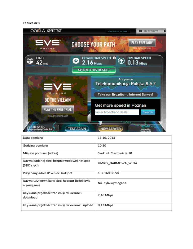 Tablica nr 1 Data pomiaru 16.10. 2013 Godzina pomiaru 10:20 Miejsce pomiaru (adres) Skoki ul. Ciastowicza 10 Nazwa badanej sieci bezprzewodowej hotspot (SSID sieci) UMIGS_DARMOWA_WIFI4 Przyznany adres IP w sieci hotspot 192.168.90.58 Nazwa użytkownika w sieci hotspot (jeżeli była wymagana) Nie była wymagana Uzyskana prędkość transmisji w kierunku download 2,16 Mbps Uzyskana prędkość transmisji w kierunku upload 0,13 Mbps Tablica nr 2 Data pomiaru 16.10. 2013 Godzina pomiaru 10:28 Miejsce pomiaru (adres) Skoki ul. Ciastowicza 10 Nazwa badanej sieci bezprzewodowej hotspot (SSID sieci) UMIGS_DARMOWA_WIFI4 Przyznany adres IP w sieci hot-spot 192.168.90.58 Nazwa użytkownika w sieci hotspot (jeżeli była wymagana) Nie była wymagana Uzyskana prędkość transmisji w kierunku download 1,19 Mbps Uzyskana prędkość transmisji w kierunku upload 0,12 Mbps Wykonano połączenie testowe z Internetem przez czas 80 minut (rozpoczęcie o 10:31). Zerwanie sesji nastąpiło o 11:42 (powinno o 11:31) i trwało do 11:46 (4 minuty). Tablica nr 3 Data pomiaru 16.10. 2013 Godzina pomiaru 11:53 Miejsce pomiaru (adres) Skoki ul. Ciastowicza 10 Nazwa badanej sieci bezprzewodowej hotspot (SSID sieci) UMIGS_DARMOWA_WIFI4 Przyznany adres IP w sieci hotspot 192.168.90.58 Nazwa użytkownika w sieci hotspot (jeżeli była wymagana) Nie była wymagana Uzyskana prędkość transmisji w kierunku download 1,85 Mbps Uzyskana prędkość transmisji w kierunku upload 0,15 Mbps Wykonano połączenie testowe z Internetem przez czas 80 minut (rozpoczęcie o godz. 12:00). W tym czasie nie nastąpiło zerwanie sesji (powinno nastąpić o godz. 13:00).