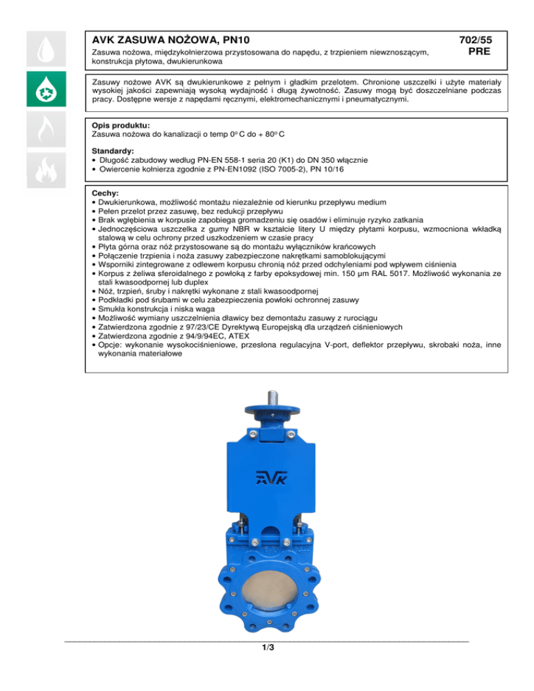AVK ZASUWA NOŻOWA, PN10 Zasuwa nożowa, międzykołnierzowa przystosowana do napędu, z trzpieniem niewznoszącym, konstrukcja płytowa, dwukierunkowa 702/55 PRE Zasuwy nożowe AVK są dwukierunkowe z pełnym i gładkim przelotem. Chronione uszczelki i użyte materiały wysokiej jakości zapewniają wysoką wydajność i długą żywotność. Zasuwy mogą być doszczelniane podczas pracy. Dostępne wersje z napędami ręcznymi, elektromechanicznymi i pneumatycznymi. Opis produktu: Zasuwa nożowa do kanalizacji o temp 0o C do + 80o C Standardy: • Długość zabudowy według PN-EN 558-1 seria 20 (K1) do DN 350 włącznie • Owiercenie kołnierza zgodnie z PN-EN1092 (ISO 7005-2), PN 10/16 Cechy: • Dwukierunkowa, możliwość montażu niezależnie od kierunku przepływu medium • Pełen przelot przez zasuwę, bez redukcji przepływu • Brak wgłębienia w korpusie zapobiega gromadzeniu się osadów i eliminuje ryzyko zatkania • Jednoczęściowa uszczelka z gumy NBR w kształcie litery U między płytami korpusu, wzmocniona wkładką stalową w celu ochrony przed uszkodzeniem w czasie pracy • Płyta górna oraz nóż przystosowane są do montażu wyłączników krańcowych • Połączenie trzpienia i noża zasuwy zabezpieczone nakrętkami samoblokującymi • Wsporniki zintegrowane z odlewem korpusu chronią nóż przed odchyleniami pod wpływem ciśnienia • Korpus z żeliwa sferoidalnego z powłoką z farby epoksydowej min. 150 µm RAL 5017. Możliwość wykonania ze stali kwasoodpornej lub duplex • Nóż, trzpień, śruby i nakrętki wykonane z stali kwasoodpornej • Podkładki pod śrubami w celu zabezpieczenia powłoki ochronnej zasuwy • Smukła konstrukcja i niska waga • Możliwość wymiany uszczelnienia dławicy bez demontażu zasuwy z rurociągu • Zatwierdzona zgodnie z 97/23/CE Dyrektywą Europejską dla urządzeń ciśnieniowych • Zatwierdzona zgodnie z 94/9/94EC, ATEX • Opcje: wykonanie wysokociśnieniowe, przesłona regulacyjna V-port, deflektor przepływu, skrobaki noża, inne wykonania materiałowe _________________________________________________________________________________ 1/3 AVK ZASUWA NOŻOWA, PN10 702/55 PRE Zasuwa nożowa, międzykołnierzowa przystosowana do napędu, z trzpieniem niewznoszącym, konstrukcja płytowa, dwukierunkowa 12 9 W Wykaz elementów budowy: 1. Kolumna (płyty górne) Stal węglowa z powłoką epoksydową 2. Trzpień Stal kwasoodporna 1.4401 3. Nakrętka trzpienia Brąz 4. Śruba Stal kwasoodporna 1.4401 5. Popychacz dławicy Żeliwo sferoidalne GJS-400-15 (GGG-40) 6. Dławica Guma NBR+PTFE 7. Śruba Stal kwasoodporna 1.4401 8. Korpus (płyty dolne) Żeliwo sferoidalne GJS-400-15 (GGG-40) 9. Nóż Stal kwasoodporna 1.4401 10. Uszczelnienie obwodowe Guma NBR Stal kwasoodporna 1.4401 12. Kołnierz ISO ≤ DN 400 ≥ DN 450 Żeliwo sferoidalne GJS-400-15 (GGG-40) Stal węglowa z powłoką epoksydową 11. Śruba Komponenty mogą być zastąpione materiałami takiej samej bądź wyższej klasy, bez wcześniejszego powiadomienia Konstrukcje, materiały oraz warunki wykonania mogą ulec zmianie bez powiadomienia z powodu ciągłego rozwoju naszych produktów. _________________________________________________________________________________ 2/3 AVK ZASUWA NOŻOWA, PN10 702/55 PRE Zasuwa nożowa, międzykołnierzowa przystosowana do napędu, z trzpieniem niewznoszącym, konstrukcja płytowa, dwukierunkowa Numery katalogowe i wymiary: DN PN WP L H W Waga mm bar bar mm mm mm kg 702-050-55-134 50 10/16 10 43 300 130 7,0 702-065-55-134 65 10/16 10 46 325 143 8,0 Nr katalogowy: 702-080-55-134 80 10/16 10 46 357 183 13 702-100-55-134 100 10/16 10 52 392 202 15 702-125-55-134 125 10/16 10 56 428 229 19 702-150-55-134 150 10/16 10 56 510 267 28 702-200-55-034 200 10 10 60 610 326 35 702-250-55-034 250 10 10 68 716 395 58 702-300-55-034 300 10 10 78 834 451 86 702-350-55-034 350 10 6 78 927 518 125 702-400-55-034 400 10 5 90 1035 576 145 702-450-55-034 450 10 4 90 1167 618 245 702-500-55-034 500 10 4 95 1211 698 270 702-600-55-034 600 10 4 105 1400 817 360 Uwaga: Większe średnice na zapytanie Konstrukcje, materiały oraz warunki wykonania mogą ulec zmianie bez powiadomienia z powodu ciągłego rozwoju naszych produktów. _________________________________________________________________________________ 3/3