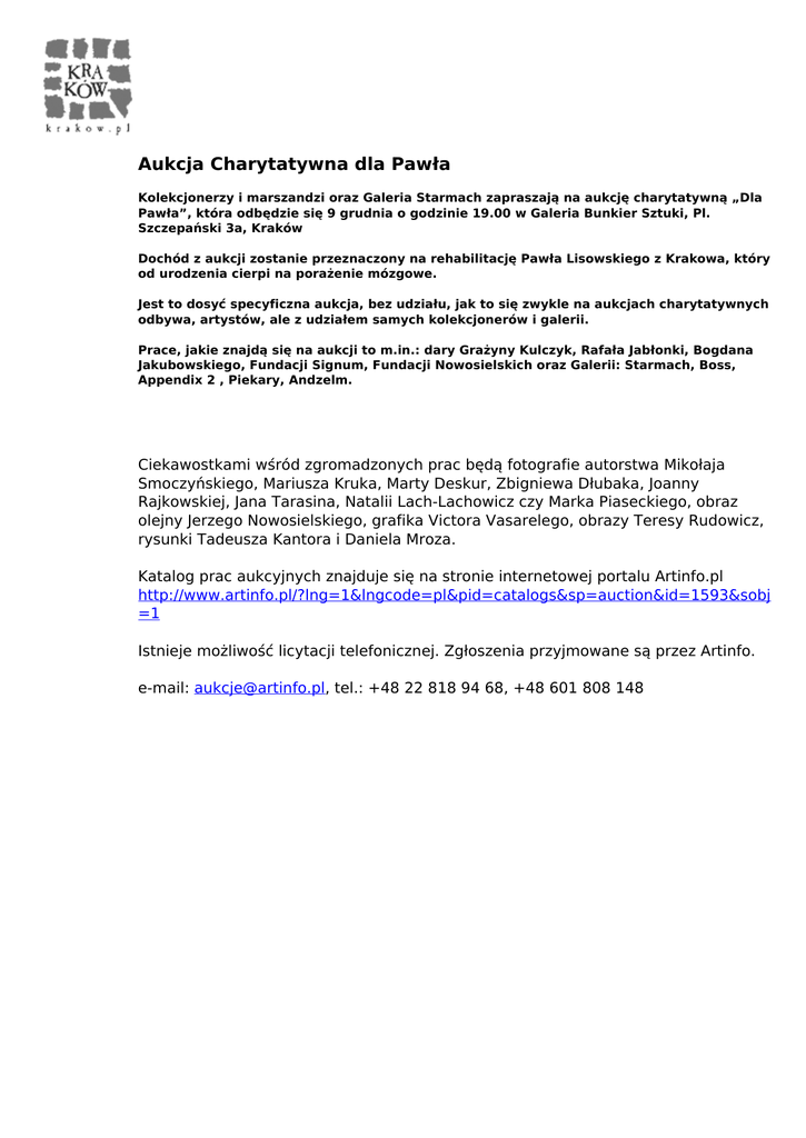 Aukcja Charytatywna dla Pawła Kolekcjonerzy i marszandzi oraz Galeria Starmach zapraszają na aukcję charytatywną „Dla Pawła”, która odbędzie się 9 grudnia o godzinie 19.00 w Galeria Bunkier Sztuki, Pl. Szczepański 3a, Kraków Dochód z aukcji zostanie przeznaczony na rehabilitację Pawła Lisowskiego z Krakowa, który od urodzenia cierpi na porażenie mózgowe. Jest to dosyć specyficzna aukcja, bez udziału, jak to się zwykle na aukcjach charytatywnych odbywa, artystów, ale z udziałem samych kolekcjonerów i galerii. Prace, jakie znajdą się na aukcji to m.in.: dary Grażyny Kulczyk, Rafała Jabłonki, Bogdana Jakubowskiego, Fundacji Signum, Fundacji Nowosielskich oraz Galerii: Starmach, Boss, Appendix 2 , Piekary, Andzelm. Ciekawostkami wśród zgromadzonych prac będą fotografie autorstwa Mikołaja Smoczyńskiego, Mariusza Kruka, Marty Deskur, Zbigniewa Dłubaka, Joanny Rajkowskiej, Jana Tarasina, Natalii Lach-Lachowicz czy Marka Piaseckiego, obraz olejny Jerzego Nowosielskiego, grafika Victora Vasarelego, obrazy Teresy Rudowicz, rysunki Tadeusza Kantora i Daniela Mroza. Katalog prac aukcyjnych znajduje się na stronie internetowej portalu Artinfo.pl http://www.artinfo.pl/?lng=1&lngcode=pl&pid=catalogs&sp=auction&id=1593&sobj =1 Istnieje możliwość licytacji telefonicznej. Zgłoszenia przyjmowane są przez Artinfo. e-mail: [email protected], tel.: +48 22 818 94 68, +48 601 808 148 Powered by TCPDF (www.tcpdf.org)