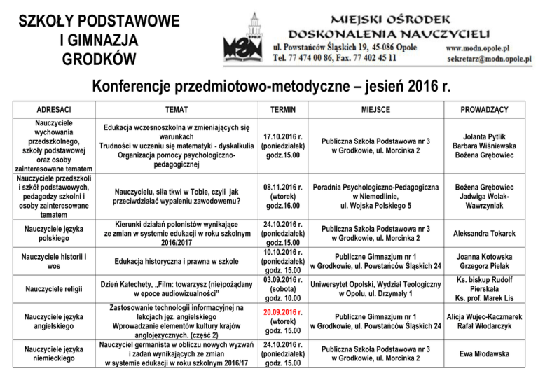 SZKOŁY PODSTAWOWE I GIMNAZJA GRODKÓW Konferencje przedmiotowo-metodyczne – jesień 2016 r. ADRESACI TEMAT TERMIN MIEJSCE PROWADZĄCY Nauczyciele Edukacja wczesnoszkolna w zmieniających się wychowania warunkach 17.10.2016 r. Jolanta Pytlik przedszkolnego, Publiczna Szkoła Podstawowa nr 3 Trudności w uczeniu się matematyki - dyskalkulia (poniedziałek) Barbara Wiśniewska szkoły podstawowej w Grodkowie, ul. Morcinka 2 Organizacja pomocy psychologicznogodz.15.00 Bożena Grębowiec oraz osoby pedagogicznej zainteresowane tematem Nauczyciele przedszkoli i szkół podstawowych, 08.11.2016 r. Poradnia Psychologiczno-Pedagogiczna Bożena Grębowiec Nauczycielu, siła tkwi w Tobie, czyli jak pedagodzy szkolni i (wtorek) w Niemodlinie, Jadwiga Wolakprzeciwdziałać wypaleniu zawodowemu? osoby zainteresowane godz.16.00 ul. Wojska Polskiego 5 Wawrzyniak tematem Kierunki działań polonistów wynikające 24.10.2016 r. Nauczyciele języka Publiczna Szkoła Podstawowa nr 3 ze zmian w systemie edukacji w roku szkolnym (poniedziałek) Aleksandra Tokarek polskiego w Grodkowie, ul. Morcinka 2 2016/2017 godz.15.00 10.10.2016 r. Nauczyciele historii i Publiczne Gimnazjum nr 1 Joanna Kotowska Edukacja historyczna i prawna w szkole (poniedziałek) wos w Grodkowie, ul. Powstańców Śląskich 24 Grzegorz Pielak godz. 15.00 03.09.2016 r. Ks. biskup Rudolf Dzień Katechety, „Film: towarzysz (nie)pożądany Uniwersytet Opolski, Wydział Teologiczny Nauczyciele religii (sobota) Pierskała w epoce audiowizualności” w Opolu, ul. Drzymały 1 godz. 10.00 Ks. prof. Marek Lis Zastosowanie technologii informacyjnej na 20.09.2016 r. Nauczyciele języka lekcjach jęz. angielskiego Publiczne Gimnazjum nr 1 Alicja Wujec-Kaczmarek (wtorek) angielskiego Wprowadzanie elementów kultury krajów w Grodkowie, ul. Powstańców Śląskich 24 Rafał Włodarczyk godz. 15.00 anglojęzycznych. (część 2) Nauczyciel germanista w obliczu nowych wyzwań 24.10.2016 r. Nauczyciele języka Publiczna Szkoła Podstawowa nr 3 i zadań wynikających ze zmian (poniedziałek) Ewa Młodawska niemieckiego w Grodkowie, ul. Morcinka 2 w systemie edukacji w roku szkolnym 2016/17 godz. 15.00 Nauczyciele matematyki Rola i wykorzystanie gier dydaktycznych w edukacji matematycznej 19.09.2016 r. Publiczne Gimnazjum nr 1 (poniedziałek) w Grodkowie, ul. Powstańców Śląskich 24 godz. 15.00 Lucyna Gruca Nauczyciele zajęć komputerowych Założenia metodyczno-koncepcyjne alternatywnych zajęć lekcyjnych Założenia edukacji komputerowej 26.09.2016 r. Publiczne Gimnazjum nr 1 (poniedziałek) w Grodkowie, ul. Powstańców Śląskich 24 godz. 15.00 Sławomir Górniak Nauczyciele informatyki Założenia metodyczno-koncepcyjne alternatywnych zajęć lekcyjnych Założenia edukacji informatycznej 26.09.2016 r. Publiczne Gimnazjum nr 1 (poniedziałek) w Grodkowie, ul. Powstańców Śląskich 24 godz. 15.00 Sławomir Górniak Nauczyciele przyrody Założenia metodyczno-koncepcyjne alternatywnych zajęć lekcyjnych Założenia edukacji przyrodniczej 26.09.2016 r. Publiczne Gimnazjum nr 1 (poniedziałek) w Grodkowie, ul. Powstańców Śląskich 24 godz. 15.00 dr Józef Szewczyk Jolanta Siemieniuk Helena Jasińska Nauczyciele geografii Założenia metodyczno-koncepcyjne alternatywnych zajęć lekcyjnych Założenia edukacji geograficznej 26.09.2016 r. Publiczne Gimnazjum nr 1 (poniedziałek) w Grodkowie, ul. Powstańców Śląskich 24 godz. 15.00 Jolanta Siemieniuk Nauczyciele biologii Założenia metodyczno-koncepcyjne alternatywnych zajęć lekcyjnych Założenia edukacji biologicznej 26.09.2016 r. Publiczne Gimnazjum nr 1 (poniedziałek) w Grodkowie, ul. Powstańców Śląskich 24 godz. 15.00 dr Józef Szewczyk Helena Jasińska 10.10.2016 r. Nauczyciele Żeby chciało się chcieć – jak zwiększyć motywację Publiczne Gimnazjum nr 1 (poniedziałek) wychowania fizycznego i świadomość potrzeby ruchu w Grodkowie, ul. Powstańców Śląskich 24 godz. 15.00 Katarzyna Miernicka Nauczyciele szkolnictwa ogólnodostępnego oraz kształcenia specjalnego Wiesława Waloszek Nauczyciele bibliotekarze i osoby zainteresowane tematem Doradcy zawodowi lub osoby realizujące zadania z zakresu doradztwa zawodowego w gimnazjum Nowe tendencje związane z edukacją uczniów posiadających orzeczenie do kształcenia specjalnego Kultura czytelnictwa młodego pokolenia wobec wyzwań współczesnej komunikacji Biblioteka – nowe zadania, nowe perspektywy Kierunki działań szkolnych doradców zawodowych w roku szkolnym 2016/2017 19.09.2016 r. Publiczne Gimnazjum nr 1 (poniedziałek) w Grodkowie, ul. Powstańców Śląskich 24 godz. 15.00 29.09.2016 r. (czwartek) godz. 9.30 24.10.2016 r. (poniedziałek) godz. 15.00 Centrum Nauk Przyrodniczych, MODN w Opolu, ul. Powstańców Śląskich 19 Publiczna Szkoła Podstawowa nr 3 w Grodkowie, ul. Morcinka 2 10.10.2016 r. Publiczne Gimnazjum nr 1 (poniedziałek) w Grodkowie, ul. Powstańców Śląskich 24 godz. 15.00 Barbara Błyszczakowska Edyta Ciecierska