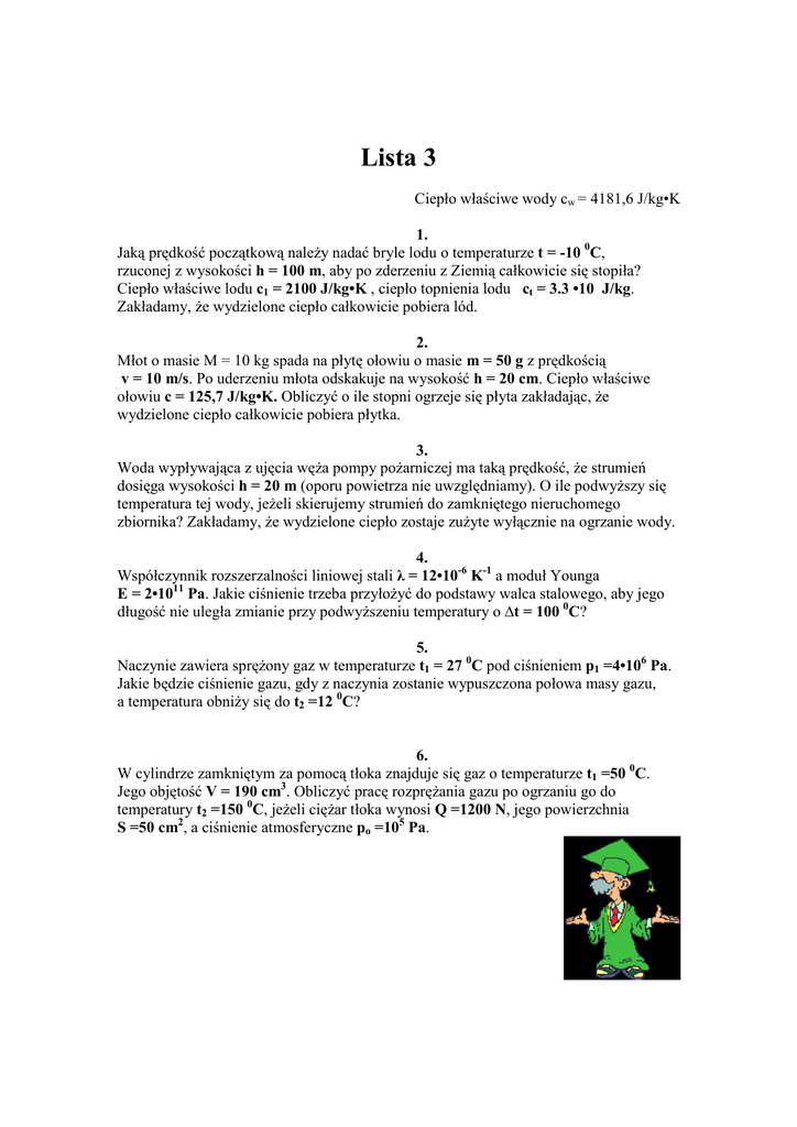 Lista 3 Ciepło właściwe wody cw = 4181,6 J/kg•K 1. Jaką prędkość początkową naleŜy nadać bryle lodu o temperaturze t = -10 0C, rzuconej z wysokości h = 100 m, aby po zderzeniu z Ziemią całkowicie się stopiła? Ciepło właściwe lodu c1 = 2100 J/kg•K , ciepło topnienia lodu ct = 3.3 •10 J/kg. Zakładamy, Ŝe wydzielone ciepło całkowicie pobiera lód. 2. Młot o masie M = 10 kg spada na płytę ołowiu o masie m = 50 g z prędkością v = 10 m/s. Po uderzeniu młota odskakuje na wysokość h = 20 cm. Ciepło właściwe ołowiu c = 125,7 J/kg•K. Obliczyć o ile stopni ogrzeje się płyta zakładając, Ŝe wydzielone ciepło całkowicie pobiera płytka. 3. Woda wypływająca z ujęcia węŜa pompy poŜarniczej ma taką prędkość, Ŝe strumień dosięga wysokości h = 20 m (oporu powietrza nie uwzględniamy). O ile podwyŜszy się temperatura tej wody, jeŜeli skierujemy strumień do zamkniętego nieruchomego zbiornika? Zakładamy, Ŝe wydzielone ciepło zostaje zuŜyte wyłącznie na ogrzanie wody. 4. Współczynnik rozszerzalności liniowej stali λ = 12•10-6 K-1 a moduł Younga E = 2•1011 Pa. Jakie ciśnienie trzeba przyłoŜyć do podstawy walca stalowego, aby jego długość nie uległa zmianie przy podwyŜszeniu temperatury o ∆t = 100 0C? 5. Naczynie zawiera spręŜony gaz w temperaturze t1 = 27 0C pod ciśnieniem p1 =4•106 Pa. Jakie będzie ciśnienie gazu, gdy z naczynia zostanie wypuszczona połowa masy gazu, a temperatura obniŜy się do t2 =12 0C? 6. W cylindrze zamkniętym za pomocą tłoka znajduje się gaz o temperaturze t1 =50 0C. Jego objętość V = 190 cm3. Obliczyć pracę rozpręŜania gazu po ogrzaniu go do temperatury t2 =150 0C, jeŜeli cięŜar tłoka wynosi Q =1200 N, jego powierzchnia S =50 cm2, a ciśnienie atmosferyczne po =105 Pa.