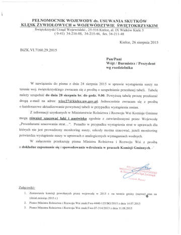 PEŁNOMOCNIK WOJEWODY ds. USUWANIA SKUTKÓW KLĘSK ŻYWIOŁOWYCH w WOJEWÓDZTWIE ŚWIĘTo1u~zYsKIM Świętokrzyski Urząd Wojewódzki, 25-516 Kielce, al. IX Wieków Kielc 3 (0-41) 34-216-88, 34-215-46, fax. 34-211-48 Kielce, 26 sierpnia 2015 BiZK.VI.7 160.29.2015 Pan/Pani Wójt / Burmistrz I Prezydent wg rozdzielnika W nawiązaniu do pisma z dnia 24 sierpnia 2015 w sprawie wystąpienia suszy na terenie woj. świętokrzyskiego zwracam się z prośbą o uzupełnianie przesłanej tabeli. Tabelę należy uzupełnić do dnia 28 sierpnia br. do godz. 9.00. Powyższą tabelę proszę przekazać drogą e-mail na adres: wioc27(~1deIce.uw.2ov.p1. Jednocześnie zwracam się z prośbą o każdorazowe aktualizowanie powyższej tabeli w przypadku wystąpienia zmian. Z informacji uzyskanych w Ministerstwie Rolnictwa i Rozwoju Wsi Komisje Gminne mogą również szacować h~ki i pastwiska zgodnie z zatwierdzonymi przez Wojewodę „Procedurami szacowania strat. ..„. Ponadto w przypadku wystąpienia strat w uprawach dla których nie jest prowadzony monitoring suszy, szkody można szacować, jeżeli monitoring potwierdza wystąpienie suszy w uprawach o analogicznych wymaganiach wodnych. W załączeniu przekazuję pisma Ministra Rolnictwa i Rozwoju Wsi z prośbą o dokiadne zapoznanie się i spowodowanie wdrożenia w pracach Komisji Gminnych. woJE1~j N. d~. [&szek Załączniki: 1. Zestawienie komisji powołanych przez wojewodę w 2015 r. na terenie gminy (nazwa) (dzień.miesiąc.2015 r.) 2. Pismo Ministra Rolnictwa i Rozwoju Wsi znak:Fwe-4440-125/BG 2015 z dnia 14.07.2015 3. Pismo Ministra Rolnictwa i Rozwoju Wsi znak:Fwe-07-314 2015 z dnia 11.08.2015 taii na