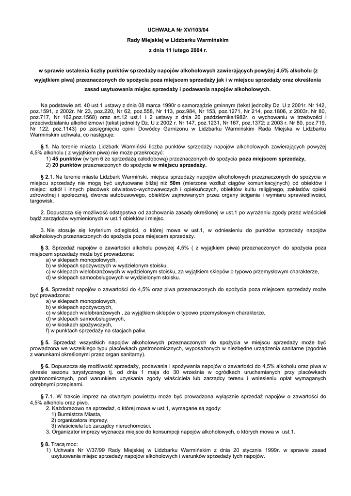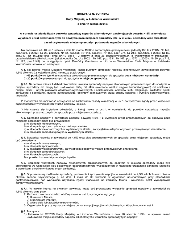 UCHWAŁA Nr XV/103/04 Rady Miejskiej w Lidzbarku Warmińskim z dnia 11 lutego 2004 r. w sprawie ustalenia liczby punktów sprzedaży napojów alkoholowych zawierających powyżej 4,5% alkoholu (z wyjątkiem piwa) przeznaczonych do spożycia poza miejscem sprzedaży jak i w miejscu sprzedaży oraz określenia zasad usytuowania miejsc sprzedaży i podawania napojów alkoholowych. Na podstawie art. 40 ust.1 ustawy z dnia 08 marca 1990r o samorządzie gminnym (tekst jednolity Dz. U z 2001r. Nr 142, poz.1591, z 2002r. Nr 23, poz.220, Nr 62, poz.558, Nr 113, poz.984, Nr 153, poz.1271, Nr 214, poz.1806, z 2003r. Nr 80, poz.717, Nr 162,poz.1568) oraz art.12 ust.1 i 2 ustawy z dnia 26 października1982r. o wychowaniu w trzeźwości i przeciwdziałaniu alkoholizmowi (tekst jednolity Dz. U z 2002 r. Nr 147, poz.1231, Nr 167, poz.1372; z 2003 r. Nr 80, poz.719, Nr 122, poz.1143) po zasięgnięciu opinii Dowódcy Garnizonu w Lidzbarku Warmińskim Rada Miejska w Lidzbarku Warmińskim uchwala, co następuje: § 1. Na terenie miasta Lidzbark Warmiński liczba punktów sprzedaży napojów alkoholowych zawierających powyżej 4,5% alkoholu ( z wyjątkiem piwa) nie może przekroczyć: 1) 45 punktów (w tym 6 ze sprzedażą całodobową) przeznaczonych do spożycia poza miejscem sprzedaży, 2) 20 punktów przeznaczonych do spożycia w miejscu sprzedaży. § 2.1. Na terenie miasta Lidzbark Warmiński, miejsca sprzedaży napojów alkoholowych przeznaczonych do spożycia w miejscu sprzedaży nie mogą być usytuowane bliżej niż 50m (mierzone wzdłuż ciągów komunikacyjnych) od obiektów i miejsc: szkół i innych placówek oświatowo-wychowawczych i opiekuńczych, obiektów kultu religijnego, zakładów opieki zdrowotnej i społecznej, dworca autobusowego, obiektów zajmowanych przez organy ścigania i wymiaru sprawiedliwości, targowisk. 2. Dopuszcza się możliwość odstępstwa od zachowania zasady określonej w ust.1 po wyrażeniu zgody przez właścicieli bądź zarządców wymienionych w ust.1 obiektów i miejsc. 3. Nie stosuje się kryterium odległości, o której mowa w ust.1, w odniesieniu do punktów sprzedaży napojów alkoholowych przeznaczonych do spożycia poza miejscem sprzedaży. § 3. Sprzedaż napojów o zawartości alkoholu powyżej 4,5% ( z wyjątkiem piwa) przeznaczonych do spożycia poza miejscem sprzedaży może być prowadzona: a) w sklepach monopolowych, b) w sklepach spożywczych w wydzielonym stoisku, c) w sklepach wielobranżowych w wydzielonym stoisku, za wyjątkiem sklepów o typowo przemysłowym charakterze, d) w sklepach samoobsługowych w wydzielonym stoisku. § 4. Sprzedaż napojów o zawartości do 4,5% oraz piwa przeznaczonych do spożycia poza miejscem sprzedaży może być prowadzona: a) w sklepach monopolowych, b) w sklepach spożywczych, c) w sklepach wielobranżowych , za wyjątkiem sklepów o typowo przemysłowym charakterze, d) w sklepach samoobsługowych, e) w kioskach spożywczych, f) w punktach sprzedaży na stacjach paliw. § 5. Sprzedaż wszystkich napojów alkoholowych przeznaczonych do spożycia w miejscu sprzedaży może być prowadzona we wszelkiego typu placówkach gastronomicznych, wyposażonych w niezbędne urządzenia sanitarne (zgodnie z warunkami określonymi przez organ sanitarny). § 6. Dopuszcza się możliwość sprzedaży, podawania i spożywania napojów o zawartości do 4,5% alkoholu oraz piwa w okresie sezonu turystycznego tj. od dnia 1 maja do 30 września w ogródkach uruchamianych przy placówkach gastronomicznych, pod warunkiem uzyskania zgody właściciela lub zarządcy terenu i wniesieniu opłat wymaganych odrębnymi przepisami. § 7.1. W trakcie imprez na otwartym powietrzu może być prowadzona wyłącznie sprzedaż napojów o zawartości do 4,5% alkoholu oraz piwo. 2. Każdorazowo na sprzedaż, o której mowa w ust.1, wymagane są zgody: 1) Burmistrza Miasta, 2) organizatora imprezy, 3) właściciela lub zarządcy nieruchomości. 3. Organizator imprezy wyznacza miejsce do konsumpcji napojów alkoholowych, o których mowa w ust.1. § 8. Tracą moc: 1) Uchwała Nr V/37/99 Rady Miejskiej w Lidzbarku Warmińskim z dnia 20 stycznia 1999r. w sprawie zasad usytuowania miejsc sprzedaży napojów alkoholowych i warunków sprzedaży tych napojów. 2) Uchwała Nr VII/56/99 Rady Miejskiej w Lidzbarku Warmińskim z dnia 04 marca 1999r. w sprawie zmiany uchwały określającej zasady usytuowania miejsc sprzedaży napojów alkoholowych i warunki sprzedaży tych napojów. 3) Uchwała Nr XVI/123/2000 Rady Miejskiej w Lidzbarku Warmińskim z dnia 15 lutego 2000r. w sprawie ustalenia szczegółowych zasad wydawania i cofania zezwoleń na prowadzenie sprzedaży napojów alkoholowych. 4) Uchwała Nr XL/286/2002 Rady Miejskiej w Lidzbarku Warmińskim z dnia 22 maja 2002r. w sprawie ustalenia dla terenu miasta Lidzbark Warmiński liczby punktów sprzedaży napojów o zawartości powyżej 4,5% alkoholu (z wyjątkiem piwa) przeznaczonych do spożycia poza miejscem sprzedaży jak i w miejscu sprzedaży. § 9. Wykonanie uchwały powierza się Burmistrzowi. § 10. Uchwała wchodzi w życie po upływie 14 dni od ogłoszenia w Dzienniku Urzędowym Województwa WarmińskoMazurskiego.