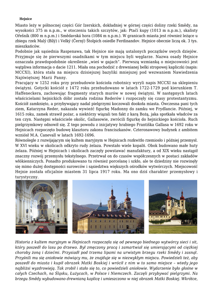 Hejnice Miasto leży w północnej części Gór Izerskich, dokładniej w górnej części doliny rzeki Smědy, na wysokości 375 m n.p.m., w otoczeniu takich szczytów, jak: Ptačí kupy (1013 m n.p.m.), skalisty Ořešník (800 m n.p.m.) i Smědavská hora (1084 m n.p.m.). W granicach miasta jest również leżące u zbiegu rzek Malý (Bílý) i Velký (Černý) Štolpich osiedle Ferdinandov. Hejnice obecnie liczą ok. 3 tys. mieszkańców. Podobnie jak sąsiednia Raspenawa, tak Hejnice nie mają ustalonych początków swych dziejów. Przyjmuje się że pierwszymi osadnikami w tym miejscu byli węglarze. Nazwa osady Hejnice oznaczała prawdopodobnie określenie „wieś w gajach”. Pierwszą wzmianką o miejscowości jest wątpliwa informacja o dacie 1211. Miała ona pochodzić z drewnianej belki stropowej kapliczki (napis: MCCXI), która stała na miejscu dzisiejszej bazyliki mniejszej pod wezwaniem Nawiedzenia Najświętszej Marii Panny. Pracujący w 1252 roku przy przebudowie kościoła robotnicy wyryli napis MCCXI na sklepieniu świątyni. Gotycki kościół z 1472 roku przebudowano w latach 1722-1729 pod kierunkiem T. Haffeneckera, zachowując fragmenty starych murów w nowej świątyni. W następnych latach właścicielami hejnickich dóbr została rodzina Rederów i rozpoczęły się czasy protestantyzmu. Kościół zamknięto, a przybywający nadal pielgrzymi koczowali dookoła miasta. Ówczesna pani tych ziem, Katarzyna Reder, nakazała wywieźć figurkę Madonny do zamku we Frydlancie. Później, w 1615 roku, zamek strawił pożar, a niektórzy wiązali ten fakt z karą Bożą, jaka spotkała władców za ten czyn. Następni właściciele okolic, Gallasowie, zwrócili figurkę do hejnickiego kościoła. Ruch pielgrzymkowy odnowił się. Z tego powodu z inicjatywy hrabiego Františka Gallasa w 1692 roku w Hejnicach rozpoczęto budowę klasztoru zakonu franciszkanów. Czteronawowy budynek z ambitem wzniósł M.A. Canevall w latach 1692-1696. Równolegle z rozwijającym się kultem maryjnym w Hejnicach rozkwitło rzemiosło i później przemysł. W XVI wieku w okolicach odkryto rudy żelaza. Powstało wiele kopalń. Obok budowano małe huty żelaza. Później w Hejnicach i okolicach zaczęły powstawać manufaktury, a od XIX wieku nastąpił znaczny rozwój przemysłu tekstylnego. Przetrwał on do czasów współczesnych w postaci zakładów włókienniczych. Ponadto produkowano tu również porcelanę i szkło, ale te dziedziny nie rozwinęły się mimo dużej dostępności surowców i sąsiedztwa większych ośrodków wytwórczych. Miejscowość Hejnie została oficjalnie miastem 31 lipca 1917 roku. Ma ono dziś charakter przemysłowy i turystyczny. Historia z kultem maryjnym w Hejnicach rozpoczęła się od pewnego biednego wytwórcy sieci i sit, który poszedł do lasu po drzewo. Był zmęczony pracą i zamartwiał się umierającymi od ciężkiej choroby żoną i dziećmi. Przysiadł pod trzema lipami na urwistym brzegu rzeki Smědy i zasnął. Przyśnili mu się aniołowie mówiący mu, że znajduje się w niezwykłym miejscu. Powiedzieli też, aby poszedł do miasta i kupił obrazek Matki Boskiej i wrócił z nim w to samo miejsce – wtedy jego najbliżsi wyzdrowieją. Tak zrobił i stało się to, co powiedzieli aniołowie. Wydarzenie było głośne w całych Czechach, na Śląsku, Łużycach, w Polsce i Niemczech. Zaczęli przybywać pielgrzymi. Na brzegu Smědy wybudowano drewnianą kaplicę i umieszczono w niej obrazek Matki Boskiej. Wkrótce, bo już w 1352 roku, wybudowano kamienny kościół. Pierwotny obrazek zastąpiono figurką Madonny, zwaną „Śliczną Matką”. link do strony głównej miasta Hejnice www.mestohejnice.cz