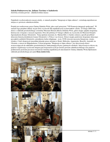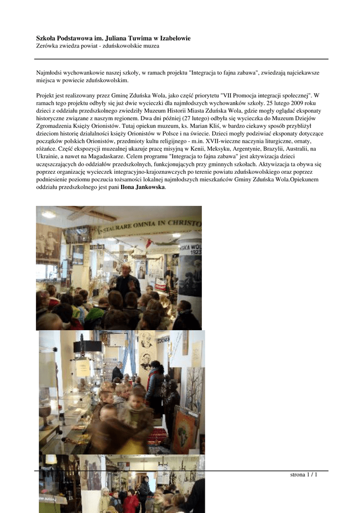 Szkoła Podstawowa im. Juliana Tuwima w Izabelowie Zerówka zwiedza powiat - zduńskowolskie muzea Najmłodsi wychowankowie naszej szkoły, w ramach projektu "Integracja to fajna zabawa", zwiedzają najciekawsze miejsca w powiecie zduńskowolskim. Projekt jest realizowany przez Gminę Zduńska Wola, jako część priorytetu "VII Promocja integracji społecznej". W ramach tego projektu odbyły się już dwie wycieczki dla najmłodszych wychowanków szkoły. 25 lutego 2009 roku dzieci z oddziału przedszkolnego zwiedziły Muzeum Historii Miasta Zduńska Wola, gdzie mogły oglądać eksponaty historyczne związane z naszym regionem. Dwa dni później (27 lutego) odbyła się wycieczka do Muzeum Dziejów Zgromadzenia Księży Orionistów. Tutaj opiekun muzeum, ks. Marian Kliś, w bardzo ciekawy sposób przybliżył dzieciom historię działalności księży Orionistów w Polsce i na świecie. Dzieci mogły podziwiać eksponaty dotyczące początków polskich Orionistów, przedmioty kultu religijnego - m.in. XVII-wieczne naczynia liturgiczne, ornaty, różańce. Część ekspozycji muzealnej ukazuje pracę misyjną w Kenii, Meksyku, Argentynie, Brazylii, Australii, na Ukrainie, a nawet na Magadaskarze. Celem programu "Integracja to fajna zabawa" jest aktywizacja dzieci uczęszczających do oddziałów przedszkolnych, funkcjonujących przy gminnych szkołach. Aktywizacja ta obywa się poprzez organizację wycieczek integracyjno-krajoznawczych po terenie powiatu zduńskowolskiego oraz poprzez podniesienie poziomu poczucia tożsamości lokalnej najmłodszych mieszkańców Gminy Zduńska Wola.Opiekunem oddziału przedszkolnego jest pani Ilona Jankowska. strona 1 / 1