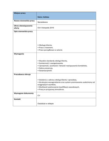 Miejsce pracy Salon Adidas Nazwa stanowiska pracy Okres obowiązywania oferty Sprzedawca Od 4 listopada 2016 Opis stanowiska pracy • Obsługa klienta, • Praca z towarem, • Prace porządkowe w salonie. Wymagania • Wysokie standardy obsługi klienta, • Sumienność i zaangażowanie, • Uprzejmość, życzliwość i łatwość nawiązywania kontaktów, • Dobra prezencja, • Dyspozycyjność. Pracodawca oferuje • Szkolenia z zakresu obsługi klienta i sprzedaży, • Atrakcyjne wynagrodzenie oraz system premiowania uzależniony od osiągniętych wyników, • Możliwość podnoszenia kwalifikacji zawodowych, • Pracę w przyjaznej atmosferze. Wymagane dokumenty CV Kontakt Osobiście w sklepie