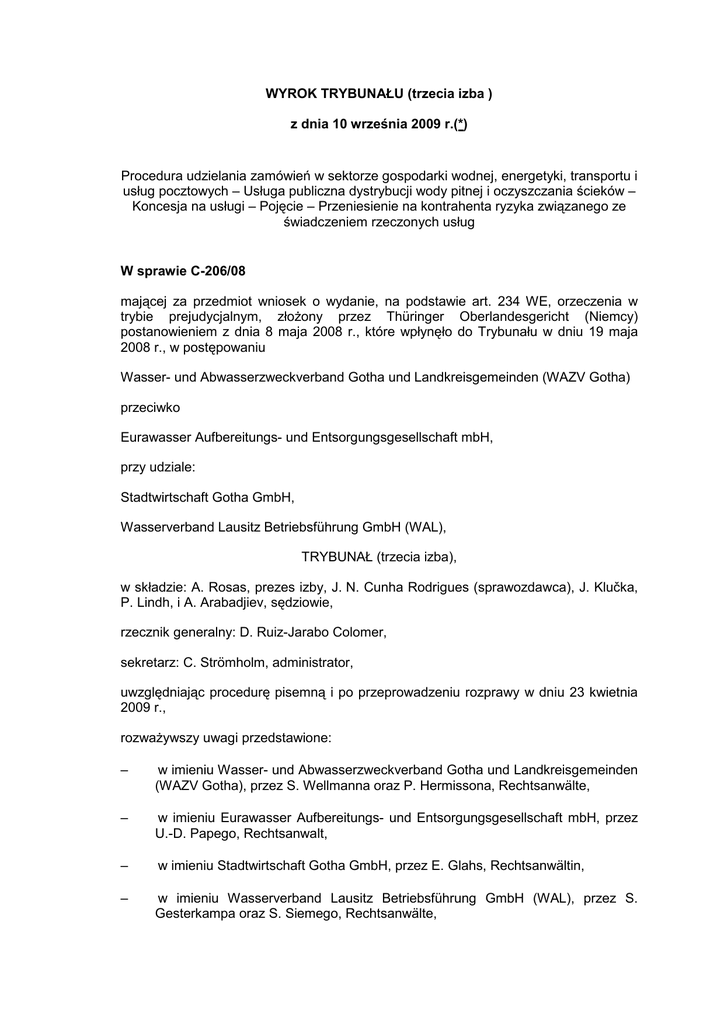 WYROK TRYBUNAŁU (trzecia izba ) z dnia 10 września 2009 r.(*) Procedura udzielania zamówień w sektorze gospodarki wodnej, energetyki, transportu i usług pocztowych – Usługa publiczna dystrybucji wody pitnej i oczyszczania ścieków – Koncesja na usługi – Pojęcie – Przeniesienie na kontrahenta ryzyka związanego ze świadczeniem rzeczonych usług W sprawie C-206/08 mającej za przedmiot wniosek o wydanie, na podstawie art. 234 WE, orzeczenia w trybie prejudycjalnym, złożony przez Thüringer Oberlandesgericht (Niemcy) postanowieniem z dnia 8 maja 2008 r., które wpłynęło do Trybunału w dniu 19 maja 2008 r., w postępowaniu Wasser- und Abwasserzweckverband Gotha und Landkreisgemeinden (WAZV Gotha) przeciwko Eurawasser Aufbereitungs- und Entsorgungsgesellschaft mbH, przy udziale: Stadtwirtschaft Gotha GmbH, Wasserverband Lausitz Betriebsführung GmbH (WAL), TRYBUNAŁ (trzecia izba), w składzie: A. Rosas, prezes izby, J. N. Cunha Rodrigues (sprawozdawca), J. Klučka, P. Lindh, i A. Arabadjiev, sędziowie, rzecznik generalny: D. Ruiz-Jarabo Colomer, sekretarz: C. Strömholm, administrator, uwzględniając procedurę pisemną i po przeprowadzeniu rozprawy w dniu 23 kwietnia 2009 r., rozważywszy uwagi przedstawione: – w imieniu Wasser- und Abwasserzweckverband Gotha und Landkreisgemeinden (WAZV Gotha), przez S. Wellmanna oraz P. Hermissona, Rechtsanwälte, – w imieniu Eurawasser Aufbereitungs- und Entsorgungsgesellschaft mbH, przez U.-D. Papego, Rechtsanwalt, – w imieniu Stadtwirtschaft Gotha GmbH, przez E. Glahs, Rechtsanwältin, – w imieniu Wasserverband Lausitz Betriebsführung GmbH (WAL), przez S. Gesterkampa oraz S. Siemego, Rechtsanwälte, – w imieniu rządu niemieckiego, przez M. Lummę oraz J. Möllera, działających w charakterze pełnomocników, – w imieniu rządu czeskiego, przez M. Smolka, działającego w charakterze pełnomocnika, – w imieniu Komisji Wspólnot Europejskich, przez P. Olivera, D. Kukovca oraz C. Zadrę, działających w charakterze pełnomocników, wspieranych przez B. Wägenbaura, Rechtsanwalt, podjąwszy, po wysłuchaniu rzecznika generalnego, decyzję o rozstrzygnięciu sprawy bez opinii, wydaje następujący Wyrok 1 Wniosek o wydanie orzeczenia w trybie prejudycjalnym dotyczy wykładni pojęcia „koncesja na usługi” w rozumieniu dyrektywy 2004/17/WE Parlamentu Europejskiego i Rady z dnia 31 marca 2004 r. koordynującej procedury udzielania zamówień przez podmioty działające w sektorach gospodarki wodnej, energetyki, transportu i usług pocztowych (Dz.U. L 134, s. 1). 2 Wniosek ten został przedstawiony w ramach sporu pomiędzy Wasser- und Abwasserzweckverband Gotha und Landeskreisgemeinden (grupa dystrybucji wody i odprowadzania ścieków w mieście Gotha oraz gmin należących do jego obszaru administracyjnego, zwana dalej „WAZV Gotha”) a Eurawasser Aufbereitungs- und Entsorgungsgesellschaft mbH (przedsiębiorstwo oczyszczania i odprowadzania wody, zwane dalej „Eurawasser”) w przedmiocie przyznania publicznej usługi dystrybucji wody pitnej i odprowadzania ścieków. Ramy prawne 3 Artykuł 1 ust. 2 lit. a) i d) dyrektywy 2004/17 stanowi: „2. a) »Zamówienia na dostawy, roboty budowlane i usługi« oznaczają odpłatne umowy zawarte na piśmie pomiędzy jednym lub wieloma podmiotami zamawiającymi, wymienionymi w art. 2 ust. 2, oraz jednym lub wieloma przedsiębiorcami budowlanymi, dostawcami, lub usługodawcami. […] d) "Zamówienia na usługi" oznaczają zamówienia inne niż zamówienia na roboty budowlane lub dostawy, których przedmiotem jest świadczenie usług wymienionych w załączniku XVII. […]” 4 Artykuł 1 ust. 3 lit. b) tej dyrektywy stanowi: „»Koncesja na usługi« oznacza umowę tego samego rodzaju jak zamówienie na usługi, z wyjątkiem faktu, że wynagrodzenie za świadczenie usług obejmuje wyłącznie prawo do korzystania z usług, albo takie prawo wraz z płatnością.” 5 W świetle art. 2 rzeczonej dyrektywy: 1. Do celów niniejszej dyrektywy, a) „instytucje zamawiające” oznaczają państwo, jednostki samorządu terytorialnego, podmioty prawa publicznego, związki złożone z jednej lub wielu takich jednostek lub z jednego lub wielu podmiotów prawa publicznego. […] 2. Niniejsza dyrektywa dotyczy podmiotów zamawiających: a) będących instytucjami zamawiającymi lub przedsiębiorstwami publicznymi oraz prowadzących jeden z rodzajów działalności wymienionych w art. 3–7; […]” 6 Artykuł 4 dyrektywy 2004/17 stanowi: „1. Niniejsza dyrektywa dotyczy następujących rodzajów działalności: a) dostarczanie lub obsługa stałych sieci przeznaczonych do świadczenia usług dla odbiorców publicznych w związku z produkcją, transportem lub dystrybucją wody pitnej; lub b) dostawy wody pitnej do takich sieci. 2. Niniejsza dyrektywa dotyczy również zamówień lub konkursów, udzielanych lub organizowanych przez podmioty, które wykonują rodzaje działalności wymienione w ust. 1 oraz które: […] b) są związane z odprowadzaniem lub oczyszczaniem ścieków. ” 7 Artykuł 18 tej dyrektywy stanowi: „Niniejsza dyrektywa nie ma zastosowania do koncesji na roboty budowlane i usługi, które są udzielane przez podmioty zamawiające prowadzące jedną lub kilka działalności wymienionych w art. 3–7, jeżeli wspomniane koncesje przyznawane są w celu prowadzenia tych działalności.” 8 W świetle art. 31 rzeczonej dyrektywy: „Zamówienia, których przedmiotem są usługi wymienione w załączniku XVII A, są udzielane zgodnie z przepisami art. 34–59.” 9 Artykuł 32 tejże dyrektywy stanowi: „Do zamówień, których przedmiotem są usługi wymienione w załączniku XVII B, mają zastosowanie wyłącznie przepisy art. 34 i 43.” 10 Zgodnie z art. 71 dyrektywy 2004/17 państwa członkowskie wprowadzają w życie przepisy niezbędne do wykonania dyrektywy nie później niż do dnia 31 stycznia 2006 r. Postępowanie przed sądem krajowym i pytania preju