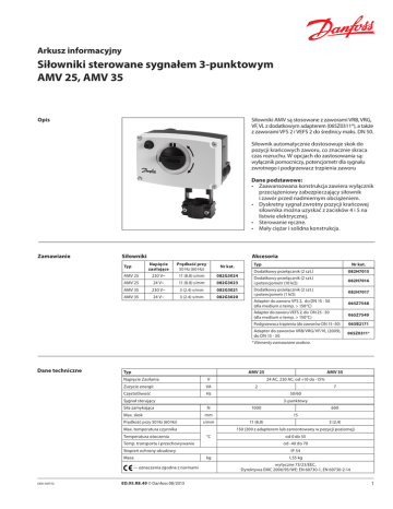 Arkusz informacyjny Siłowniki sterowane sygnałem 3-punktowym AMV 25, AMV 35 Opis Siłowniki AMV są stosowane z zaworami VRB, VRG, VF, VL z dodatkowym adapterem (065Z0311*), a także z zaworami VFS 2 i VEFS 2 do średnicy maks. DN 50. Siłownik automatycznie dostosowuje skok do pozycji krańcowych zaworu, co znacznie skraca czas rozruchu. W opcjach do zastosowania są: wyłącznik pomocniczy, potencjometr dla sygnału zwrotnego i podgrzewacz trzpienia zaworu Dane podstawowe: • Zaawansowana konstrukcja zawiera wyłącznik przeciążeniowy zabezpieczający siłownik i zawór przed nadmiernym obciążeniem. • Dyskretny sygnał zwrotny pozycji krańcowej siłownika można uzyskać z zacisków 4 i 5 na listwie elektrycznej. • Sterowanie ręczne. • Mały ciężar i solidna konstrukcja. Zamawianie Siłowniki Akcesoria Napięcie zasilające Prędkość przy 50 Hz (60 Hz) AMV 25 230 V~ 11 (8.8) s/mm 082G3024 AMV 25 24 V~ 11 (8.8) s/mm 082G3023 AMV 35 230 V~ 3 (2.4) s/mm 082G3021 AMV 35 24 V~ 3 (2.4) s/mm 082G3020 Typ Typ Nr kat. Nr kat. Dodatkowy przełącznik (2 szt.) 082H7015 Dodatkowy przełącznik (2 szt.) i potencjometr (10 kΩ) 082H7016 Dodatkowy przełącznik (2 szt.) i potencjometr (1 kΩ) 082H7017 Adapter do zaworu VFS 2, do DN 15 - 50 (dla medium o temp. > 150°C) 065Z7548 Adapter do zaworu VEFS 2, do DN 25 - 50 (dla medium o temp. > 150°C) 065Z7549 Podgrzewacz trzpienia (do zaworów DN 15–50) 065B2171 Adapter do zaworów VRB/VRG/VF/VL (2009), do DN 15 - 50 065Z0311* * Elementy zamawiane osobno. Dane techniczne Typ AMV 25 Napięcie Zasilania V Zużycie energii VA Częstotliwość Hz 2 Max. skok Prędkość przy 50 Hz (60 Hz) 3-punktowy N s/mm °C DEN-SMT/SI ED.95.R8.49 © Danfoss 08/2013 11 (8,8) 3 (2,4) od 0 do 55 od -40 do 70 Stopień ochrony obudowy — oznaczenia zgodne z normami 600 15 150 (200 z adapterem lub zamontowany w pozycji poziomej) Temp. transportu i przechowywania Masa 1000 mm Max. temperatura czynnika Temperatura otoczenia 7 50/60 Sygnał sterujący Siła zamykająca AMV 35 24 AC, 230 AC; od +10 do -15% IP 54 kg 1,55 kg wytyczne 73/23/EEC, Dyrektywa EMC 2006/95/WE: EN 60730-1, EN 60730-2-14 1 Arkusz informacyjny Montaż Siłowniki sterowane sygnałem 3-punktowym AMV 25, AMV 35 Tmax. ≤ 150°C w przypadku siłowników AMV 25 i AMV 35 Tmax. = od 150°C do 200°C w przypadku siłowników AMV 25 i AMV 35 Adapter do zaworu VFS, od DN 15 do DN 50 ≈5o Mechaniczny Siłownik powinien być zamontowany tak, aby trzpień zaworu był skierowany do góry lub poziomo. Do zamocowania siłownika używa się klucza imbusowego 4 mm (nie jest na wyposażeniu). Należy zostawić wolną przestrzeń wokół siłownika w celu swobodnego dostępu podczas prac serwisowych. ≈5o Elektryczny Podłączenia elektryczne są możliwe po zdjęciu pokrywy siłownika. Dwa przepusty kablowe M16 x 1,5 w zestawie. Jednak w przypadku potrzeby uzyskania właściwego stopnia ochrony obudowy IP należy zastosować odpowiednie dławiki kablowe. W czasie uruchomienia należy zaznaczyć czerwoną i niebieską zatyczką (na wyposażeniu) pozycje pełnego otwarcia i zamknięcia zaworu. Złomowanie Przed złomowaniem siłownik należy rozłożyć na części i posortować na różne grupy materiałowe. 2 ED.95.R8.49 © Danfoss 08/2013 DEN-SMT/SI Arkusz informacyjny Siłowniki sterowane sygnałem 3-punktowym AMV 25, AMV 35 Podłączenia elektryczne Zaciski 1, 3: Sygnał sterujący z regulatora. Napięcie zasilania: 24 VAC lub 230 VAC (w zależności od typu) Zaciski 4, 5: Wyjście służące do sygnalizacji pozycji lub do monitoringu. Wersja na 230 VAC Nie wolno niczego dotykać na płytce obwodu drukowanego, gdy urządzenie jest pod napięciem! Zagrożenie życia! N Neutralny/wspólny (0 V) Akcesoria Dodatkowe przełączniki (2 szt.) 230 V Dodatkowe przełączniki (2 szt.) i potencjometr Uruchomienie Po zakończeniu montażu mechanicznego oraz elektrycznego sprawdź poprawność podłączeń i wykonaj następujące czynności: - Włączyć zasilanie. - Ustaw odpowiedni sygnał sterujący i sprawdź, czy kierunek trzpienia zaworu jest właściwy z założonym. Urządzenie jest teraz sprawdzone i gotowe do pracy. Sterowanie ręczne Sterowanie ręczne uzyskuje się przez obrót pokrętła na obudowie w żądanym kierunku. Należy zwrócić uwagę na symbole opisujące kierunek obrotu. • Odłącz zasilanie. • Naciśnij gumowy przycisk. • Ustal położenie zaworu, korzystając ze wskaźnika położenia. • Ustaw zawór w pozycji zamkniętej. • Załącz zasilanie. DEN-SMT/SI ED.95.R8.49 © Danfoss 08/2013 3 Arkusz informacyjny Siłowniki sterowane sygnałem 3-punktowym AMV 25, AMV 35 Wymiary Przedłużka trzpienia do montażu siłownika w pozycji pionowej na zaworze dla czynnika grzewczego o temp. >150°C. Kombinacje zawór — siłownik AMV 25, AMV 35 + Adapter (065Z0311) VRB 2, VRB 3 z gwintem zewn. (od DN 15 - 50) VRG 2, VRG 3 z gwintem zewn. (od DN 15 - 50) AMV 25, AMV 35 + VFS 2 (DN 15–50) VEFS 2 (DN 25–50) 4 ED.95.R8.49 AMV 25, AMV 35 + Adapter (065Z0311) VRB 2, VRB3 z gwintem wewn. (od DN 15 - 50) AMV 25, AMV 35 + Adapter (065Z0311) VF 2, VF 3 (DN 15–50) VL 2, VL 3 (DN 15–50) AMV 25, AMV 35 + VFS 2 (DN 15–50) — 200°C VEFS 2 (DN 25–50) — 200°C Produced by Danfoss A/S © 08/2013