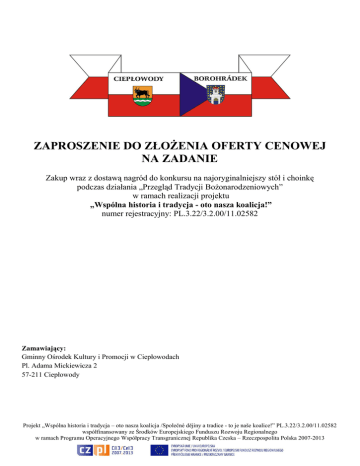 ZAPROSZENIE DO ZŁOŻENIA OFERTY CENOWEJ NA ZADANIE Zakup wraz z dostawą nagród do konkursu na najoryginalniejszy stół i choinkę podczas działania „Przegląd Tradycji Bożonarodzeniowych” w ramach realizacji projektu „Wspólna historia i tradycja - oto nasza koalicja!” numer rejestracyjny: PL.3.22/3.2.00/11.02582 Zamawiający: Gminny Ośrodek Kultury i Promocji w Ciepłowodach Pl. Adama Mickiewicza 2 57-211 Ciepłowody Projekt „Wspólna historia i tradycja – oto nasza koalicja /Společné dějiny a tradice - to je naše koalice!” PL.3.22/3.2.00/11.02582 współfinansowany ze Środków Europejskiego Funduszu Rozwoju Regionalnego w ramach Programu Operacyjnego Współpracy Transgranicznej Republika Czeska – Rzeczpospolita Polska 2007-2013 1. Zamawiający Gminny Ośrodek Kultury i Promocji w Ciepłowodach, Pl. Adama Mickiewicza 2, 57-211 Ciepłowody. Osobą upoważnioną do kontaktów z oferentami jest: Edyta Zielonka, tel. 74 80 03 274, 509 791 690, [email protected] 2. Opis przedmiotu zamówienia: Przedmiotem zamówienia jest zakup wraz z dostawą do siedziby zamawiającego nagród konkursu na najoryginalniejszy stół i choinkę podczas działania „Przegląd Tradycji Bożonarodzeniowych” w ramach realizacji projektu „Wspólna historia i tradycja – oto nasza koalicja/Společné dějiny a tradice - to je naše koalice!” PL.3.22/3.2.00/11.02582, współfinansowanego ze Środków Europejskiego Funduszu Rozwoju Regionalnego w ramach Programu Operacyjnego Współpracy Transgranicznej Republika Czeska – Rzeczpospolita Polska 2007-2013. 1. Zestaw do Carvingu- ilość 20 zestawów. Zestaw składa się z 22 elementów. W skład zestawu wchodzą: - noże do obierania - dekorator do warzyw i owoców - nóż- piłę - dwustronny nóż do kulek - nóż w kształcie dziobu - punktak - obierak płaski - nóż pochyły - nóż karbowany - inne narzędzia do carvingu. 3. Termin realizacji: do 30.11.2012r. Płatność: w terminie 14 dni od daty dostawy sprzętu i faktury VAT. 4. Warunki dopuszczające W postępowaniu mogą wziąć udział (złożyć ofertę) oferenci nie wykluczeni na podstawie art. 24 ustawy Prawo zamówień publicznych oraz spełniający warunki zawarte w art. 22 ust. 1 tejże ustawy. Potwierdzeniem spełnienia tych warunków jest złożenie pisemnego oświadczenia stanowiącego załącznik do formularza ofertowego. 5. Informacje dotyczące składania ofert 5.1 Postać oferty Oferta musi być napisana w języku polskim i zawierać szczegółowy kosztorys zawierający wyszczególnione wszystkie pozycje wymienione w opisie przedmiotu zamówienia, wszystkie podpisy muszą być czytelne i złożone przez osobę uprawnioną do występowania w imieniu wykonawcy. Wykonawca ma prawo złożyć tylko jedną ofertę. 5.2. Termin i miejsce składania ofert Oferty w zamkniętych kopertach ze wskazaniem jakiego zadania oferta dotyczy oraz podanym adresem zwrotnym należy dostarczyć do dnia 21.11.2012r., do godz. 12:00 do siedziby Gminnego Ośrodka Kultury i Promocji w Ciepłowodach, Pl. A. Mickiewicza 2, 57-211 Ciepłowody. Oferty wniesione po terminie nie będą rozpatrywane. Dla ofert przesłanych pocztą lub przesyłką kurierską liczy się data i godzina ich fizycznego dostarczenia do siedziby zamawiającego. 5.3. Kryteria oceny złożonych ofert: Oferty będą oceniane na podstawie następujących kryteriów: 100 % - cena. 5.4. Ogłoszenie wyników Ogłoszenie o wyborze oferty zostanie zamieszczone na tablicy ogłoszeń w siedzibie zamawiającego. Niezależnie od tego wszyscy oferenci zostaną powiadomieni drogą elektroniczną lub telefonicznie. Zamawiający zastrzega sobie prawo do anulowania ogłoszenia bez podania przyczyny Zatwierdzam: Projekt „Wspólna historia i tradycja – oto nasza koalicja /Společné dějiny a tradice - to je naše koalice!” PL.3.22/3.2.00/11.02582 współfinansowany ze Środków Europejskiego Funduszu Rozwoju Regionalnego w ramach Programu Operacyjnego Współpracy Transgranicznej Republika Czeska – Rzeczpospolita Polska 2007-2013 OFERTA W ODPOWIEDZI NA OGŁOSZENIE O NABORZE OFERT na wykonanie zadania: „Zakup wraz z dostawą nagród do konkursu na najoryginalniejszy stół i choinkę podczas działania „Przegląd Tradycji Bożonarodzeniowych” w ramach realizacji projektu Wspólna historia i tradycja - oto nasza koalicja! numer rejestracyjny: PL.3.22/3.2.00/11.02582 w ramach Programu Operacyjnego Współpracy Transgranicznej Republika Czeska - Rzeczpospolita Polska 2007 – 2013” ..........................., ....................................... miejscowość, data ........................................................ dane oferenta Zamawiający Gminny Ośrodek Kultury i Promocji w Ciepłowodach Pl. Adama Mickiewicza 2 57-211 Ciepłowody W odpowiedzi na ogłoszenie opublikowane przez Gminny Ośrodek Kultury i Promocji w Ciepłowodach na wykonania zadania „Zakup wraz z dostawą nagród do konkursów podczas działania „ Przegląd Tradycji Bożonarodzeniowych” w ramach realizacji projektu Wspólna historia i tradycja - oto nasza koalicja! Numer rejestracyjny: PL.3.22/3.2.00/11.02582 w ramach Programu Operacyjnego Współpracy Transgranicznej Republika Czeska Rzeczpospolita Polska 2007 – 2013”, przedkładam niniejszą ofertę, oświadczając jednocześnie, że zrealizuję zamówienie zgodnie z wszystkimi warunkami zawartymi w ogłoszeniu oraz informuję, że akceptuję w całości wszystkie warunki zawarte w dokumentacji zapytania ofertowego jako wyłączną podstawę procedury. 1. Oferta została złożona przez: Nazwisko / nazwa oferenta: Adres Oferenta Telefon kontaktowy 2. Oferuję wykonanie zamówienia, zgodnie z wszystkimi wymogami zawartymi w ogłoszeniu za cenę: POZYCJA CENA (brutto) RAZEM 3. 4. Oświadczam, że akceptuję warunki płatności określone przez zamawiającego. 5. Do niniejszego formularza przedkładam poniższe załączniki, przygotowane zgodnie z zapisami ogłoszenia: ……………