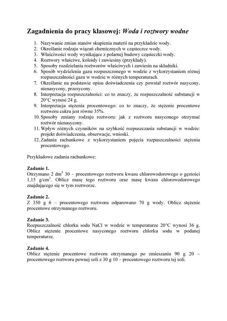 Zagadnienia do pracy klasowej: Woda i roztwory wodne 1. 2. 3. 4. 5. 6. Nazywanie zmian stanów skupienia materii na przykładzie wody. Określanie rodzaju wiązań chemicznych w cząsteczce wody. Właściwości wody wynikające z polarnej budowy cząsteczki wody. Roztwory właściwe, koloidy i zawiesiny (przykłady). Sposoby rozdzielania roztworów właściwych i zawiesin na składniki. Sposób wydzielenia gazu rozpuszczonego w wodzie z wykorzystaniem różnej rozpuszczalności gazu w wodzie w różnych temperaturach. 7. Określanie na podstawie opisu doświadczenia czy powstał roztwór nasycony, nienasycony, przesycony. 8. Interpretacja rozpuszczalności: co to znaczy, że rozpuszczalność substancji w 20°C wynosi 24 g. 9. Interpretacja stężenia procentowego: co to znaczy, że stężenie procentowe roztworu cukru jest równe 35%. 10. Sposoby zmiany rodzaju roztworu: jak z roztworu nasyconego otrzymać roztwór nienasycony. 11. Wpływ różnych czynników na szybkość rozpuszczania substancji w wodzie: projekt doświadczenia, obserwacje, wnioski. 12. Zadania rachunkowe z wykorzystaniem pojęcia rozpuszczalności stężenia procentowego. Przykładowe zadania rachunkowe: Zadanie 1. Otrzymano 2 dm3 30 – procentowego roztworu kwasu chlorowodorowego o gęstości 1,15 g/cm3. Oblicz masę tego roztworu oraz masę kwasu chlorowodorowego znajdującego się w tym roztworze. Zadanie 2. Z 350 g 6 – procentowego roztworu odparowano 70 g wody. Oblicz stężenie procentowe otrzymanego roztworu. Zadanie 3. Rozpuszczalność chlorku sodu NaCl w wodzie w temperaturze 20°C wynosi 36 g. Oblicz stężenie procentowe nasyconego roztworu chlorku sodu w podanej temperaturze. Zadanie 4. Oblicz stężenie procentowe roztworu otrzymanego po zmieszaniu 90 g 20 – procentowego roztworu pewnej soli z 30 g 10 – procentowego roztworu tej soli.