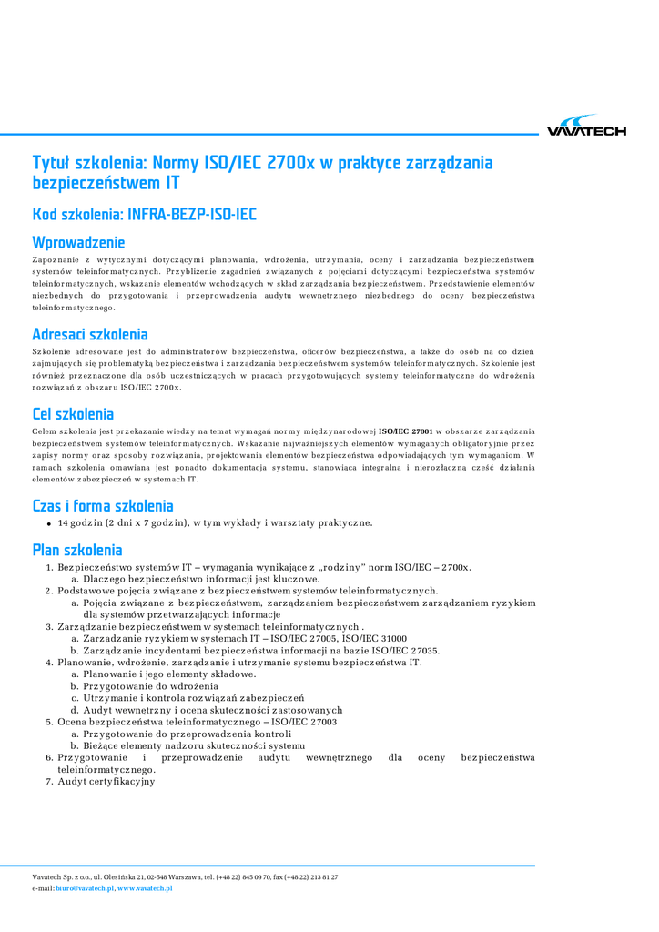 Tytuł szkolenia: Normy ISO/IEC 2700x w praktyce zarządzania bezpieczeństwem IT Kod szkolenia: INFRA-BEZP-ISO-IEC Wprowadzenie Z apo z nanie z wy ty cz ny m i do ty cz ący m i plano wania, wdr o żenia, utr z y m ania, o ceny i z ar z ądz ania b ez piecz eńs twem s y s tem ó w teleinfo r m aty cz ny ch. Pr z y b liżenie z agadnień z wiąz any ch z po jęciam i do ty cz ący m i b ez piecz eńs twa s y s tem ó w teleinfo r m aty cz ny ch, ws kaz anie elem entó w wcho dz ący ch w s kład z ar z ądz ania b ez piecz eńs twem . Pr z eds tawienie elem entó w niez b ędny ch do pr z y go to wania i pr z epr o wadz enia audy tu wewnętr z nego niez b ędnego do o ceny b ez piecz eńs twa teleinfo r m aty cz nego . Adresaci szkolenia Sz ko lenie adr es o wane jes t do adm inis tr ato r ó w b ez piecz eńs twa, o ficer ó w b ez piecz eńs twa, a także do o s ó b na co dz ień z ajm ujący ch s ię pr o b lem aty ką b ez piecz eńs twa i z ar z ądz ania b ez piecz eńs twem s y s tem ó w teleinfo r m aty cz ny ch. Sz ko lenie jes t r ó wnież pr z ez nacz o ne dla o s ó b ucz es tnicz ący ch w pr acach pr z y go to wujący ch s y s tem y teleinfo r m aty cz ne do wdr o żenia r o z wiąz ań z o b s z ar u ISO /IEC 2 70 0 x . Cel szkolenia C elem s z ko lenia jes t pr z ekaz anie wiedz y na tem at wy m agań no r m y m iędz y nar o do wej ISO/IEC 27001 w o b s z ar z e z ar z ądz ania b ez piecz eńs twem s y s tem ó w teleinfo r m aty cz ny ch. W s kaz anie najważniejs z y ch elem entó w wy m agany ch o b ligato r y jnie pr z ez z apis y no r m y o r az s po s o b y r o z wiąz ania, pr o jekto wania elem entó w b ez piecz eńs twa o dpo wiadający ch ty m wy m aganio m . W r am ach s z ko lenia o m awiana jes t po nadto do kum entacja s y s tem u, s tano wiąca integr alną i nier o z łącz ną cz eś ć dz iałania elem entó w z ab ez piecz eń w s y s tem ach IT . Czas i forma szkolenia 14 godz in (2 dni x 7 godz in), w tym wykłady i warsz taty praktycz ne. Plan szkolenia 1. Bez piecz eństwo systemów IT – wymagania wynikające z „rodz iny” norm ISO/IEC – 2700x. a. Dlacz ego bez piecz eństwo informacji jest klucz owe. 2. Podstawowe pojęcia z wiąz ane z bez piecz eństwem systemów teleinformatycz nych. a. Pojęcia z wiąz ane z bez piecz eństwem, z arz ądz aniem bez piecz eństwem z arz ądz aniem ryz ykiem dla systemów prz etwarz ających informacje 3. Zarz ądz anie bez piecz eństwem w systemach teleinformatycz nych . a. Zarz adz anie ryz ykiem w systemach IT – ISO/IEC 27005, ISO/IEC 31000 b. Zarz ądz anie incydentami bez piecz eństwa informacji na baz ie ISO/IEC 27035. 4. Planowanie, wdrożenie, z arz ądz anie i utrz ymanie systemu bez piecz eństwa IT. a. Planowanie i jego elementy składowe. b. Prz ygotowanie do wdrożenia c. Utrz ymanie i kontrola roz wiąz ań z abez piecz eń d. Audyt wewnętrz ny i ocena skutecz ności z astosowanych 5. Ocena bez piecz eństwa teleinformatycz nego – ISO/IEC 27003 a. Prz ygotowanie do prz eprowadz enia kontroli b. Bieżące elementy nadz oru skutecz ności systemu 6. Prz ygotowanie i prz eprowadz enie audytu wewnętrz nego dla oceny bez piecz eństwa teleinformatycz nego. 7. Audyt certyfikacyjny Vavatech Sp. z o.o., ul. Olesińska 21, 02-548 Warszawa, tel. (+48 22) 845 09 70, fax (+48 22) 213 81 27 e-mail: [email protected], www.vavatech.pl
