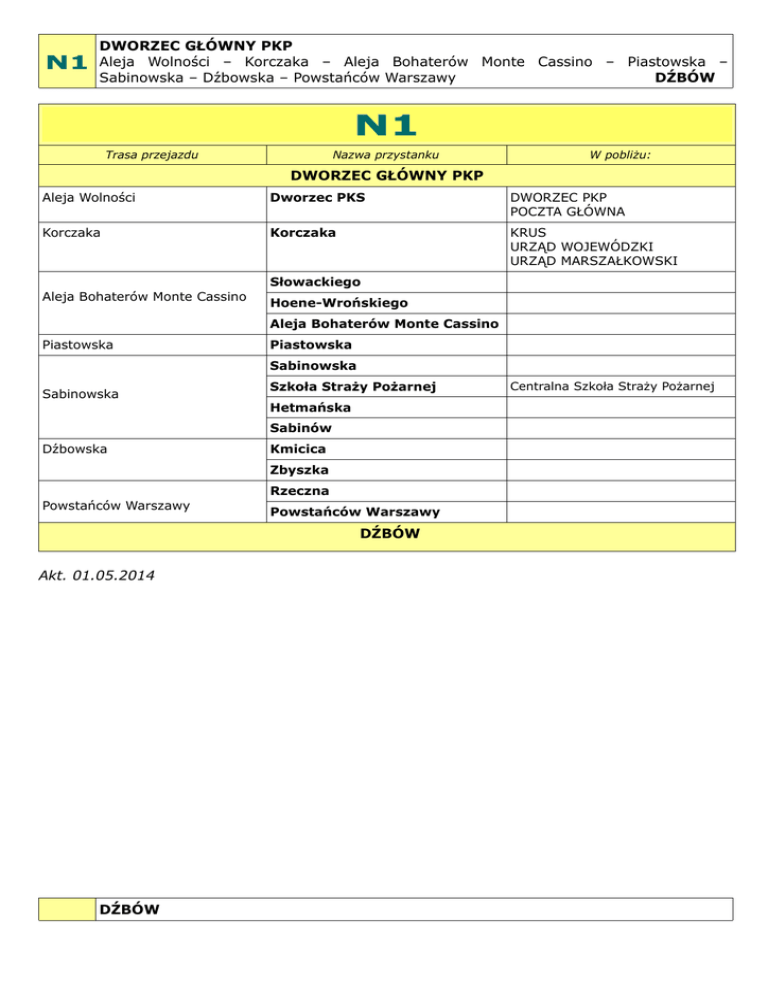 N1 DWORZEC GŁÓWNY PKP Aleja Wolności – Korczaka – Aleja Bohaterów Monte Cassino – Piastowska – Sabinowska – Dźbowska – Powstańców Warszawy DŹBÓW N1 Trasa przejazdu Nazwa przystanku W pobliżu: DWORZEC GŁÓWNY PKP Aleja Wolności Dworzec PKS DWORZEC PKP POCZTA GŁÓWNA Korczaka Korczaka KRUS URZĄD WOJEWÓDZKI URZĄD MARSZAŁKOWSKI Słowackiego Aleja Bohaterów Monte Cassino Hoene-Wrońskiego Aleja Bohaterów Monte Cassino Piastowska Piastowska Sabinowska Sabinowska Szkoła Straży Pożarnej Hetmańska Sabinów Dźbowska Kmicica Zbyszka Rzeczna Powstańców Warszawy Powstańców Warszawy DŹBÓW Akt. 01.05.2014 DŹBÓW Centralna Szkoła Straży Pożarnej N1 Powstańców Warszawy – Dźbowska – Sabinowska – Piastowska – Aleja Bohaterów Monte Cassino – Korczaka - Aleja Wolności DWORZEC GŁÓWNY PKP N1 Trasa przejazdu Nazwa przystanku W pobliżu: DŹBÓW Powstańców Warszawy Powstańców Warszawy Dźbowska Rzeczna Zbyszka Kmicica Sabinów Hetmańska Sabinowska Szkoła Straży Pożarnej Centralna Szkoła Straży Pożarnej Sabinowska Piastowska Piastowska Aleja Bohaterów Monte Cassino Aleja Bohaterów Monte Cassino Hoene-Wrońskiego Słowackiego Plac Pamięci Narodowej Plac Pamięci Narodowej USC Aleja Wolności Dworzec PKS POCZTA GŁÓWNA DWORZEC GŁÓWNY PKP
