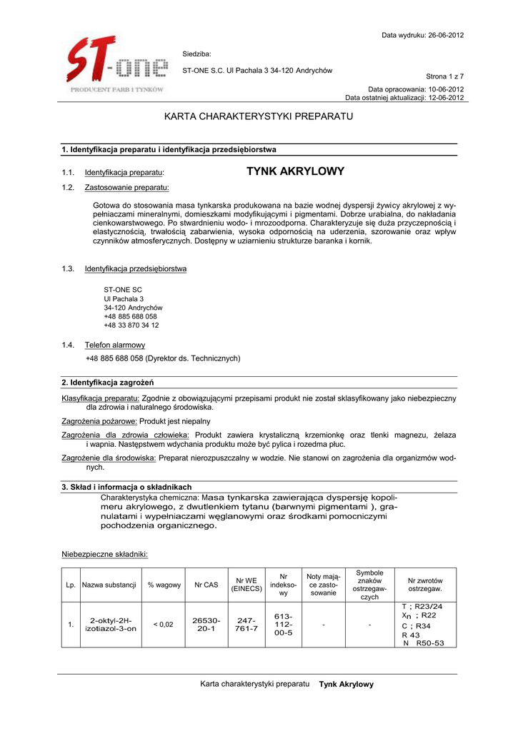Data wydruku: 26-06-2012 Siedziba: ST-ONE S.C. Ul Pachala 3 34-120 Andrychów Strona 1 z 7 Data opracowania: 10-06-2012 Data ostatniej aktualizacji: 12-06-2012 KARTA CHARAKTERYSTYKI PREPARATU 1. Identyfikacja preparatu i identyfikacja przedsiębiorstwa 1.1. Identyfikacja preparatu: 1.2. Zastosowanie preparatu: TYNK AKRYLOWY Gotowa do stosowania masa tynkarska produkowana na bazie wodnej dyspersji żywicy akrylowej z wypełniaczami mineralnymi, domieszkami modyfikującymi i pigmentami. Dobrze urabialna, do nakładania cienkowarstwowego. Po stwardnieniu wodo- i mrozoodporna. Charakteryzuje się duża przyczepnością i elastycznością, trwałością zabarwienia, wysoka odpornością na uderzenia, szorowanie oraz wpływ czynników atmosferycznych. Dostępny w uziarnieniu strukturze baranka i kornik. 1.3. Identyfikacja przedsiębiorstwa ST-ONE SC Ul Pachala 3 34-120 Andrychów +48 885 688 058 +48 33 870 34 12 1.4. Telefon alarmowy +48 885 688 058 (Dyrektor ds. Technicznych) 2. Identyfikacja zagrożeń Klasyfikacja preparatu: Zgodnie z obowiązującymi przepisami produkt nie został sklasyfikowany jako niebezpieczny dla zdrowia i naturalnego środowiska. Zagrożenia pożarowe: Produkt jest niepalny Zagrożenia dla zdrowia człowieka: Produkt zawiera krystaliczną krzemionkę oraz tlenki magnezu, żelaza i wapnia. Następstwem wdychania produktu może być pylica i rozedma płuc. Zagrożenie dla środowiska: Preparat nierozpuszczalny w wodzie. Nie stanowi on zagrożenia dla organizmów wodnych. 3. Skład i informacja o składnikach Charakterystyka chemiczna: Masa tynkarska zawierająca dyspersję kopolimeru akrylowego, z dwutlenkiem tytanu (barwnymi pigmentami ), granulatami i wypełniaczami węglanowymi oraz środkami pomocniczymi pochodzenia organicznego. Niebezpieczne składniki: Lp. Nazwa substancji 1. 2-oktyl-2Hizotiazol-3-on % wagowy < 0,02 Nr CAS 2653020-1 Nr WE (EINECS) Nr indeksowy 247761-7 61311200-5 Noty mające zastosowanie Karta charakterystyki preparatu Symbole znaków ostrzegawczych Nr zwrotów ostrzegaw. T ; R23/24 Xn ; R22 - - Tynk Akrylowy C ; R34 R 43 N R50-53 Data wydruku: 26-06-2012 Siedziba: ST-ONE S.C. Ul Pachala 3 34-120 Andrychów Strona 2 z 7 Data opracowania: 10-06-2012 Data ostatniej aktualizacji: 12-06-2012 2. karbendazym < 0,03 1060521-7 234232-0 - - - muta.kat.2 ; R46 repro.kat2 R60-61 N : R50-53 4. Pierwsza pomoc Drogi oddechowe: Przy narażeniu na bardzo wysokie stężenia wynieść poszkodowanego na świeże powietrze. Gdy poszkodowany nie oddycha, zastosować sztuczne oddychanie. W przypadku utrudnionego oddychania – natychmiast wezwać pomoc medyczną. Kontakt ze skórą: Zanieczyszczoną skórę przemyć dużą ilością wody. Kontakt z okiem: Natychmiast płukać dużą ilością wody (najlepiej bieżącej). Dla ułatwienia płukania trzymać powieki szeroko otwarte. Jeżeli występują objawy podrażnienia, zapewnić pomoc medyczną. Połknięcie: Podać do picia zimną, czystą wodę, małymi porcjami. Przy połknięciu dużej dawki produktu natychmiast zwrócić się o pomoc medyczną. 5. Postępowanie w przypadku pożaru Odpowiednie środki gaśnicze: Niepalny ani nie podtrzymujący palenia. Stosować środki gaśnicze właściwe dla otaczających materiałów. Środki gaśnicze, których nie wolno używać ze względów bezpieczeństwa: Nie dotyczy. Specjalne zagrożenia: Unikać wdychania pyłów. Niebezpieczne produkty rozkładu: Nieznane. Specjalne wyposażenie ochronne dla strażaków: Nałożyć odzież ochronną i maskę przeciwpyłową. Dalsze zalecenia: Zawiadomić otoczenie o awarii. Usunąć z obszaru zagrożenia wszystkie osoby niebiorące udziału w likwidowaniu awarii. Wezwać Państwową Straż Pożarną i Policję Państwową. 6. Postępowanie w przypadku niezamierzonego uwolnienia do środowiska Indywidualne środki ostrożności: Nie wdychać produktu. Środki ostrożności w zakresie ochrony środowiska: Nie dopuszczać do zrzutów do środowiska. Zabezpieczyć produkt przed dostaniem się do kanałów ściekowych – wartość odczynu pH w ekstraktach wodnych jest przekroczona i nie dotrzymuje wartości dopuszczalnych dla ścieków wprowadzanych do wód i ziemi (patrz pkt 12). Metody oczyszczania: Rozsypany materiał przykryć i nie dopuścić do dalszego wzbijania pyłu. Starannie zebrać produkt tak, jak to możliwe do odpowiednich szczelnie zamykanych pojemników. Nie stosować wody. 7. Postępowanie z preparatem i jego magazynowanie 7.1 Postępowanie z preparatem Zachować rozsądną staranność i ostrożność. 7.2. Magazynowanie Chronić przed działaniem wilgoci i uszkodzeniem opakowania. Opakowania, gdy nie są używane, przechowywać zamknięte. Przechowywać zawsze w oryginalnych opakowaniach. Nie używać zanieczyszczonych, pustych opakowań do innych celów. 7.3. Specyficzne zastosowania Nie dotyczy. 8. Kontrola narażenia i środki ochrony indywidualnej Wskazówki dodatkowe odnośnie wymogów stawianych urządzeniom technicznym: Wskazana jest skuteczna wentylacja ogólna pomieszczenia w celu zmniejszenie stopnia narażenia pracowników. Jeżeli wentylacja wywiewna nie jest wystarczająca, stosować odpowiednie ochrony indywidualne układu oddechowego. Karta charakterystyki preparatu Tynk Akrylowy Data wydruku: 26-06-2012 Siedziba: ST-ONE S.C. Ul Pachala 3 34-120 Andrychów Strona 3 z 7 Data opracowania: 10-06-2012 Data ostatniej aktualizacji: 12-06-2012 Wartości graniczne narażenia: Rozporządzenie MPiPS z 29.11.2002 roku z późn. zmianami określa najwyższe dopuszczalne stężenia i natężenie czynników szkodliwych: węglan wapnia: węglan wapnia (pyły): di tlenek tytanu (pyły): b/d NDS: 10 mg/m³, NDSCh: nieustalone, NDSP: nieustalone NDS: 10 mg/m³, NDSCh: nieustalone, NDSP: nieustalone Zalecane procedury monitoringu: Rozp. MZ z dn. 20.04.2005r w sprawie badań i pomiarów czynników szkodliwych dla zdrowia w środowisku pracy (Dz.U. Nr 73, poz. 645 z dnia 28.04.05 z późn. zmianami). Badania i pomiary c