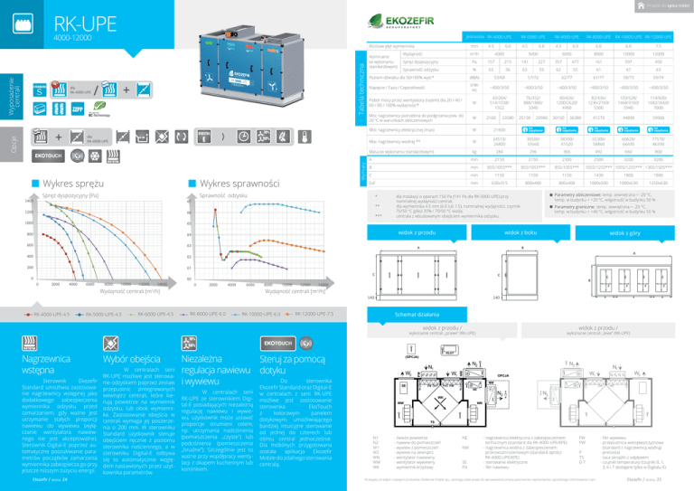 Przejdź do spisu treści RK-UPE 4000-12000 Jednostka RK-4000-UPE dla RK-4000-UPE Wykres sprawności 66 1000 65 800 64 600 63 400 62 200 61 0 60 2000 4000 6000 8000 10000 12000 14000 6000 Wydajność centrali [m3/h] 10000 12000 215 141 227 357 477 161 597 63 56 63 55 62 55 61 67 63 57/72 62/77 61/77 58/73 59/74 Napięcie / Faza / Częstotliwość V/φ/ Hz ~400/3/50 ~400/3/50 ~400/3/50 ~400/3/50 ~400/3/50 ~400/3/50 Pobór mocy przez wentylatory (razem) dla 20 / 40 / 60 / 80 / 100% wydajności* W 43/204/ 514/1038/ 1922 76/352/ 888/1800/ 3340 80/426/ 1200/2620/ 4960 82/436/ 1236/2760/ 5300 103/528/ 1468/3160/ 5940 114/600/ 1682/3660/ 7000 Moc nagrzewnicy potrzebna do podgrzania pow. do 20 0C w warunkach obliczeniowych W 41270 44890 59900 Moc nagrzewnicy elektrycznej (max) W 21600 Moc nagrzewnicy wodnej ** W 24510/ 26800 30500/ 33560 38390/ 41520 55300/ 58860 60620/ 66430 77570/ 86390 Masa (w wykonaniu standardowym) kg 284 296 366 492 660 800 2500 3200 3200 2100 RK-5000-UPE-4.5 RK-6000-UPE-4.5 23580 Sterownik Ekozefir Standard umożliwia zastosowanie nagrzewnicy wstępnej jako dodatkowego zabezpieczenia wymiennika odzysku przed zamarzaniem, gdy ważne jest utrzymanie stałych proporcji nawiewu do wywiewu (wyłączanie wentylatora nawiewnego nie jest akceptowalne). Sterownik Digital-E poprzez automatyczne poszukiwanie parametrów początków zamarzania wymiennika zabezpiecza go przy jeszcze niższym zużyciu energii. Ekozefir / strona: 24 i na zapytanie 36380 i na zapytanie RK-10000-UPE-6.0 2150 2300 855/1055*** 855/1055*** C mm 1150 1150 1150 1430 1800 1800 ExF mm 630x315 800x400 800x400 1000x500 1000x630 1250x630 1055/1255*** 1055/1255*** 1305/1505*** Parametry obliczeniowe: temp. zewnętrzna = -20 °C, temp. w budynku = +20 °C, wilgotność w budynku 50 % dla instalacji o oporach 150 Pa (141 Pa dla RK-5000-UPE) przy nominalnej wydajności centrali, dla wymiennika 4.5 mm (6.0 lub 7.5), nominalnej wydajności, czynnik 70/50 °C glikol 35% / 70/50 °C woda, centrala z wbudowanym obejściem wymiennika odzysku. Parametry graniczne: temp. zewnętrzna = -20 °C, temp. w budynku = +40 °C, wilgotność w budynku 55 % widok z boku A C A B B C C widok z góry C B B C E B F A A E E E E E B F F F F F RK-12000-UPE-7.5 A E E E E F F E F F F E F 140 Schemat działania 7 obejście 5 (OPCJA) W2 SE N2 N1 P FN W1 1 0 obejście widok z przodu / obejście wykonanie centrali ,,lewe” (RK-UPE) PILOT FW N2 4 NW Niezależna Steruj za pomocą regulacja nawiewu dotyku Do sterownika i wywiewu W centralach serii RK-UPE ze sterownikiem Digital-E posiadających niezależną regulację nawiewu i wywiewu, użytkownik może ustawić proporcje strumieni celem, np. utrzymania nadciśnienia (pomieszczenia „czyste”) lub podciśnienia (pomieszczenia „brudne”). Szczególnie jest to ważne przy współpracy wentylacji z okapem kuchennym lub kominkiem. na zapytanie 2150 14000 Ekozefir Standard oraz Digital-E w centralach z serii RK-UPE możliwe jest zastosowanie sterownika EkoTouch z kolorowym panelem dotykowym, umożliwiającego bardziej intuicyjne sterowanie od jednej do czterech lub ośmiu central jednocześnie. Dla mobilnych przygotowana została aplikacja Ekozefir Mobile do zdalnego sterowania centralą. i na zapytanie 855/1055*** Wydajność centrali [m3/h] RK-8000-UPE-6.0 i na zapytanie mm PW W centralach serii RK-UPE możliwe jest sterowanie odzyskiem poprzez zestaw przepustnic zintegrowanych wewnątrz centrali, które kierują powietrze na wymiennik odzysku, lub obok wymiennika. Zastosowanie obejścia w centrali wymaga jej poszerzenia o 200 mm. W sterowniku Standard użytkownik steruje obejściem ręcznie z poziomu sterownika naściennego, a w sterowniku Digital-E odbywa się to automatycznie względem nastawionych przez użytkownika parametrów. 30150 mm widok z przodu / Wybór obejścia i 29980 A wykonanie centrali ,,prawe” (RK-UPE) Nagrzewnica wstępna 25130 B 140 RK-4000-UPE-4.5 450 157 % 53/68 * ** *** 8000 7.5 12000 Pa C 4000 6.0 10000 Spręż dyspozycyjny A 2000 6.0 8000 Sprawność odzysku widok z przodu 0 6.0 6000 obejście 0 4.5 6.0 5000 dB(A) 67 1200 4.5 6.0 4000 RK-10000-UPE RK-12000-UPE Poziom dźwięku dla 50/100% wyd.* Sprawność odzysku Spręż dyspozycyjny [Pa] 1400 Nominalne (w wykonaniu standardowym) 4.5 m3/h RK-8000-UPE obejście Wykres sprężu Wymiary: Opcje + + / mm Wydajność RK-6000-UPE obejście dla RK-4000-UPE Tabela techniczna Wyposażenie centrali Rozstaw płyt wymiennika RK-5000-UPE W1 OPCJA N1 W2 NW NE P N2 WK WW 4 N2 WN 3 2 TS N1 N2 W1 W2 WN WW WK - świeże powietrze - nawiew do pomieszczeń - wywiew z pomieszczeń - wywiew na zewnątrz - wentylator nawiewny - wentylator wywiewny - wymiennik krzyżowy NE NW SE FN - nagrzewnica elektryczna z zabezpieczeniem termicznym (standard dla RK-4000-UPE/KPE) - nagrzewnica wodna z zabezpieczeniem przeciwzamrożeniowym (standard oprócz RK-4000-UPE/KPE) - sterowanie elektryczne - filtr nawiewu FW PW P TS 0-7 W związku ze stałym rozwojem produktów, Ekoklimax-Projekt sp.j. zastrzega sobie prawo do wprowadzenia zmiany parametrów i wymiarów bez uprzedniego informowania o tym. - filtr wywiewu - przepustnica wielopłaszczyznowa (standard z nagrzewnicą wodną) - presostat - taca skroplin z odpływem - czujniki temperatury (czujniki 0, 1, 3, 6 i 7 dostępne tylko w Digitalu-E) Ekozefir / strona: 25