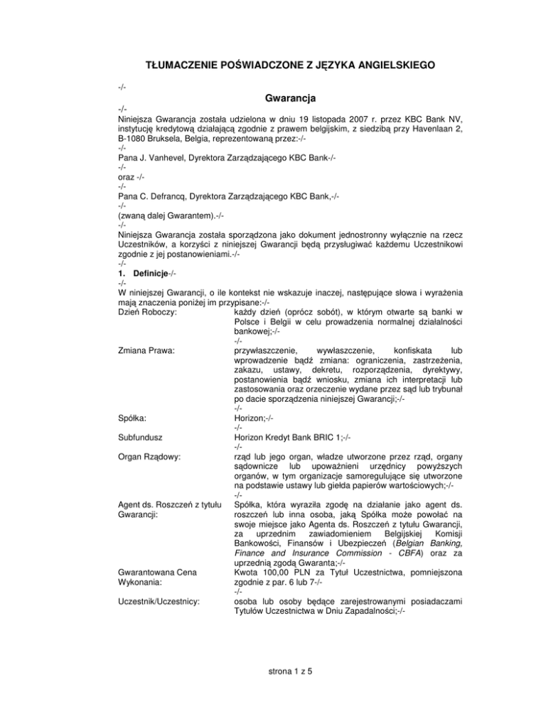 TŁUMACZENIE POŚWIADCZONE Z JĘZYKA ANGIELSKIEGO -/- Gwarancja -/Niniejsza Gwarancja została udzielona w dniu 19 listopada 2007 r. przez KBC Bank NV, instytucję kredytową działającą zgodnie z prawem belgijskim, z siedzibą przy Havenlaan 2, B-1080 Bruksela, Belgia, reprezentowaną przez:-/-/Pana J. Vanhevel, Dyrektora Zarządzającego KBC Bank-/-/oraz -/-/Pana C. Defrancq, Dyrektora Zarządzającego KBC Bank,-/-/(zwaną dalej Gwarantem).-/-/Niniejsza Gwarancja została sporządzona jako dokument jednostronny wyłącznie na rzecz Uczestników, a korzyści z niniejszej Gwarancji będą przysługiwać kaŜdemu Uczestnikowi zgodnie z jej postanowieniami.-/-/1. Definicje-/-/W niniejszej Gwarancji, o ile kontekst nie wskazuje inaczej, następujące słowa i wyraŜenia mają znaczenia poniŜej im przypisane:-/Dzień Roboczy: kaŜdy dzień (oprócz sobót), w którym otwarte są banki w Polsce i Belgii w celu prowadzenia normalnej działalności bankowej;-/-/Zmiana Prawa: przywłaszczenie, wywłaszczenie, konfiskata lub wprowadzenie bądź zmiana: ograniczenia, zastrzeŜenia, zakazu, ustawy, dekretu, rozporządzenia, dyrektywy, postanowienia bądź wniosku, zmiana ich interpretacji lub zastosowania oraz orzeczenie wydane przez sąd lub trybunał po dacie sporządzenia niniejszej Gwarancji;-/-/Spółka: Horizon;-/-/Subfundusz Horizon Kredyt Bank BRIC 1;-/-/Organ Rządowy: rząd lub jego organ, władze utworzone przez rząd, organy sądownicze lub upowaŜnieni urzędnicy powyŜszych organów, w tym organizacje samoregulujące się utworzone na podstawie ustawy lub giełda papierów wartościowych;-/-/Agent ds. Roszczeń z tytułu Spółka, która wyraziła zgodę na działanie jako agent ds. Gwarancji: roszczeń lub inna osoba, jaką Spółka moŜe powołać na swoje miejsce jako Agenta ds. Roszczeń z tytułu Gwarancji, za uprzednim zawiadomieniem Belgijskiej Komisji Bankowości, Finansów i Ubezpieczeń (Belgian Banking, Finance and Insurance Commission - CBFA) oraz za uprzednią zgodą Gwaranta;-/Gwarantowana Cena Kwota 100,00 PLN za Tytuł Uczestnictwa, pomniejszona Wykonania: zgodnie z par. 6 lub 7-/-/Uczestnik/Uczestnicy: osoba lub osoby będące zarejestrowanymi posiadaczami Tytułów Uczestnictwa w Dniu Zapadalności;-/- strona 1 z 5 Dzień Zapadalności Prospekt: Cena Wykonania: Tytuł Uczestnictwa: Podatek: 28 czerwca 2013 r. lub – jeŜeli dzień ten nie jest Dniem Roboczym – następny Dzień Roboczy, lub – jeŜeli ustalanie wartości aktywów netto Subfunduszu zawieszono w tym dniu – Dzień Roboczy następujący po dniu zniesienia tego zawieszenia;-/-/prospekt dotyczący emisji Tytułów Uczestnictwa;-/-/wartość aktywów netto na jeden Tytuł Uczestnictwa w Dniu Zapadalności obliczona zgodnie z Prospektem;-/-/Tytuł Uczestnictwa w Subfunduszu;-/-/podatek, obciąŜenie, potrącenie, opłata, naleŜność, opłata celna, przymusowa poŜyczka lub potrącenie, nakładane lub naliczane przez Organ Rządowy, w tym (między innymi) potrącenie, podatek od dochodu, opłata skarbowa lub podatek od czynności, opłata celna lub naleŜność wraz z odsetkami, karami, opłatami lub naleŜnościami lub innymi kwotami nakładanymi lub naliczanymi od wyŜej wymienionych obciąŜeń lub w związku z nimi.-/- -/2. Gwarancja-/-/Z zastrzeŜeniem postanowień niniejszej Gwarancji, Gwarant nieodwołalnie gwarantuje wobec kaŜdego Uczestnika naleŜną i terminową płatność z tytułu wszelkich posiadanych w Dniu Zapadalności Tytułów Uczestnictwa, kwoty równej róŜnicy pomiędzy Ceną Wykonania w Dniu Zapadalności a Gwarantowaną Ceną Wykonania obliczoną zgodnie z Prospektem oraz postanowieniami niniejszej Gwarancji, z zastrzeŜeniem Ŝe maksymalna odpowiedzialność Gwaranta z tytułu niniejszej Gwarancji nie przekroczy kwoty równej Gwarantowanej Cenie Wykonania pomnoŜonej przez liczbę Tytułów Uczestnictwa wyemitowanych na Dzień Zapadalności.-/-/W Ŝadnym przypadku Gwarant nie jest zobowiązany do dokonania płatności na podstawie niniejszej Gwarancji z tytułu Tytułów Uczestnictwa nie będących w posiadaniu [Uczestników] w Dniu Zapadalności.-/-/Z zastrzeŜeniem par. 3.1 i 5 gwarancja ustanowiona na mocy niniejszego dokumentu jest waŜna do dziesiątego Dnia Roboczego przypadającego po Dniu Zapadalności i wygasa w powyŜszym terminie; Ŝądania na podstawie gwarancji mogą być zgłaszane w terminie określonym w par. 4.1.-/-/Gwarancja nie ma zastosowania w przypadku rozwiązania Subfunduszu przed Dniem Zapadalności.-/-/3. Warunki-/-/NiezaleŜnie od postanowień par. 2.1 i 2.3, zobowiązanie Gwaranta do dokonania płatności na rzecz Uczestników na mocy par. 2.1 powstaje wyłącznie w przypadku gdy Cena Wykonania w Dniu Zapadalności jest niŜsza od Gwarantowanej Ceny Wykonania. W takim przypadku zobowiązanie Gwaranta do dokonania płatności z tytułu wszystkich Tytułów Uczestnictwa posiadanych w Dniu Zapadalności ogranicza się do kwoty równej róŜnicy pomiędzy Gwarantowaną Ceną Wykonania a Ceną Wykonania w Dniu Zapadalności. Gwarancja ustanowiona na podstawie niniejszego dokumentu ulega automatycznie rozwiązaniu z chwilą ustalenia Ceny Wykonania na Dzień Zapadalności, jeŜeli Cena Wykonania jest wyŜsza lub równa Gwarantowanej Cenie Wykonania. Dla uniknięcia wątpliwości, Gwarant nie ponosi Ŝadnej odpowiedzialności z tytułu straty lub zmniejszenia strona 2 z 5 wartości aktywów Subfunduszu po obliczeniu Ceny Wykonania na Dzień Zapadalności lub niewypłacenia przez Spółkę wpływów z realizacji Uczestnikowi dokonującemu realizacji.-/-/Z zastrzeŜeniem par. 5, Ŝądania na podstawie niniejszej Gwarancji mogą być zgłaszane w imieniu Uczestników wyłącznie za pośrednictwem Agenta ds. Roszczeń z tytułu Gwarancji.-/-/Dokonanie płatności przez Gwaranta Agentowi ds. Roszczeń z tytułu Gwarancji kwoty naleŜnej na podstawie niniejszej Gwarancji z tytułu Gwarantowanej Ceny Wykonania za Tytuły Uczestnictwa, określonej zgodnie z pa