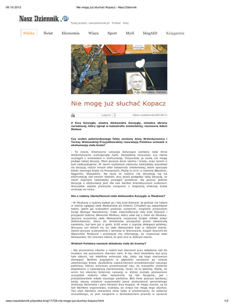 06.10.2012 Nie mogę już słuchać Kopacz - Nasz Dziennik Tutaj jesteś: naszdziennik.pl Polska Polska Świat Ekonomia Wiara Sport Kraj Myśl blogAID Księgarnia M.Borawski/Nasz Dziennik Nie mogę już słuchać Kopacz Lubię to! 4 Sobota, 6 paździer nika 2012 (06:11) Z Ewą Szczygło, siostrą Aleksandra Szczygły, ministra obrony narodowej, który zginął w katastrofie smoleńskiej, rozmawia Adam Białous Czy wobec potwierdzonego faktu zamiany Anny Walentynowicz i Teresy Walewskiej-Przyjałkowskiej rozważają Państwo wniosek o ekshumację ciała brata? - Ta nowa, drastyczna sytuacja dotycząca zamiany ciała Anny Walentynowicz wstrząsnęła nami. Zaczęliśmy rozważać, czy mamy wystąpić z wnioskiem o ekshumację. Oczywiście ja sama nie mogę podjąć takiej decyzji. Mam jeszcze dwie siostry i brata, więc razem o tym zadecydujemy. W moim osobistym odczuciu należałoby poczekać na decyzję rodzin innych ofiar katastrofy smoleńskiej, które spoczęły blisko naszego brata na Powązkach. Myślę tu m.in. o rodzinie Błasików, Gągorów, Stasiaków. Na razie te rodziny nie decydują się na ekshumację ciał swoich bliskich, lecz jeżeli podjęliby taką decyzję, to moim zdaniem należałoby postąpić podobnie. Na pewno jednak decyzja o ekshumacji jest dla nas bardzo dramatycznym wyborem. Wszystkie ciężkie przeżycia związane z tragiczną śmiercią brata wracają na nowo. Kto z rodziny identyfikował ciało Aleksandra Szczygły w Moskwie? - W Moskwie z rodziny byłam ja i mój brat Edward. Ja jednak nie byłam w stanie oglądać ciała Aleksandra po śmierci. Chciałam go zapamiętać takim, jakim go widziałam podczas ostatnich, wspólnie przeżytych świąt Bożego Narodzenia. Ciało zidentyfikował mój brat Edward i przyjaciel rodziny Sławomir Moćkun, który udał się z nami do Moskwy. Jeszcze wcześniej ciało Aleksandra rozpoznał ksiądz infułat Julian Żołnierkiewicz, który do Smoleńska przyjechał przed katastrofą samolotu, był tam już o godz. 6.00 wraz z częścią delegacji polskiej. Wszyscy oni mówili mi, że ciało Aleksandra było w dobrym stanie. Zanim jeszcze wylecieliśmy z lotniska w Warszawie, ksiądz dzwonił do Sławomira Moćkuna i przekazał mu informację, że rozpoznał ciało Aleksandra. On również mówił, że jest ono w dobrym stanie. Widzieli Państwo moment składania ciała do trumny? - Nie pozwolono nikomu z rodzin być obecnym przy składaniu ciał do trumien, nie pozwolono również nam. A my, choć chcieliśmy być przy tym obecni, nie mieliśmy wówczas siły, żeby się tego stanowczo domagać. Byliśmy pogrążeni w głębokim cierpieniu po stracie ukochanego brata. Zaufaliśmy zapewnieniom przedstawicieli naszego państwa, którzy wówczas przekonywali nas, że wszystko zostanie dopełnione z największą starannością. Teraz za to płacimy. Myślę, że winni tej obecnej bolesnej sytuacji, w której zostały postawione wszystkie rodziny ofiar katastrofy, są tak Rosjanie, jak i przedstawiciele władz naszego państwa. Boli mnie jeszcze bardziej, kiedy słyszę ostatnie wypowiedzi pana prokuratora generalnego Andrzeja Seremeta i pani minister Ewy Kopacz. W mojej ocenie, są to tak kłamliwe wypowiedzi, wykręty, że wręcz nie mogę tego słuchać. Ten stek kłamstw utwierdza mnie tylko w przekonaniu, że oddanie wszystkiego, co jest związane z dochodzeniem prawdy w sprawie www.naszdziennik.pl/polska-kraj/11728,nie-moge-juz-sluchac-kopacz.html 1/2 06.10.2012 Nie mogę już słuchać Kopacz - Nasz Dziennik katastrofy, w ręce Rosjan było olbrzymim błędem rządu. Jeżeli doszłoby do ekshumacji Aleksandra Szczygły, byłoby to ponowne wydobycie jego ciała z grobu. - Właściwie drugie, a złożenie ciała po ekshumacji w grobie byłoby dokonane po raz trzeci. Po raz pierwszy ciało Aleksandra zostało pochowane na warszawskich Powązkach. Po miesiącu od tego pogrzebu Rosjanie przesłali fragment nogi mojego brata, który - jak twierdzą - dopiero wówczas odnaleźli. Ciało Aleksandra trzeba więc było wydobyć z grobu i odnalezioną część nogi, umieszczoną w małej trumience, złożono w trumnie. Po czym trumnę zakopano. Jeżeli teraz dojdzie do ekshumacji, znów trzeba będzie wydobyć ciało, to dla nas koszmar. Dobrze, że zdecydowaliśmy się urządzić symboliczny grób Aleksandra w naszej rodzinnej miejscowości Węgój, gdzie się urodził. Tam na cmentarzu leżą nasi rodzice, więc pomyśleliśmy, że Aleksander chciałby mieć taki swój choćby symboliczny grób obok nich. Przecież to byli ludzie mu najbliżsi, gdyż nie było mu pisane założenie własnej rodziny. Dlatego na grobie rodziców zbudowaliśmy tablicę z imieniem Aleksandra, a do grobowca włożyliśmy symboliczną księgę m.in. ze zdjęciami Aleksandra, danymi na temat jego urodzenia i śmierci. Umieściliśmy tam też ziemię ze Smoleńska. Dziękuję za rozmowę. Adam Białous Ak tualizacja 6 paździe rnik a 2012 (08:08) Lubię to! POLSKA Kraj Polonia Kresy ŚWIAT 4 EKONOMIA WIARA SPORT Gospodarka Finanse Polska wieś Nieruchomości Kościół w Polsce Kościół na świecie Stolica Apostolska Prześladowania Piłka nożna Siatkówka Tenis Euro 2012 Londyn 2012 MYŚL blogAID Księgarnia Reklama | Prenumerata | Kontakt © C opyright by SPES sp. z o. o. www.naszdziennik.pl/polska-kraj/11728,nie-moge-juz-sluchac-kopacz.html 2/2