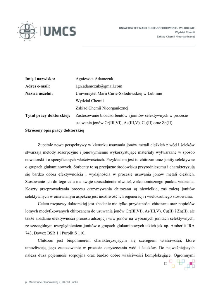 UNIWERSYTET MARII CURIE-SKŁODOWSKIEJ W LUBLINIE Wydział Chemii Zakład Chemii Nieorganicznej Imię i nazwisko: Agnieszka Adamczuk Adres e-mail: [email protected] Nazwa uczelni: Uniwersytet Marii Curie-Skłodowskiej w Lublinie Wydział Chemii Zakład Chemii Nieorganicznej Tytuł pracy doktorskiej: Zastosowanie bioadsorbentów i jonitów selektywnych w procesie usuwania jonów Cr(III,VI), As(III,V), Cu(II) oraz Zn(II). Skrócony opis pracy doktorskiej Zupełnie nowe perspektywy w kierunku usuwania jonów metali ciężkich z wód i ścieków stwarzają metody adsorpcyjne i jonowymienne wykorzystujące materiały wytwarzane w sposób nowatorski i o specyficznych właściwościach. Przykładem jest tu chitozan oraz jonity selektywne o grupach glukaminowych. Sorbenty te są przyjazne środowisku przyrodniczemu i charakteryzują się bardzo dobrą efektywnością i wydajnością w procesie usuwania jonów metali ciężkich. Stosowanie ich do tego celu ma swoje uzasadnienie również z ekonomicznego punktu widzenia. Koszty przeprowadzania procesu otrzymywania chitozanu są niewielkie, zaś zaletą jonitów selektywnych w omawianym aspekcie jest możliwość ich regeneracji i wielokrotnego stosowania. Celem rozprawy doktorskiej jest zbadanie nie tylko przydatności chitozanu oraz popiołów lotnych modyfikowanych chitozanem do usuwania jonów Cr(III,VI), As(III,V), Cu(II) i Zn(II), ale także zbadanie efektywności procesu adsorpcji w/w jonów na wybranych jonitach selektywnych, ze szczególnym uwzględnieniem jonitów o grupach glukaminowych takich jak np. Amberlit IRA 743, Dowex BSR 1 i Purolit S 110. Chitozan jest biopolimerem charakteryzującym się szeregiem właściwości, które umożliwiają jego zastosowanie w procesie oczyszczania wód i ścieków. Do najważniejszych należą duża pojemność sorpcyjna oraz bardzo dobre właściwości kompleksujące. Ogromnymi pl. Marii Curie-Skłodowskiej 2, 20-031 Lublin zaletami są również biodegradowalność i nietoksyczność, a także właściwości antybakteryjne i przeciwgrzybicze. Biopolimer ten może być modyfikowany fizycznie tworząc różnorodne struktury. Istnieje więc także możliwość jego modyfikacji chemicznej, co zwiększa spektrum jego zastosowań. Modyfikacje chitozanu poprawiają jego selektywność wobec jonów metali oraz w znaczący sposób wpływają na wzrost pojemność sorpcyjnej. W związku z powyższym dodatkowym korzystnym aspektem zaproponowanych badań będzie wprowadzenie modyfikatorów takich jak aldehyd glutarowy i epichlorohydryna, a następnie zbadanie efektywności procesu adsorpcji jonów metali ciężkich na zmodyfikowanym chitozanie. Jak wynika z danych literaturowych usuwanie jonów metali ciężkich może być również realizowane za pomocą stosowania popiołów lotnych. Odpad ten od lat stanowi poważny problem środowiskowy, gdyż stopień jego gospodarczego wykorzystania jest nadal niezadowalający. Kolejnym etapem pracy będzie wykorzystanie dotychczasowych wyników badań do optymalizacji procesu modyfikacji popiołów lotnych pochodzących z elektrociepłowni. Będą one modyfikowane chitozanem i badane pod kątem możliwości wykorzystania w procesie usuwania jonów metali ciężkich ze ścieków. Przeprowadzone badania powinny dać odpowiedź, co do możliwości wykorzystania zarówno chitozanu jak i odpadowych popiołów lotnych jako adsorbentów chemicznych i zanieczyszczeń środowiska z roztworów wodnych. W tym celu konieczne będzie wyznaczenie wielkości powierzchni właściwej (BET) i wielkości i struktury porów, przeprowadzenie analizy chemicznej (XRF), elementarnej (CHN), elektronowo-mikroskopowej (TEM, SEM), derywatograficznej (DTA, TG), dyfraktometrycznej (XRD) i spektroskopowej w podczerwieni (FT-IR). Szczegółowe badania adsorpcyjne dotyczące jonów metali będą prowadzone metodą spektrofotometrii absorpcji atomowej AAS oraz metodą spektrofotometrii UV-VIS. Obecnie stosowane metody usuwania jonów metali ciężkich takie jak np. strącanie chemiczne, filtracja, wymiana jonowa posiadają szereg wad, w tym duże koszty przeprowadzenia procesu i duża ilość powstałych odpadów. Z tym właśnie problemem zmaga się przedsiębiorstwo „Galwanex”. Opracowując nowe technologie i rozwiązania techniczne umożliwiające efektywne usuwanie jonów metali ciężkich firma „Galwanex” opierać się będzie na wynikach badań przeprowadzonych w Zakładzie Chemii Nieorganicznej UMCS w Lublinie. 2 Prowadzone w ramach pracy doktorskiej badania mogą przyczynić się do stworzenia nowych, tanich i innowacyjnych rozwiązań dla zaawansowanych technologii przemysłowych i ekologicznych metod oczyszczania ścieków. Cele pracy w sposób jednoznaczny dotyczą zasad zrównoważonego rozwoju oraz osiągnięcia najlepszej dostępnej techniki dla technologii oczyszczania ścieków. Zastosowanie proponowanych technologii jest korzystne z punktu widzenia ochrony środowiska. 3