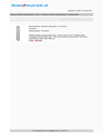 Utworzono: środa, 08 marzec 2017 Okucia do kabin prysznicowych i saun > Zawiasy do kabin prysznicowych > Parawanowe Zawias do parawanów L-1,5m chrom Nazwa produktu: Zawias do parawanów L-1,5m chrom Producent: Model produktu: 15.23.006-0 Zawias mosiężny unoszący typu ściana - szkło do szyby 6 mm. Po zdjęciu profilu mocującego może być jako szkło - szkło. Do parawanów nawannowych i drzwi kabin natryskowych. Szkło 1500 x 800 mm Cena: 496.55zł http://sklepzokuciami.pl | [email protected] | | Strona 1/1