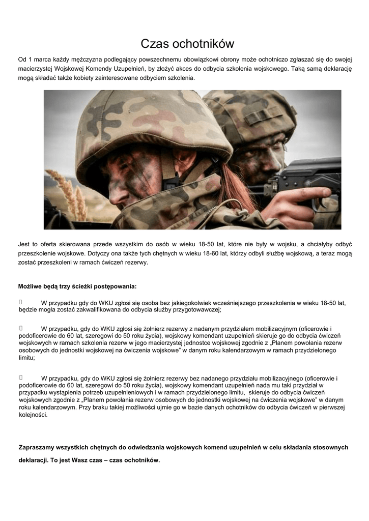 Czas ochotników Od 1 marca każdy mężczyzna podlegający powszechnemu obowiązkowi obrony może ochotniczo zgłaszać się do swojej macierzystej Wojskowej Komendy Uzupełnień, by złożyć akces do odbycia szkolenia wojskowego. Taką samą deklarację mogą składać także kobiety zainteresowane odbyciem szkolenia. Jest to oferta skierowana przede wszystkim do osób w wieku 18-50 lat, które nie były w wojsku, a chciałyby odbyć przeszkolenie wojskowe. Dotyczy ona także tych chętnych w wieku 18-60 lat, którzy odbyli służbę wojskową, a teraz mogą zostać przeszkoleni w ramach ćwiczeń rezerwy. Możliwe będą trzy ścieżki postępowania: • W przypadku gdy do WKU zgłosi się osoba bez jakiegokolwiek wcześniejszego przeszkolenia w wieku 18-50 lat, będzie mogła zostać zakwalifikowana do odbycia służby przygotowawczej; • W przypadku, gdy do WKU zgłosi się żołnierz rezerwy z nadanym przydziałem mobilizacyjnym (oficerowie i podoficerowie do 60 lat, szeregowi do 50 roku życia), wojskowy komendant uzupełnień skieruje go do odbycia ćwiczeń wojskowych w ramach szkolenia rezerw w jego macierzystej jednostce wojskowej zgodnie z „Planem powołania rezerw osobowych do jednostki wojskowej na ćwiczenia wojskowe” w danym roku kalendarzowym w ramach przydzielonego limitu; • W przypadku, gdy do WKU zgłosi się żołnierz rezerwy bez nadanego przydziału mobilizacyjnego (oficerowie i podoficerowie do 60 lat, szeregowi do 50 roku życia), wojskowy komendant uzupełnień nada mu taki przydział w przypadku wystąpienia potrzeb uzupełnieniowych i w ramach przydzielonego limitu, skieruje do odbycia ćwiczeń wojskowych zgodnie z „Planem powołania rezerw osobowych do jednostki wojskowej na ćwiczenia wojskowe” w danym roku kalendarzowym. Przy braku takiej możliwości ujmie go w bazie danych ochotników do odbycia ćwiczeń w pierwszej kolejności. Zapraszamy wszystkich chętnych do odwiedzania wojskowych komend uzupełnień w celu składania stosownych deklaracji. To jest Wasz czas – czas ochotników.
