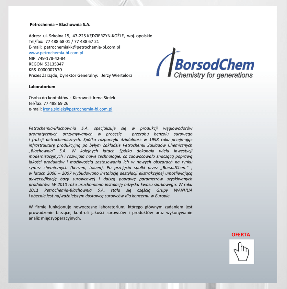Petrochemia – Blachownia S.A. Adres: ul. Szkolna 15, 47-225 KĘDZIERZYN-KOŹLE, woj. opolskie Tel/fax: 77 488 68 01 / 77 488 67 21 E-mail: [email protected] www.petrochemia-bl.com.pl NIP 749-178-42-84 REGON 53135347 KRS 0000007570 Prezes Zarządu, Dyrektor Generalny: Jerzy Wiertelorz Laboratorium Osoba do kontaktów : Kierownik Irena Siołek tel/fax: 77 488 69 26 e-mail: [email protected] Petrochemia-Blachownia S.A. specjalizuje się w produkcji węglowodorów aromatycznych otrzymywanych w procesie przerobu benzolu surowego i frakcji petrochemicznych. Spółka rozpoczęła działalność w 1998 roku przejmując infrastrukturę produkcyjną po byłym Zakładzie Petrochemii Zakładów Chemicznych „Blachownia” S.A. W kolejnych latach Spółka dokonała wielu inwestycji modernizacyjnych i rozwijała nowe technologie, co zaowocowało znaczącą poprawą jakości produktów i możliwością zastosowania ich w nowych obszarach na rynku syntez chemicznych (benzen, toluen). Po przejęciu spółki przez „BorsodChem” , w latach 2006 – 2007 wybudowano instalację destylacji ekstrakcyjnej umożliwiającą dywersyfikację bazy surowcowej i dalszą poprawę parametrów uzyskiwanych produktów. W 2010 roku uruchomiono instalację odzysku kwasu siarkowego. W roku 2011 Petrochemia-Blachownia S.A. stała się częścią Grupy WANHUA i obecnie jest najważniejszym dostawcą surowców dla koncernu w Europie. W firmie funkcjonuje nowoczesne laboratorium, którego głównym zadaniem jest prowadzenie bieżącej kontroli jakości surowców i produktów oraz wykonywanie analiz międzyoperacyjnych. OFERTA