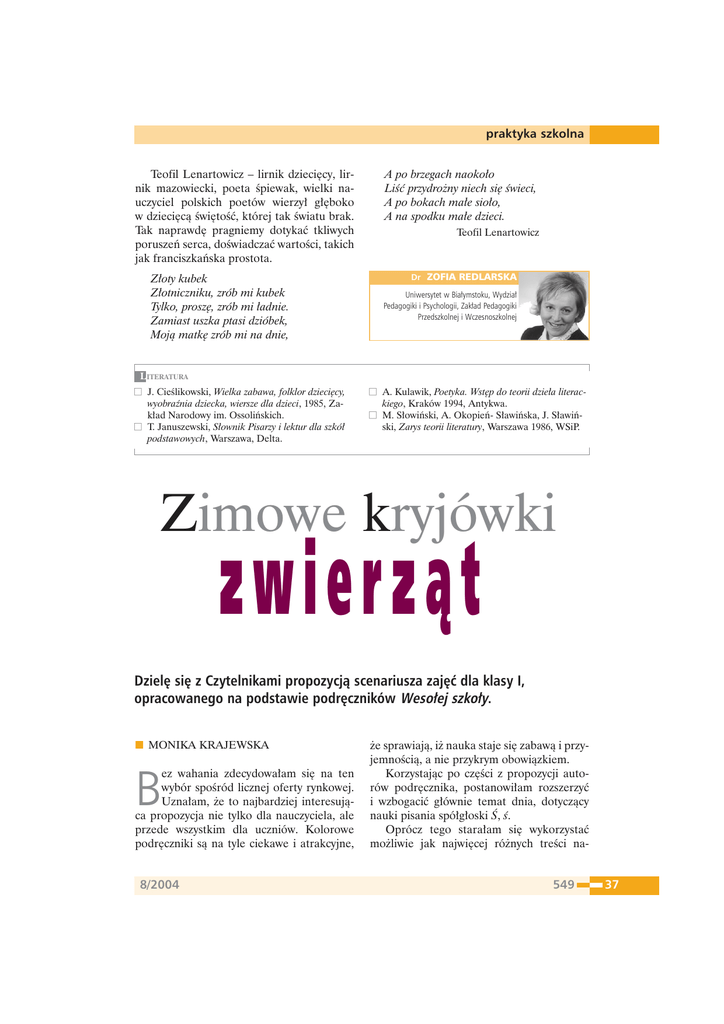 praktyka szkolna A po brzegach naoko∏o LiÊç przydro˝ny niech si´ Êwieci, A po bokach ma∏e sio∏o, A na spodku ma∏e dzieci. Teofil Lenartowicz – lirnik dzieci´cy, lirnik mazowiecki, poeta Êpiewak, wielki nauczyciel polskich poetów wierzy∏ g∏´boko w dzieci´cà Êwi´toÊç, której tak Êwiatu brak. Tak naprawd´ pragniemy dotykaç tkliwych poruszeƒ serca, doÊwiadczaç wartoÊci, takich jak franciszkaƒska prostota. Teofil Lenartowicz Dr ZOFIA REDLARSKA Z∏oty kubek Z∏otniczniku, zrób mi kubek Tylko, prosz´, zrób mi ∏adnie. Zamiast uszka ptasi dzióbek, Mojà matk´ zrób mi na dnie, Uniwersytet w Bia∏ymstoku, Wydzia∏ Pedagogiki i Psychologii, Zak∏ad Pedagogiki Przedszkolnej i Wczesnoszkolnej L ITERATURA J. CieÊlikowski, Wielka zabawa, folklor dzieci´cy, wyobraênia dziecka, wiersze dla dzieci, 1985, Zak∏ad Narodowy im. Ossoliƒskich. T. Januszewski, S∏ownik Pisarzy i lektur dla szkó∏ podstawowych, Warszawa, Delta. A. Kulawik, Poetyka. Wst´p do teorii dzie∏a literackiego, Kraków 1994, Antykwa. M. S∏owiƒski, A. Okopieƒ- S∏awiƒska, J. S∏awiƒski, Zarys teorii literatury, Warszawa 1986, WSiP. Zimowe kryjówki zwierzàt Dziel´ si´ z Czytelnikami propozycjà scenariusza zaj´ç dla klasy I, opracowanego na podstawie podr´czników Weso∏ej szko∏y. ■ MONIKA KRAJEWSKA B ez wahania zdecydowa∏am si´ na ten wybór spoÊród licznej oferty rynkowej. Uzna∏am, ˝e to najbardziej interesujàca propozycja nie tylko dla nauczyciela, ale przede wszystkim dla uczniów. Kolorowe podr´czniki sà na tyle ciekawe i atrakcyjne, 42 8/2004 ˝e sprawiajà, i˝ nauka staje si´ zabawà i przyjemnoÊcià, a nie przykrym obowiàzkiem. Korzystajàc po cz´Êci z propozycji autorów podr´cznika, postanowi∏am rozszerzyç i wzbogaciç g∏ównie temat dnia, dotyczàcy nauki pisania spó∏g∏oski Â, Ê. Oprócz tego stara∏am si´ wykorzystaç mo˝liwie jak najwi´cej ró˝nych treÊci na- 549 37 praktyka szkolna uczania blokowego. W wiadomoÊci polonistyczne wplot∏am wiedz´ z zakresu przyrody, matematyki, muzyki, plastyki z elementami techniki i ruchu. Mam nadziej´, ˝e tego typu korelacja wiadomoÊci pozwoli uczniowi mo˝liwie jak najlepiej przyswoiç wiedz´, doÊwiadczyç pewnych zdarzeƒ, a przede wszystkim dobrze si´ przy tym bawiç. Kràg tematyczny: Pomagamy zwierz´tom przetrwaç zim´. Temat dnia: Zimowe kryjówki zwierzàt. TreÊci dzia∏aƒ edukacyjnych: – rozszerzanie czynnego s∏ownictwa poprzez wypowiedzi uczniów na temat: Co zwierz´ta robià zimà? – wdra˝anie do uwa˝nego s∏uchania opowiadania nauczyciela i czytanego tekstu, – wdra˝anie do g∏oÊnego czytania z podzia∏em na role, – zdania pytajàce i oznajmujàce (wyjaÊnienie znaczenia znaków interpunkcyjnych), – wprowadzenie spó∏g∏oski mi´kkiej Â, Ê na podstawie wyrazu Êlimak, – analiza i synteza wyrazów z Ê w ró˝nych pozycjach oraz podpisywanie nimi obrazków, – rytmiczne odczytywanie zdania (wartoÊci nut (e, q), – rozwiàzywanie zagadek (labirynty, list, zgadywanki), – usprawnianie umiej´tnoÊci pos∏ugiwania si´ no˝yczkami, – dok∏adnoÊç, estetyka przy wykonywaniu pracy plastyczno-technicznej „Wiszàce Êlimaki”, – odejmowanie liczb w zakresie 10. Cele operacyjne: Uczeƒ: – wypowiada si´ ca∏ymi zdaniami, wzbogaca s∏ownictwo, – s∏ucha historyjki nauczyciela, wiersza oraz czytanego tekstu opowiadania, – czyta g∏oÊno z podzia∏em na role, – potrafi odszukaç literk´ Â, Ê i poprawnie zapisaç jà w liniaturze, – potrafi dokonaç analizy i syntezy wyrazów z Ê w ró˝nych pozycjach, 38 550 – potrafi odpowiednio dobraç wyrazy i podpisaç nimi obrazki, – umie rytmicznie odczytaç zdanie, ze zwróceniem uwagi na wartoÊci nut (e, q), – wykonuje prac´ plastyczno-technicznà starannie, na miar´ swoich mo˝liwoÊci, – potrafi dokonaç obliczeƒ w zakresie 10, – potrafi u∏o˝yç treÊç zadania do rysunku. Metody i formy pracy: podajàca, problemowa, praktyczna, zbiorowa i indywidualna. Ârodki dydaktyczne: podr´cznik do klasy I – Weso∏a szko∏a, karty pracy do podr´cznika, zeszyt dodatkowy, muszla Êlimaka, lustro, list Êlimaka do w´˝a, gazety, rysunki labirynty, Zagadki dla najm∏odszych – J. Stec, Szed∏ czarodziej – antologia wierszy dla dzieci – W. Kot, klej, no˝yczki, kredki, nici, taÊma samoprzylepna – niezb´dne do wykonania Êlimaka. Wprowadzenie do zaj´ç Gdy jecha∏am do szko∏y, przez ma∏o ucz´szczanà ulic´ przebieg∏ szary zajàczek. Wyglàda∏ na bardzo zmarzni´tego i g∏odnego. Zimowa pora nie jest korzystna dla leÊnych zwierzàt. Co zwierz´ta robià zimà? Jak przygotowujà si´ do snu? Nauczyciel podaje uczniom informacje, jako ciekawostki (dotyczà rodzaju snu). Hibernacja to wy∏àczenie termoregulacji, temperatura cia∏a spada czasami prawie do 0°C. Wszelkie przemiany metaboliczne ulegajà spowolnieniu, np. mniejsza cz´stotliwoÊç oddechu i uderzeƒ serca (u je˝a z 200 do 20 uderzeƒ na minut´). Przyk∏ady zwierzàt (rysunki) zapadajàcych w hibernacj´: nietoperz, Êwistak, suse∏, je˝, orzesznica (wi´ksza myszka z puchatym ogonkiem). Sen l˝ejszy – z którego nast´puje co jakiÊ czas przebudzenie, zale˝nie od temperatury. Gdy na dworze ociepli si´, zwierz´ta wychodzà, by ponownie u∏o˝yç si´ do snu. Przyk∏ady zwierzàt (ilustracje): niedêwiedê, borsuk, wiewiórka. Sen zale˝y od tego, jak przebiega zima. Przed snem zwierz´ta du˝o jedzà, ulegajà ot∏uszczeniu i z tych zapasów korzystajà zimà. A jak Êlimak przygotowuje swój domek? ˚ycie Szko∏y 43 praktyka szkolna Odpowiedzi uczniów na podstawie tekstu czytanego przez nauczyciela. Wyodr´bnienie wyrazu – Êlimak Prezentacja du˝ej muszli Êlimaka. Podzia∏ wyrazu na sylaby, g∏oski (uderzanie w d∏onie, krótkie wypowiadanie g∏oski Ê). Nauka pisania liter: Â, Ê. Nauczyciel opowiada historyjk´ dotyczàcà pisania litery Ê. Pewn