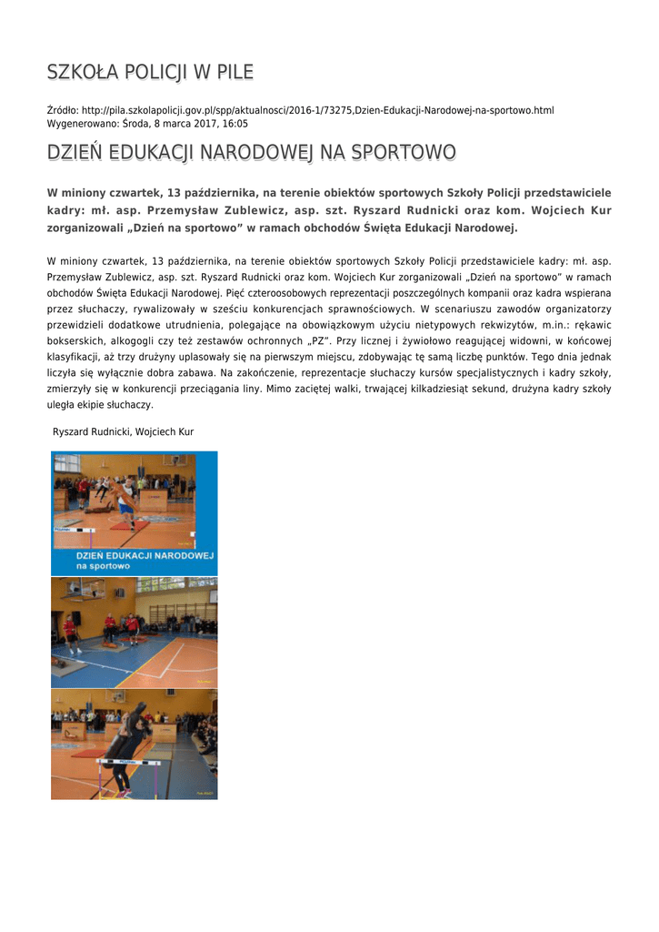 SZKOŁA POLICJI W PILE Źródło: http://pila.szkolapolicji.gov.pl/spp/aktualnosci/2016-1/73275,Dzien-Edukacji-Narodowej-na-sportowo.html Wygenerowano: Środa, 8 marca 2017, 16:05 DZIEŃ EDUKACJI NARODOWEJ NA SPORTOWO W miniony czwartek, 13 października, na terenie obiektów sportowych Szkoły Policji przedstawiciele kadry: mł. asp. Przemysław Zublewicz, asp. szt. Ryszard Rudnicki oraz kom. Wojciech Kur zorganizowali „Dzień na sportowo” w ramach obchodów Święta Edukacji Narodowej. W miniony czwartek, 13 października, na terenie obiektów sportowych Szkoły Policji przedstawiciele kadry: mł. asp. Przemysław Zublewicz, asp. szt. Ryszard Rudnicki oraz kom. Wojciech Kur zorganizowali „Dzień na sportowo” w ramach obchodów Święta Edukacji Narodowej. Pięć czteroosobowych reprezentacji poszczególnych kompanii oraz kadra wspierana przez słuchaczy, rywalizowały w sześciu konkurencjach sprawnościowych. W scenariuszu zawodów organizatorzy przewidzieli dodatkowe utrudnienia, polegające na obowiązkowym użyciu nietypowych rekwizytów, m.in.: rękawic bokserskich, alkogogli czy też zestawów ochronnych „PZ”. Przy licznej i żywiołowo reagującej widowni, w końcowej klasyfikacji, aż trzy drużyny uplasowały się na pierwszym miejscu, zdobywając tę samą liczbę punktów. Tego dnia jednak liczyła się wyłącznie dobra zabawa. Na zakończenie, reprezentacje słuchaczy kursów specjalistycznych i kadry szkoły, zmierzyły się w konkurencji przeciągania liny. Mimo zaciętej walki, trwającej kilkadziesiąt sekund, drużyna kadry szkoły uległa ekipie słuchaczy. Ryszard Rudnicki, Wojciech Kur Ocena: 5/5 (1) Tweetnij