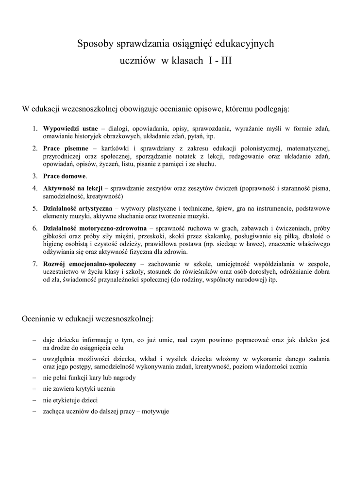 Sposoby sprawdzania osiągnięć edukacyjnych uczniów w klasach I
