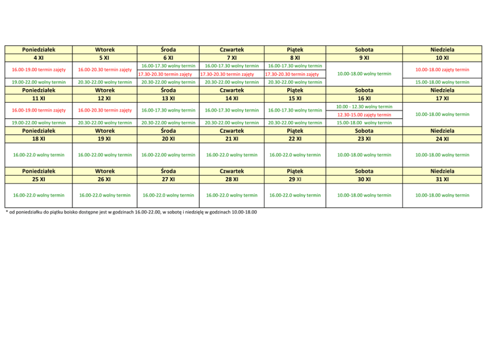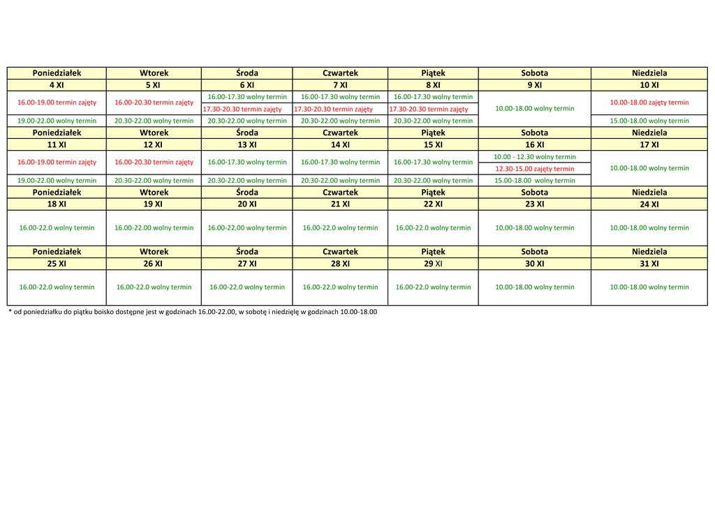 Poniedziałek 4 XI Wtorek 5 XI Środa 6 XI 16.00-19.00 termin zajęty 16.00-20.30 termin zajęty 19.00-22.00 wolny termin 20.30-22.00 wolny termin 20.30-22.00 wolny termin 20.30-22.00 wolny termin 20.30-22.00 wolny termin Poniedziałek 11 XI Wtorek 12 XI Środa 13 XI Czwartek 14 XI Piątek 15 XI 16.00-19.00 termin zajęty 16.00-20.30 termin zajęty 16.00-17.30 wolny termin 16.00-17.30 wolny termin 16.00-17.30 wolny termin 19.00-22.00 wolny termin 20.30-22.00 wolny termin 20.30-22.00 wolny termin 20.30-22.00 wolny termin 20.30-22.00 wolny termin 15.00-18.00 wolny termin Poniedziałek 18 XI Wtorek 19 XI Środa 20 XI Czwartek 21 XI Piątek 22 XI Sobota 23 XI Niedziela 24 XI 16.00-22.0 wolny termin 16.00-22.00 wolny termin 16.00-22.00 wolny termin 16.00-22.0 wolny termin 16.00-22.0 wolny termin 10.00-18.00 wolny termin 10.00-18.00 wolny termin Poniedziałek 25 XI Wtorek 26 XI Środa 27 XI Czwartek 28 XI Piątek 29 XI Sobota 30 XI Niedziela 31 XI 16.00-22.0 wolny termin 16.00-22.0 wolny termin 16.00-22.0 wolny termin 16.00-22.0 wolny termin 16.00-22.0 wolny termin 10.00-18.00 wolny termin 10.00-18.00 wolny termin 16.00-17.30 wolny termin 17.30-20.30 termin zajęty Czwartek listopad 7 XI 16.00-17.30 wolny termin 17.30-20.30 termin zajęty * od poniedziałku do piątku boisko dostępne jest w godzinach 16.00-22.00, w sobotę i niedzięlę w godzinach 10.00-18.00 Piątek 8 XI Sobota 9 XI 16.00-17.30 wolny termin 17.30-20.30 termin zajęty 10.00-18.00 wolny termin Niedziela 10 XI 10.00-18.00 zajęty termin 15.00-18.00 wolny termin Sobota 16 XI Niedziela 17 XI 10.00 - 12.30 wolny termin 12.30-15.00 zajęty termin 10.00-18.00 wolny termin