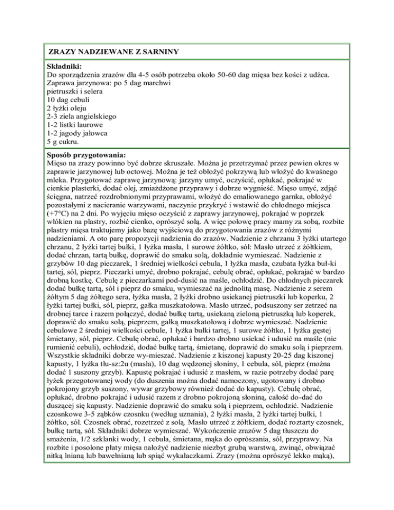 ZRAZY NADZIEWANE Z SARNINY Składniki: Do sporządzenia zrazów dla 4-5 osób potrzeba około 50-60 dag mięsa bez kości z udźca. Zaprawa jarzynowa: po 5 dag marchwi pietruszki i selera 10 dag cebuli 2 łyżki oleju 2-3 ziela angielskiego 1-2 listki laurowe 1-2 jagody jałowca 5 g cukru. Sposób przygotowania: Mięso na zrazy powinno być dobrze skruszałe. Można je przetrzymać przez pewien okres w zaprawie jarzynowej lub octowej. Można je też obłożyć pokrzywą lub włożyć do kwaśnego mleka. Przygotować zaprawę jarzynową: jarzyny umyć, oczyścić, opłukać, pokrajać w cienkie plasterki, dodać olej, zmiażdżone przyprawy i dobrze wygnieść. Mięso umyć, zdjąć ścięgna, natrzeć rozdrobnionymi przyprawami, włożyć do emaliowanego garnka, obłożyć pozostałymi z nacieranie warzywami, naczynie przykryć i wstawić do chłodnego miejsca (+7°C) na 2 dni. Po wyjęciu mięso oczyścić z zaprawy jarzynowej, pokrajać w poprzek włókien na plastry, rozbić cienko, oprószyć solą. A więc połowę pracy mamy za sobą, rozbite plastry mięsa traktujemy jako bazę wyjściową do przygotowania zrazów z różnymi nadzieniami. A oto parę propozycji nadzienia do zrazów. Nadzienie z chrzanu 3 łyżki utartego chrzanu, 2 łyżki tartej bułki, 1 łyżka masła, 1 surowe żółtko, sól: Masło utrzeć z żółtkiem, dodać chrzan, tartą bułkę, doprawić do smaku solą, dokładnie wymieszać. Nadzienie z grzybów 10 dag pieczarek, 1 średniej wielkości cebula, 1 łyżka masła, czubata łyżka buł-ki tartej, sól, pieprz. Pieczarki umyć, drobno pokrajać, cebulę obrać, opłukać, pokrajać w bardzo drobną kostkę. Cebulę z pieczarkami pod-dusić na maśle, ochłodzić. Do chłodnych pieczarek dodać bułkę tartą, sól i pieprz do smaku, wymieszać na jednolitą masę. Nadzienie z serem żółtym 5 dag żółtego sera, łyżka masła, 2 łyżki drobno usiekanej pietruszki lub koperku, 2 łyżki tartej bułki, sól, pieprz, gałka muszkatołowa. Masło utrzeć, podsuszony ser zetrzeć na drobnej tarce i razem połączyć, dodać bułkę tartą, usiekaną zieloną pietruszką lub koperek, doprawić do smaku solą, pieprzem, gałką muszkatołową i dobrze wymieszać. Nadzienie cebulowe 2 średniej wielkości cebule, 1 łyżka bułki tartej, 1 surowe żółtko, 1 łyżka gęstej śmietany, sól, pieprz. Cebulę obrać, opłukać i bardzo drobno usiekać i udusić na maśle (nie rumienić cebuli), ochłodzić, dodać bułkę tartą, śmietanę, doprawić do smaku solą i pieprzem. Wszystkie składniki dobrze wy-mieszać. Nadzienie z kiszonej kapusty 20-25 dag kiszonej kapusty, 1 łyżka tłu-sz:2u (masła), 10 dag wędzonej słoniny, 1 cebula, sól, pieprz (można dodać 1 suszony grzyb). Kapustę pokrajać i udusić z masłem, w razie potrzeby dodać parę łyżek przegotowanej wody (do duszenia można dodać namoczony, ugotowany i drobno pokrojony grzyb suszony, wywar grzybowy również dodać do kapusty). Cebulę obrać, opłukać, drobno pokrajać i udusić razem z drobno pokrojoną słoniną, całość do-dać do duszącej się kapusty. Nadzienie doprawić do smaku solą i pieprzem, ochłodzić. Nadzienie czosnkowe 3-5 ząbków czosnku (według uznania), 2 łyżki masła, 2 łyżki tartej bułki, 1 żółtko, sól. Czosnek obrać, rozetrzeć z solą. Masło utrzeć z żółtkiem, dodać roztarty czosnek, bułkę tartą, sól. Składniki dobrze wymieszać. Wykończenie zrazów 5 dag tłuszczu do smażenia, 1/2 szklanki wody, 1 cebula, śmietana, mąka do oprószania, sól, przyprawy. Na rozbite i posolone płaty mięsa nałożyć nadzienie niezbyt grubą warstwą, zwinąć, obwiązać nitką lnianą lub bawełnianą lub spiąć wykałaczkami. Zrazy (można oprószyć lekko mąką), obsmażyć na tłuszczu i całość przełożyć do rondla, dodać wodę (lub wywar), naczynie przykryć i dusić na małym ogniu. W razie potrzeby wyparowany sos uzupełniać wrzącą wodą. Do duszących się zrazów można dodać drobno pokrojoną cebulę lub główny składnik nadzienia, trochę ziół do smaku (ziele angielskie, majeranek, jałowiec itp.). Sos można zagęścić dodatkowo mąką, doprawić śmietaną. Do zrazów można podać kaszę gryczaną, pyzy, kluski, knedle lub ziemniaki z do-datkiem jarzyn gotowanych (np. buraczków), surówek i sałatek jarzynowych.