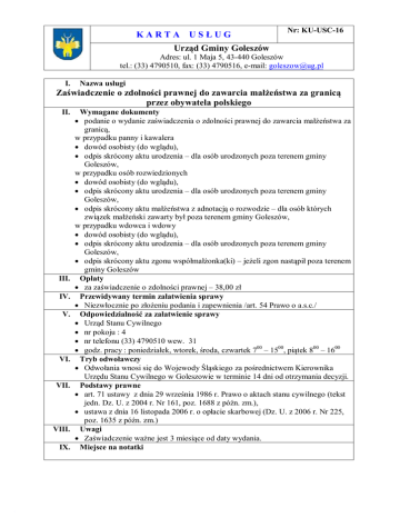 KARTA USŁUG Nr: KU-USC-16 Urząd Gminy Goleszów Adres: ul. 1 Maja 5, 43-440 Goleszów tel.: (33) 4790510, fax: (33) 4790516, e-mail: [email protected] I. Nazwa usługi Zaświadczenie o zdolności prawnej do zawarcia małżeństwa za granicą przez obywatela polskiego II. III. IV. V. VI. VII. VIII. IX. Wymagane dokumenty • podanie o wydanie zaświadczenia o zdolności prawnej do zawarcia małżeństwa za granicą, w przypadku panny i kawalera • dowód osobisty (do wglądu), • odpis skrócony aktu urodzenia – dla osób urodzonych poza terenem gminy Goleszów, w przypadku osób rozwiedzionych • dowód osobisty (do wglądu), • odpis skrócony aktu urodzenia – dla osób urodzonych poza terenem gminy Goleszów, • odpis skrócony aktu małżeństwa z adnotacją o rozwodzie – dla osób których związek małżeński zawarty był poza terenem gminy Goleszów, w przypadku wdowca i wdowy • dowód osobisty (do wglądu), • odpis skrócony aktu urodzenia – dla osób urodzonych poza terenem gminy Goleszów, • odpis skrócony aktu zgonu współmałżonka(ki) – jeżeli zgon nastąpił poza terenem gminy Goleszów Opłaty • za zaświadczenie o zdolności prawnej – 38,00 zł Przewidywany termin załatwienia sprawy • Niezwłocznie po złożeniu podania i zapewnienia /art. 54 Prawo o a.s.c./ Odpowiedzialność za załatwienie sprawy • Urząd Stanu Cywilnego • nr pokoju : 4 • nr telefonu (33) 4790510 wew. 31 • godz. pracy : poniedziałek, wtorek, środa, czwartek 700 – 1500, piątek 800 – 1600 Tryb odwoławczy • Odwołania wnosi się do Wojewody Śląskiego za pośrednictwem Kierownika Urzędu Stanu Cywilnego w Goleszowie w terminie 14 dni od otrzymania decyzji. Podstawy prawne • art. 71 ustawy z dnia 29 września 1986 r. Prawo o aktach stanu cywilnego (tekst jedn. Dz. U. z 2004 r. Nr 161, poz. 1688 z późn. zm.), • ustawa z dnia 16 listopada 2006 r. o opłacie skarbowej (Dz. U. z 2006 r. Nr 225, poz. 1635 z późn. zm.) Uwagi • Zaświadczenie ważne jest 3 miesiące od daty wydania. Miejsce na notatki