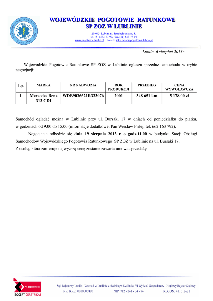WOJEWÓDZKIE POGOTOWIE RATUNKOWE SP ZOZ W LUBLINIE 20-043 Lublin, ul. Spadochroniarzy 8, tel. (81) 533-77-90, fax. (81) 533-78-00 www.pogotowie.lublin.pl e-mail: [email protected] Lublin 6 sierpień 2013r. Wojewódzkie Pogotowie Ratunkowe SP ZOZ w Lublinie ogłasza sprzedaż samochodu w trybie negocjacji: Lp. MARKA NR NADWOZIA ROK PRODUKCJI PRZEBIEG CENA WYWOŁAWCZA 1. Mercedes Benz 313 CDI WDB9036621R323076 2001 348 651 km 5 178,00 zł Samochód oglądać można w Lublinie przy ul. Bursaki 17 w dniach od poniedziałku do piątku, w godzinach od 9.00 do 15.00 (informacje dodatkowe: Pan Wiesław Firlej, tel. 662 163 792). Negocjacja odbędzie się dnia 19 sierpnia 2013 r. o godz.11.00 w budynku Stacji Obsługi Samochodów Wojewódzkiego Pogotowia Ratunkowego SP ZOZ w Lublinie na ul. Bursaki 17. Z osobą, która zaoferuje najwyższą cenę zostanie zawarta umowa sprzedaży.