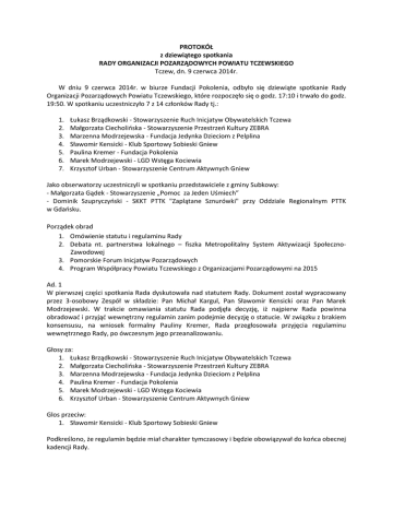 PROTOKÓŁ z dziewiątego spotkania RADY ORGANIZACJI POZARZĄDOWYCH POWIATU TCZEWSKIEGO Tczew, dn. 9 czerwca 2014r. W dniu 9 czerwca 2014r. w biurze Fundacji Pokolenia, odbyło się dziewiąte spotkanie Rady Organizacji Pozarządowych Powiatu Tczewskiego, które rozpoczęło się o godz. 17:10 i trwało do godz. 19:50. W spotkaniu uczestniczyło 7 z 14 członków Rady tj.: 1. 2. 3. 4. 5. 6. 7. Łukasz Brządkowski - Stowarzyszenie Ruch Inicjatyw Obywatelskich Tczewa Małgorzata Ciecholińska - Stowarzyszenie Przestrzeń Kultury ZEBRA Marzenna Modrzejewska - Fundacja Jedynka Dzieciom z Pelplina Sławomir Kensicki - Klub Sportowy Sobieski Gniew Paulina Kremer - Fundacja Pokolenia Marek Modrzejewski - LGD Wstęga Kociewia Krzysztof Urban - Stowarzyszenie Centrum Aktywnych Gniew Jako obserwatorzy uczestniczyli w spotkaniu przedstawiciele z gminy Subkowy: - Małgorzata Gądek - Stowarzyszenie „Pomoc za Jeden Uśmiech” - Dominik Szupryczyński - SKKT PTTK "Zaplątane Sznurówki" przy Oddziale Regionalnym PTTK w Gdańsku. Porządek obrad 1. Omówienie statutu i regulaminu Rady 2. Debata nt. partnerstwa lokalnego – fiszka Metropolitalny System Aktywizacji SpołecznoZawodowej 3. Pomorskie Forum Inicjatyw Pozarządowych 4. Program Współpracy Powiatu Tczewskiego z Organizacjami Pozarządowymi na 2015 Ad. 1 W pierwszej części spotkania Rada dyskutowała nad statutem Rady. Dokument został wypracowany przez 3-osobowy Zespół w składzie: Pan Michał Kargul, Pan Sławomir Kensicki oraz Pan Marek Modrzejewski. W trakcie omawiania statutu Rada podjęła decyzję, iż najpierw Rada powinna obradować i przyjąć wewnętrzny regulamin zanim podejmie decyzję o statucie. W związku z brakiem konsensusu, na wniosek formalny Pauliny Kremer, Rada przegłosowała przyjęcia regulaminu wewnętrznego Rady, po ówczesnym jego przeanalizowaniu. Głosy za: 1. Łukasz Brządkowski - Stowarzyszenie Ruch Inicjatyw Obywatelskich Tczewa 2. Małgorzata Ciecholińska - Stowarzyszenie Przestrzeń Kultury ZEBRA 3. Marzenna Modrzejewska - Fundacja Jedynka Dzieciom z Pelplina 4. Paulina Kremer - Fundacja Pokolenia 5. Marek Modrzejewski - LGD Wstęga Kociewia 6. Krzysztof Urban - Stowarzyszenie Centrum Aktywnych Gniew Glos przeciw: 1. Sławomir Kensicki - Klub Sportowy Sobieski Gniew Podkreślono, że regulamin będzie miał charakter tymczasowy i będzie obowiązywał do końca obecnej kadencji Rady. Zgodnie z nowo przyjętym regulaminem Rada wybrała sekretarza Rady i został nim Pan Grzegorz Pawlikowski. Głosy za: 1. Łukasz Brządkowski - Stowarzyszenie Ruch Inicjatyw Obywatelskich Tczewa 2. Małgorzata Ciecholińska - Stowarzyszenie Przestrzeń Kultury ZEBRA 3. Marzenna Modrzejewska - Fundacja Jedynka Dzieciom z Pelplina 4. Paulina Kremer - Fundacja Pokolenia 5. Marek Modrzejewski - LGD Wstęga Kociewia 6. Krzysztof Urban - Stowarzyszenie Centrum Aktywnych Gniew Glos wstrzymujący się: 1. Sławomir Kensicki - Klub Sportowy Sobieski Gniew W kolejnej części spotkania Rada powróciła do omawiania statutu Rady. Dyskutowano nad systemem wyboru członków do Rady. Pan Sławomir Kensicki zaproponował by organizacje z danej gminy typowały po 2-óch przedstawicieli organizacji ze swojego terenu, 11 osób miałoby pochodzić z ogólnych, powiatowych wyborów, 2 osoby miałby być delegowane z Powiatowej Rady Działalności Pożytku Publicznego. Łącznie w Radzie zasiadałoby 25 osób. Ponadto jeśli jakaś osoba zasiadałaby w ciele ponad powiatowym to wchodziłaby automatycznie do Rady. Zgłoszona propozycja nie budziła większego sprzeciwu, jednakże na wniosek Pana Marka Modrzejewskiego ustalono, że Rada będzie jeszcze pracowała nad statutem i nie zostanie on na dzisiejszym spotkaniu przyjęty. Ustalono, że do kolejnego spotkania członkowie Rady mają przesłać swoje uwagi mailowo. Ad. 2 Pani Paulina Kremer przedstawiła zmiany jakie nastąpiły w fiszce Metropolitalny System Aktywizacji Społeczno-Zawodowej – większe ukierunkowanie na aktywizację zawodową biernych zawodowo, wykluczonych i zagrożonych wykluczeniem zawodowym. Ponadto Pani Paulina omówiła na jakim etapie jest proces konsultacji fiszki i samego partnerstwa z lokalnymi samorządami (gmina miejska i wiejska Tczew oraz powiat tczewski). Na obecnym etapie nie widać zagrożenia dla budowy partnerstwa. Trzon partnerstwa będzie wąski (składał się z kilku podmiotów), jednakże z zastrzeżeniem, iż po jego powołaniu zostanie ono rozszerzone o inne organizacje i podmioty. Ad. 3 W związku z procedurą zgłaszania uczestników na Pomorskie Forum Inicjatyw Pozarządowych Rada wytypowała 5 osób do uczestnictwa w tym wydarzeniu: Pani Małgorzata Ciecholińska, Pan Sławomir Kensicki, Pani Paulina Kremer, Pan Rafał Kwiatkowski (zgłoszony przez Pana Sławomira Kensickiego) oraz Pan Grzegorz Pawlikowski. Były to jedyne chętne osoby. Ad. 4 Rada ustaliła, że każdy z członków Rady w miarę swoich możliwości prześle drogą mailową swoje uwagi do Programu Współpracy Powiatu Tczewskiego z Organizacjami Pozarządowymi na 2015 do 26.06.2014r. Panu Grzegorzowi Pawlikowskiemu. Całość uwag zostanie przekazana 30.06.2014r. na spotkaniu z Powiatową Radą Działalności Pożytku Publicznego. Rada ustaliła kolejne spotkanie na 30.06.2014r. i ma ono odbyć się w połączeniu z Powiatową Radą Działalności Pożytku Publicznego. Godzina oraz miejsce spotkania zostanie przekazana drogą mailową. Na tym spotkanie zakończono. Protokołował Grzegorz Pawlikowski