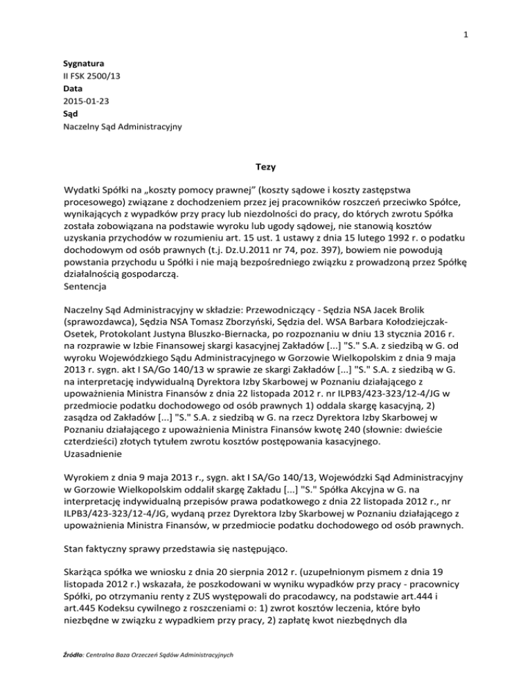 1 Sygnatura II FSK 2500/13 Data 2015-01-23 Sąd Naczelny Sąd Administracyjny Tezy Wydatki Spółki na „koszty pomocy prawnej” (koszty sądowe i koszty zastępstwa procesowego) związane z dochodzeniem przez jej pracowników roszczeń przeciwko Spółce, wynikających z wypadków przy pracy lub niezdolności do pracy, do których zwrotu Spółka została zobowiązana na podstawie wyroku lub ugody sądowej, nie stanowią kosztów uzyskania przychodów w rozumieniu art. 15 ust. 1 ustawy z dnia 15 lutego 1992 r. o podatku dochodowym od osób prawnych (t.j. Dz.U.2011 nr 74, poz. 397), bowiem nie powodują powstania przychodu u Spółki i nie mają bezpośredniego związku z prowadzoną przez Spółkę działalnością gospodarczą. Sentencja Naczelny Sąd Administracyjny w składzie: Przewodniczący - Sędzia NSA Jacek Brolik (sprawozdawca), Sędzia NSA Tomasz Zborzyński, Sędzia del. WSA Barbara KołodziejczakOsetek, Protokolant Justyna Bluszko-Biernacka, po rozpoznaniu w dniu 13 stycznia 2016 r. na rozprawie w Izbie Finansowej skargi kasacyjnej Zakładów [...] "S." S.A. z siedzibą w G. od wyroku Wojewódzkiego Sądu Administracyjnego w Gorzowie Wielkopolskim z dnia 9 maja 2013 r. sygn. akt I SA/Go 140/13 w sprawie ze skargi Zakładów [...] "S." S.A. z siedzibą w G. na interpretację indywidualną Dyrektora Izby Skarbowej w Poznaniu działającego z upoważnienia Ministra Finansów z dnia 22 listopada 2012 r. nr ILPB3/423-323/12-4/JG w przedmiocie podatku dochodowego od osób prawnych 1) oddala skargę kasacyjną, 2) zasądza od Zakładów [...] "S." S.A. z siedzibą w G. na rzecz Dyrektora Izby Skarbowej w Poznaniu działającego z upoważnienia Ministra Finansów kwotę 240 (słownie: dwieście czterdzieści) złotych tytułem zwrotu kosztów postępowania kasacyjnego. Uzasadnienie Wyrokiem z dnia 9 maja 2013 r., sygn. akt I SA/Go 140/13, Wojewódzki Sąd Administracyjny w Gorzowie Wielkopolskim oddalił skargę Zakładu [...] "S." Spółka Akcyjna w G. na interpretację indywidualną przepisów prawa podatkowego z dnia 22 listopada 2012 r., nr ILPB3/423-323/12-4/JG, wydaną przez Dyrektora Izby Skarbowej w Poznaniu działającego z upoważnienia Ministra Finansów, w przedmiocie podatku dochodowego od osób prawnych. Stan faktyczny sprawy przedstawia się następująco. Skarżąca spółka we wniosku z dnia 20 sierpnia 2012 r. (uzupełnionym pismem z dnia 19 listopada 2012 r.) wskazała, że poszkodowani w wyniku wypadków przy pracy - pracownicy Spółki, po otrzymaniu renty z ZUS występowali do pracodawcy, na podstawie art.444 i art.445 Kodeksu cywilnego z roszczeniami o: 1) zwrot kosztów leczenia, które było niezbędne w związku z wypadkiem przy pracy, 2) zapłatę kwot niezbędnych dla Źródło: Centralna Baza Orzeczeń Sądów Administracyjnych 2 przygotowania do wykonywania innego zawodu, 3) przyznanie tzw. renty wyrównawczej stanowiącej różnicę pomiędzy świadczeniem przyznanym przez ZUS z tytułu renty a wynagrodzeniem, które poszkodowani pracownicy mogliby uzyskiwać, gdyby ich dotychczasowe możliwości zarobkowania nie zostały ograniczone (całkowicie lub częściowo) wypadkiem przy pracy, 4) przyznanie jednorazowego odszkodowania, 5) zadośćuczynienie za doznaną krzywdę spowodowaną wypadkiem przy pracy. W związku ze zgłoszonymi przez pracowników roszczeniami i wszczynanymi przez nich postępowaniami sądowymi po stronie Spółki powstała konieczność: 6) skorzystania z usług profesjonalnego pełnomocnika dla prowadzenia ww. postępowań sądowych i reprezentowania jej w negocjacjach warunków ugody zawieranych z poszkodowanymi, 7) pokrycia kosztów pomocy prawnej świadczonej na rzecz osób występujących z roszczeniami wskazanymi w pkt 1-5. Strona wskazała, że przez "koszty pomocy prawnej" świadczonej na rzecz osób występujących z roszczeniami wskazanymi w pkt 1 - 5 rozumie koszty sądowe poniesione przez pracowników/poszkodowanych w celu dochodzenia praw i roszczeń wynikających z wypadku przy pracy lub niezdolności do pracy, do pokrycia których została zobligowana w postępowaniu sądowym lub w zawartej z pracownikiem/poszkodowanym ugodzie pozasądowej. Spółka zwróciła się do organu, z pytaniami czy powyższe wydatki stanowią koszty uzyskania przychodu w świetle art. 15 ust. 1 ustawy z dnia 15 lutego 1992 r. o podatku dochodowym od osób prawnych (t.j. Dz.U.2011 nr 74, poz. 397; dalej: u.p.d.o.p.). W opinii Spółki poniesione przez nią wydatki, o których mowa w pytaniach od 1 do 7, stanowią koszty uzyskania przychodu, albowiem wydatki te spełniają warunki uznania ich za koszty uzyskania przychodów; mają charakter definitywny (ich wysokość jest bowiem określona w wyrokach, ugodach), a także zostały należycie udokumentowane. Wydatki te pozostają również w związku z prowadzoną przez Spółkę działalnością - wynikają bowiem ze zdarzeń mających miejsce przy jej prowadzeniu. Dyrektor Izby Skarbowej w Poznaniu działający z upoważnienia Ministra Finansów w interpretacji indywidualnej z dnia 22 listopada 2012 r. uznał stanowisko strony za: nieprawidłowe - w części odnoszącej się do pokrycia kosztów pomocy prawnej świadczonej na rzecz osób występujących z roszczeniami wskazanymi w pkt 1-5 wniosku, oraz za prawidłowe - w pozostałym zakresie. Organ interpretacyjny stwierdził, że wydatki przedstawione w pkt 1-5 mogą stanowić dla Spółki koszty uzyskania przychodów na podstawie art.15 ust.1 u.p.d.o.p., jako wydatki związane z jej funkcjonowaniem, które poniesione zostały w celu zachowania (zabezpieczenia) źródła przychodów, z zastrzeżeniem, że koszty pokrycia kosztów pomocy prawnej świadczonej na rzecz osób występujących z roszczeniami wskazanymi w pkt 1-5 stanu faktycznego należy wyłączyć z kosztów podatkowych strony, jako wydatki niestanowiące kosztów uzyskania przychodów. Organ wskazał również, że kosztami uzyskania przychodów Spółki, będą także wydatki