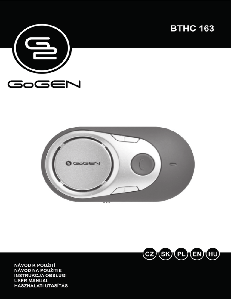 BTHC 163 NÁVOD K POUŽITÍ NÁVOD NA POUŽITIE INSTRUKCJA OBSŁUGI USER MANUAL HASZNÁLATI UTASÍTÁS DŮLEŽITÉ: Přečtěte si prosím před použitím návod a uschovejte jej k pozdějšímu využití. ÚVOD • Děkujeme vám za zakoupení tohoto výrobku. • Přečtěte si prosím tento návod k použití, abyste se dozvěděli, jak správně s přístrojem zacházet. Po přečtení návodu k použití jej uložte na bezpečné místo k možnému pozdějšímu využití. FUNKCE 1. Štíhlé osobité provedení s charakteristickou individualitou. 2. Přenos Bluetooth 4.0 – dobrá kvalita telefonování, hands-free a méně vyzařování z mobilního telefonu. 3. Funkce automatického odloženého vypnutí: zařízení se automaticky vypne po 10 minutách po odpojení od mobilního telefonu. 4. Unikátní funkce připojení dvou mobilních telefonů současně. POSTUP POUŽITÍ Při použití prosím dodržuje následující postup: Připojení pomocí funkce Bluetooth: Zapněte automobilovou sadu Bluetooth ”, dokud nezačne blikat modrá a stiskněte po dobu 3 až 4 vteřin tlačítko “ kontrolka. Poté vyhledejte zařízení „Gogen BTHC163“ a zadejte heslo „0000“, pokud bude vyžadováno. Vyčkejte asi 3 až 5 vteřin, spárování se úspěšně dokončí a kontrolka bude pomalu blikat. Funkce volání: V režimu Bluetooth zadejte číslo telefonu a můžete volat. Stisknutím tlačítka “ ” přijmete příchozí hovor, opětovným stisknutím zavěsíte. Pokud nechcete příchozí hovor přijmout, můžete stisknutím tlačítka “ po dobu 2 vteřin hovor odmítnout. Během hovoru můžete nastavit hlasitost pomocí tlačítek „+“ a „-”. CZ - 2 ” CZ Funkce dvou připojených telefonů zároveň: K zařízení lze připojit dva mobilní telefony najednou. Odpojte první spárovaný telefon a vypněte funkci Bluetooth. Znovu zapněte zařízení, přepněte do režimu párování a připojte druhý telefon. Poté otevřete nabídku Bluetooth prvního telefonu a zvolte “o o o” pro opětovné připojení. (Poznámka: Pokud máte připojeny dva telefony, nemůžete z nich volat zároveň.) Když je baterie vybitá, připojte automobilovou nabíječku. Rozsvítí se červená kontrolka. Po úplném nabití červená kontrolka zhasne. SPECIFIKACE Verze Bluetooth: Podpora protokolů: Dosah bezdrátového vysílání: Nabíjecí napětí: Doba nabíjení: Ztrátový výkon: Kapacita baterie: Battery Voltage: Impedance reproduktoru: Zkreslení reproduktoru: Délka hovoru: Frekvenční zkreslení: Výdrž v pohotovostním režimu: v4.0 + EDR HSP/HFP/AVRCP TŘÍDA II DC - 5 V 1,5 h 500 mA 300 mAH 3,7 - 4,2 V 4Ω/2W ±5 % MAX 5 h (při hlasitosti 2/3) <1 % více než 7 dnů Specifikace automobilové nabíječky Vstup: Výstup: Seznam příslušenství Automobilová sada 12 až 24 V; 240 až 120 mA 5 V; 500 mA Automobilová nabíječka CZ - 3 Kabel USB Změna technické specifikace výrobku vyhrazena výrobcem. LIKVIDACE NEPOTŘEBNÉHO ELEKTRICKÉHO ELEKTRONICKÉHO ZAŘÍZENÍ (PLATNÉ EVROPSKÉ UNII A V DALŠÍCH EVROPSKÝCH STÁTECH UPLATŇUJÍCÍCH ODDĚLENÝ SYSTÉM SBĚRU). Tento symbol umístěný na výrobku nebo jeho balení upozorňuje, že by s výrobkem po ukončení jeho životnosti nemělo být nakládáno jako s běžným odpadem z domácnosti. Je nutné ho odvézt do sběrného místa pro recyklaci elektrického a elektronického zařízení. Zajištěním správné likvidace tohoto výrobku pomůžete zabránit případným negativním dopadům na životní prostředí a lidské zdraví, které by jinak byly způsobeny nevhodnou likvidaci výrobku. Recyklováním materiálů, z nichž je vyroben, pomůžete ochránit přírodní zdroje. Podrobnější informace o recyklaci tohoto výrobku zjistíte u příslušného místního obecního úřadu, podniku pro likvidaci domovních odpadů nebo v obchodě, kde jste výrobek zakoupili. ETA a.s. tímto prohlašuje, že výrobek BTHC163 je ve shodě s evropskou směrnicí č. 1999/5/ES. Kompletní Prohlášení o shodě lze nalézt na stránkách http://www.gogen.cz/declaration_of_conformity NEBEZPEČÍ UDUŠENÍ. PE SÁČEK ODKLÁDEJTE MIMO DOSAH DĚTÍ. SÁČEK NENÍ NA HRANÍ. NEPOUŽÍVEJTE TENTO SÁČEK V KOLÉBKÁCH, POSTÝLKÁCH, KOČÁRCÍCH NEBO DĚTSKÝCH OHRÁDKÁCH. Informace o výrobku a servisní síti najdete na internetové adrese www.gogen.cz Záruka 24 měsíců se nevztahuje na snížení užitečné kapacity akumulátoru z důvodu jejího používání nebo stáří. Užitečná kapacita se snižuje v závislosti na způsobu používání akumulátoru. CZ - 4 SK DÔLEŽITÉ: Prečítajte si prosím pred použitím návod a uschovajte ho k neskoršiemu použitiu. DÔLEŽITÁ UPOZORNENIE • Ďakujeme Vám za zakúpenie tohto výrobku. • Prečítajte si prosím tento návod na použitie, aby ste sa dozvedeli, ako správne s prístrojom zachádzať. Po prečítaní návodu na použitie ho uložte na bezpečné miesto k možnému neskoršiemu využitiu. FUNKCIA 1. Štíhle osobité prevedenie s charakteristickou individualitou. 2. Prenos Bluetooth 4.0 - dobrá kvalita telefonovania, hands-free a menej vyžarovania z mobilného telefónu. 3. Funkcia automatického odloženého vypnutia: zariadenie sa automaticky vypne po 10 minútach po odpojení od mobilného telefónu. 4. Unikátna funkcia pripojenia dvoch mobilných telefónov súčasne. POSTUP POUŽITIA Pri použití prosím dodržiavajte nasledujúci postup: Pripojenie pomocou funkcie Bluetooth: Zapnite automobilovú sadu ”, až kým nezačne Bluetooth a stlačte po dobu 3 až 4 sekúnd tlačidlo “ blikať modrá kontrolka. Potom vyhľadajte zariadenia „Gogen BTHC163“ a zadajte heslo “0000”, ak bude vyžadované. Počkajte asi 3 až 5 sekúnd, spárovanie sa úspešne dokončí a kontrolka bude pomaly blikať. Funkcia volania: V režime Bluetooth zadajte číslo telefónu a môžete volať. Stlačením tlačidla “ 