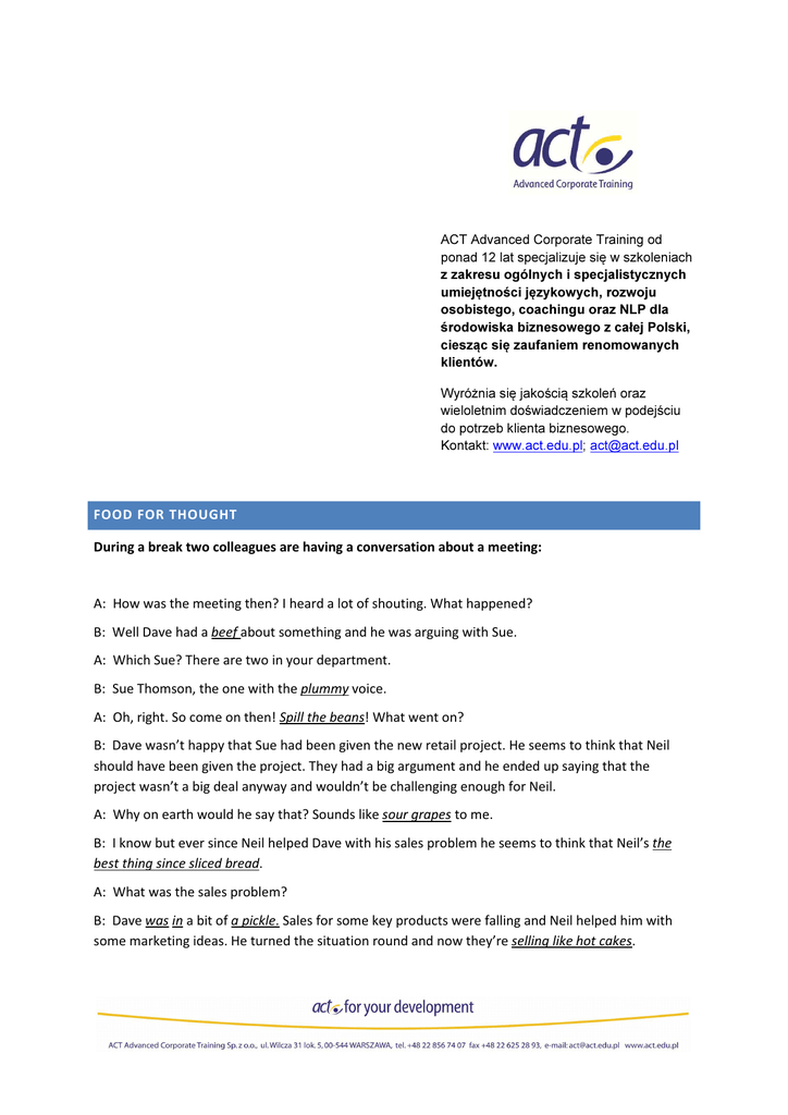 ACT Advanced Corporate Training od ponad 12 lat specjalizuje się w szkoleniach z zakresu ogólnych i specjalistycznych umiejętności językowych, rozwoju osobistego, coachingu oraz NLP dla środowiska biznesowego z całej Polski, ciesząc się zaufaniem renomowanych klientów. Wyróżnia się jakością szkoleń oraz wieloletnim doświadczeniem w podejściu do potrzeb klienta biznesowego. Kontakt: www.act.edu.pl; [email protected] FOOD FOR THOUGHT During a break two colleagues are having a conversation about a meeting: A: How was the meeting then? I heard a lot of shouting. What happened? B: Well Dave had a beef about something and he was arguing with Sue. A: Which Sue? There are two in your department. B: Sue Thomson, the one with the plummy voice. A: Oh, right. So come on then! Spill the beans! What went on? B: Dave wasn’t happy that Sue had been given the new retail project. He seems to think that Neil should have been given the project. They had a big argument and he ended up saying that the project wasn’t a big deal anyway and wouldn’t be challenging enough for Neil. A: Why on earth would he say that? Sounds like sour grapes to me. B: I know but ever since Neil helped Dave with his sales problem he seems to think that Neil’s the best thing since sliced bread. A: What was the sales problem? B: Dave was in a bit of a pickle. Sales for some key products were falling and Neil helped him with some marketing ideas. He turned the situation round and now they’re selling like hot cakes. A: Is that what Dave said? I’d take that with a pinch of salt if I were you. Neil doesn’t know the first thing about marketing. B: What are you implying? A: Let’s just say that Dave and Neil know each other from way back. I think there’s more to this than meets the eye. B: Well that’s interesting. You’ve given me some food for thought. Match the expressions from the dialogue with their definition in the table below. 1. a beef a. describes a voice or accent which sounds upper class 2. plummy b. to not completely believe sth you are told because you think it’s not true 3. spill the beans c. a complaint 4. sour grapes d. something excellent or outstanding 5. the best thing since sliced bread e. sell quickly and in large numbers 6. to be in a pickle f. 7. sell like hot cakes g. to make sb think seriously about something 8. take sth with a pinch of salt h. to be in a difficult situation 9. give sb food for thought i. to tell people secret information when you criticize sth simply because you can’t have it Key: 1-c, 2-a, 3-f, 4-i, 5-d, 6-h, 7-e, 8-b, 9-g --------------------------Graham McCabe jest trenerem języka angielskiego, z powodzeniem prowadzącym kursy biznesowe od ponad dziesięciu lat. Graham jest Szkotem z wykształceniem ekonomiczno-prawniczym oraz kwalifikacjami w zakresie nauczania języka angielskiego, potwierdzonymi dyplomem TEFL. Doświadczenie zdobywał pracując w Wielkiej Brytanii, Czechach, Izraelu, a od wielu lat również w Polsce. Współpracę z ACT rozpoczął w 2010 roku i w bardzo krótkim czasie stał się jednym z najbardziej pożądanych lektorów, cenionym za kompetencje, zorganizowanie oraz profesjonalizm.