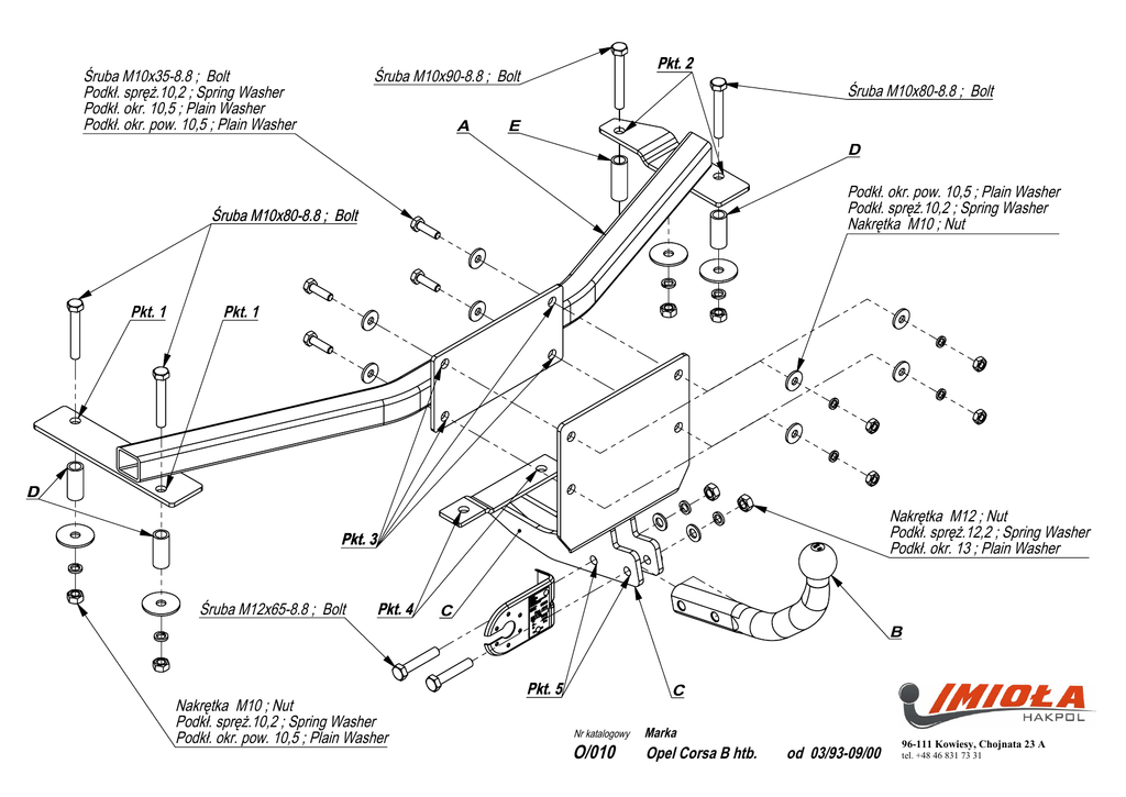 Śruba M10x35-8.8 ; Bolt Podkł. spręż.10,2 ; Spring Washer Podkł. okr. 10,5 ; Plain Washer Podkł. okr. pow. 10,5 ; Plain Washer Pkt. 2 Śruba M10x90-8.8 ; Bolt A Śruba M10x80-8.8 ; Bolt E D Podkł. okr. pow. 10,5 ; Plain Washer Podkł. spręż.10,2 ; Spring Washer Nakrętka M10 ; Nut Śruba M10x80-8.8 ; Bolt Pkt. 1 Pkt. 1 D Nakrętka M12 ; Nut Podkł. spręż.12,2 ; Spring Washer Podkł. okr. 13 ; Plain Washer Pkt. 3 Śruba M12x65-8.8 ; Bolt Pkt. 4 Nakrętka M10 ; Nut Podkł. spręż.10,2 ; Spring Washer Podkł. okr. pow. 10,5 ; Plain Washer C B Pkt. 5 C Nr katalogowy O/010 Marka Opel Corsa B htb. od 03/93-09/00 96-111 Kowiesy, Chojnata 23 A tel. +48 46 831 73 31 Gniazdo 7-biegunowe 12V z ruchomymi bolcami Symbol SWW 1135-812 Oznaczenie zacisku 31 L R 54 58L 58R + Zacisk do łączenia przewodów do masy pojazdu do świateł kierunku jazdy lewych do świateł kierunku jazdy prawych do świateł hamowania do świateł pozycyjnych lewych do świateł pozycyjnych prawych tylne światła przeciwmgłowe Moment skręcający dla śrub i nakrętek (8.8) Torgue settings for nuts and bolts (8.8) M8 25 Nm M12 M10 55 Nm M14 M16 195 Nm ZESTAW ŚRUBOWY: FASTENING MEANS: -M12x70 8.8 -M10x35 8.8 -M10x90 8.8 -M10x80 8.8 -M12 Kolory Biały , white Żółty , yellow zielony, green czerwony, red czarny, black brązowy, brown niebieski , blue 85 Nm 135 Nm OPEL CORSA B htb. 03/93 - 09/00 NR KAT. O/010 -M10 • • • • • • • • • 10szt -M12 2szt -M10 -M12 -M10 10szt 2szt 10szt − ∅ x36 6szt -1/2” x 60 1 szt -1/2” x 49 3 szt INSTRUKCJA MONTAŻU: FITTING INSTRUCTIONS: • • • • • 2szt 6szt 1szt 3szt 2szt Zdjąć zderzak. W tylnym pasie samochodu w miejscach fabrycznie zaznaczonych wykonać 4 otwory ø 10,5 (pkt 3). Włożyć belkę zaczepu A do bagażnika i poprzez wykonane otwory skręcić lekko z częścią zaczepu C śrubami M10x35 8.8 (pkt 3). W bagażniku na lewej i prawej podłużnicy, w miejscach fabrycznie zaznaczonych poprzez otwory w części zaczepu A (pkt 1 i 2) wykonać otwory ø 10,5. Umieścić w nich śruby M10x80 8.8 i M10x90 8.8. W technologiczne otwory od spodu podłużnic włożyć tuleje dystansowe D, umieścić nakładki i lekko przykręcić element zaczepu A. Poprzez otwory w elemencie zaczepu C (pkt 4) wykonać w koszu koła zapasowego dwa otwory ø 10,5. Skręcić śrubami M10x35 z nakładkami C od strony bagażnika. Dokręcić wszystkie śruby z momentem jak w tabeli. Podłączyć instalację elektryczną. Wyciąć dolną część zderzaka o wymiarach 50x15mm. Przykręcić zderzak. Przykręcić kulę oraz blachę gniazda elektrycznego. • • • • • • • • Disassemble the bumper. Drill the four holes ø 10,5 (point 3) in the rear belt of the car, in the marked places. Place the main bar A in the boot and screw slightly to the element C through the made holes with bolts M10x35 8.8 (point 3). Drill the holes ø 10,5 in the boot on the left and right metal clamps, in the marked places, through the holes in the element A (point 1 and 2). Insert the bolts M10x80 8.8 and M10x90 8.8 in these holes. Place distance sleeves D in the technological holes of the bottom of the metal clamps, insert plates and screw slightly element A. Drill two holes ø 10,5 in the basket of the spare wheel, through the holes in the element C (point 4). Screw with bolts M10x35 8.8 using plates C from the boot side. Tighten all the bolts according to the torque setting - see the table. Connect the electric wires. Cut out the fragment 50x15 in the lower part of the bumper. Assemble the bumper. Fix the ball and electric plate. WARUNKI EKSPLOATACJI. Zakład Produkcyjno Handlowo Usługowy 96-111 Kowiesy, Chojnata 23A tel. (0-46) 831 73 31, fax 831 74 29 www.hakpol.pl POLAND Zaczep kulowy do samochodu: OPEL CORSA B htb. 03/93 - 09/00 Nr katalogowy O/010 KARTA GWARANCYJNA Warunki gwarancyjne i postępowanie reklamacyjne 1. 2. 3. 4. 5. Producent zobowiązuje się do wymiany wadliwego wyrobu w okresie 12 miesięcy od daty zakupu lub 24 miesięcy od daty produkcji, w terminie 14-dniowym. Wymianę wadliwego wyrobu dokonuje się w miejscu zakupu lub bezpośrednio u producenta. Nie podlega reklamacji gwarancyjnej zaczep kulowy, którego uszkodzenie nastąpiło: a) wskutek wypadku, b) wskutek nieprzestrzegania zasad prawidłowej obsługi, eksploatacji, konserwacji podanych w instrukcji. Karta gwarancyjna bez daty sprzedaży , pieczęci sklepu lub warsztatu montującego, nie może służyć jako podstawa do reklamacji. W skutek nie prawidłowego zamontowania zaczepu. Zaczep posiada tabliczkę znamionową obowiązującą użytkownika w zakresie prawidłowego i bezpiecznego obciążenia. R = 1100 kg D = 5,90 kN ⇓ S = 50 kg W czasie całej eksploatacji należy poszczególne elementy zaczepu utrzymywać w należytym stanie technicznym (właściwie dokręcone elementy złączone, całość konstrukcji zabezpieczona przed działaniem korozji). Przyczepa musi być połączona z zaczepem kulowym dodatkowym złączem o odpowiedniej wytrzymałości (łańcuch, linka z zapięciem). UWAGA Uszkodzenia mechaniczne zaczepu kulowego np. w wyniku najechania, zaczepienia przeszkodę, wykluczają dalszą eksploatację zaczepu. Uszkodzony zaczep kulowy nie może być naprawiany. Sprawdzić śruby mocujące zaczep kulowy po około 1000 km przebiegu eksploatacji. Nacisk pionowy na kulę zaczepu nie może przekroczyć 50 kg. Po zamontowaniu zaczepu kulowego należy dokonać przeglądu na stacji diagnostycznej! data sprzedaży............................ nr rej poj .................................... Data produkcji........-.................. m-c rok. Przeznaczenie Zaczep kulowy zamontowany do samochodu przeznaczony jest do holowania przyczep towarowych i turystycznych. Warunki zamontowania Zaczep może być zamontowany i eksploatowany w samochodzie, który posiada właściwy stan techniczny elementów podwozia, poprzez które następuje podłączenie zaczepu. Elementy te nie mogą być uszkodzone mechanicznie 