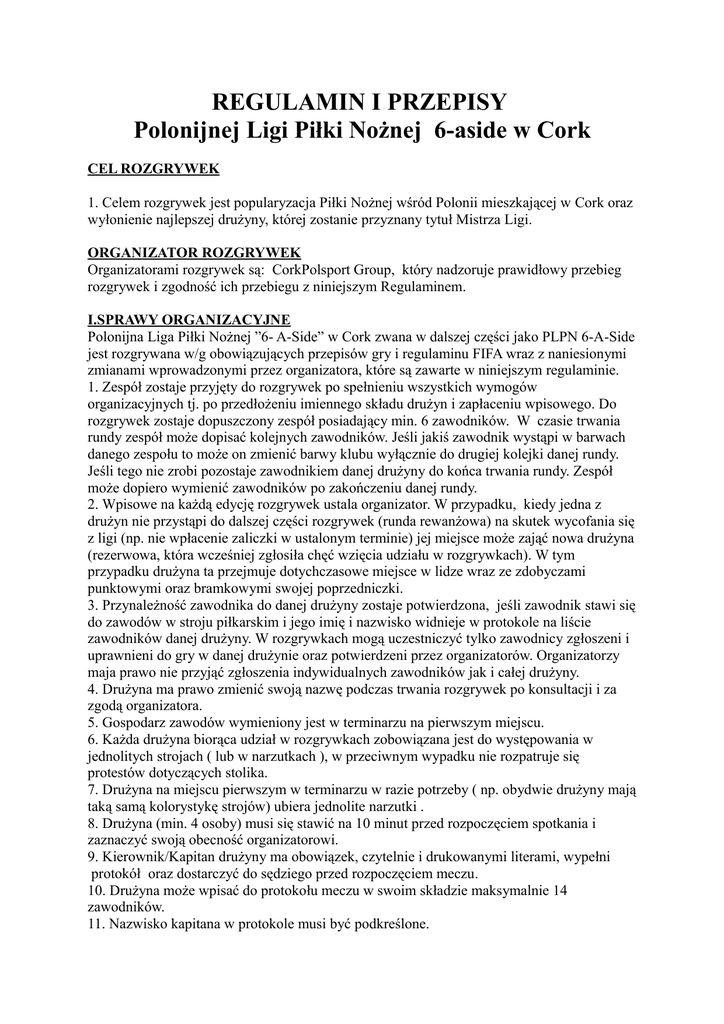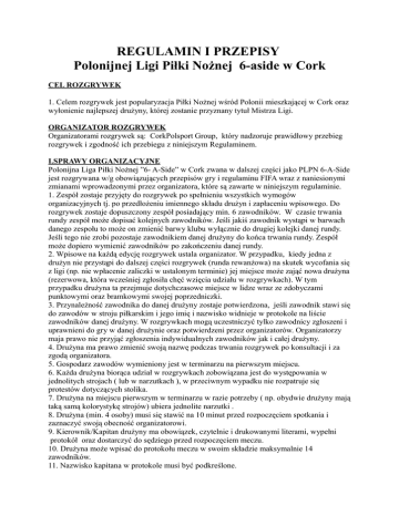 REGULAMIN I PRZEPISY Polonijnej Ligi Piłki Nożnej 6-aside w Cork CEL ROZGRYWEK 1. Celem rozgrywek jest popularyzacja Piłki Nożnej wśród Polonii mieszkającej w Cork oraz wyłonienie najlepszej drużyny, której zostanie przyznany tytuł Mistrza Ligi. ORGANIZATOR ROZGRYWEK Organizatorami rozgrywek są: CorkPolsport Group, który nadzoruje prawidłowy przebieg rozgrywek i zgodność ich przebiegu z niniejszym Regulaminem. I.SPRAWY ORGANIZACYJNE Polonijna Liga Piłki Nożnej ”6- A-Side” w Cork zwana w dalszej części jako PLPN 6-A-Side jest rozgrywana w/g obowiązujących przepisów gry i regulaminu FIFA wraz z naniesionymi zmianami wprowadzonymi przez organizatora, które są zawarte w niniejszym regulaminie. 1. Zespół zostaje przyjęty do rozgrywek po spełnieniu wszystkich wymogów organizacyjnych tj. po przedłożeniu imiennego składu drużyn i zapłaceniu wpisowego. Do rozgrywek zostaje dopuszczony zespół posiadający min. 6 zawodników. W czasie trwania rundy zespół może dopisać kolejnych zawodników. Jeśli jakiś zawodnik wystąpi w barwach danego zespołu to może on zmienić barwy klubu wyłącznie do drugiej kolejki danej rundy. Jeśli tego nie zrobi pozostaje zawodnikiem danej drużyny do końca trwania rundy. Zespół może dopiero wymienić zawodników po zakończeniu danej rundy. 2. Wpisowe na każdą edycję rozgrywek ustala organizator. W przypadku, kiedy jedna z drużyn nie przystąpi do dalszej części rozgrywek (runda rewanżowa) na skutek wycofania się z ligi (np. nie wpłacenie zaliczki w ustalonym terminie) jej miejsce może zająć nowa drużyna (rezerwowa, która wcześniej zgłosiła chęć wzięcia udziału w rozgrywkach). W tym przypadku drużyna ta przejmuje dotychczasowe miejsce w lidze wraz ze zdobyczami punktowymi oraz bramkowymi swojej poprzedniczki. 3. Przynależność zawodnika do danej drużyny zostaje potwierdzona, jeśli zawodnik stawi się do zawodów w stroju piłkarskim i jego imię i nazwisko widnieje w protokole na liście zawodników danej drużyny. W rozgrywkach mogą uczestniczyć tylko zawodnicy zgłoszeni i uprawnieni do gry w danej drużynie oraz potwierdzeni przez organizatorów. Organizatorzy maja prawo nie przyjąć zgłoszenia indywidualnych zawodników jak i całej drużyny. 4. Drużyna ma prawo zmienić swoją nazwę podczas trwania rozgrywek po konsultacji i za zgodą organizatora. 5. Gospodarz zawodów wymieniony jest w terminarzu na pierwszym miejscu. 6. Każda drużyna biorąca udział w rozgrywkach zobowiązana jest do występowania w jednolitych strojach ( lub w narzutkach ), w przeciwnym wypadku nie rozpatruje się protestów dotyczących stolika. 7. Drużyna na miejscu pierwszym w terminarzu w razie potrzeby ( np. obydwie drużyny mają taką samą kolorystykę strojów) ubiera jednolite narzutki . 8. Drużyna (min. 4 osoby) musi się stawić na 10 minut przed rozpoczęciem spotkania i zaznaczyć swoją obecność organizatorowi. 9. Kierownik/Kapitan drużyny ma obowiązek, czytelnie i drukowanymi literami, wypełni protokół oraz dostarczyć do sędziego przed rozpoczęciem meczu. 10. Drużyna może wpisać do protokołu meczu w swoim składzie maksymalnie 14 zawodników. 11. Nazwisko kapitana w protokole musi być podkreślone. 12. Tylko kapitan może zwracać się do sędziego w przerwach w czasie meczu. 13. Sędziowie weryfikują składy drużyn przed rozegraniem spotkania/lub po spotkaniu z listą zarejestrowanych zawodników drużyny a wpisem do protokołu. Nie dopuszczają nieuprawnionych zawodników do gry, gdy nieuprawniony zawodnik zostanie zweryfikowany po zakończeniu spotkania, drużyna w której występował taki zawodnik przegrywa mecz walkowerem ( 3:0 ) 14. Przed i Po spotkaniu, Drużyna może wyznaczyć osobę do wglądu w protokół sędziowski w celu sprawdzania zgodności zapisów w protokole z przebiegiem gry. 15. Zawodnik nieuprawniony do gry to taki, który nie został wpisany z danymi osobowymi do karty zgłoszeniowej drużyny. 16. Zawodnicy wszystkich drużyn są zobowiązani na każdorazowe żądanie sędziego lub organizatorów do okazania przed i po meczu dowodu osobistego lub innego dokumentu ze zdjęciem. 17. Protesty kapitanów odnośnie tożsamości zawodników i innych sytuacji zaistniałych podczas meczu mogą być składane pisemnie na odwrocie protokołu meczowego najpóźniej do 10-ciu minut po zakończeniu spotkania. W innym terminie protesty mogą nie być uwzględniane. 18. Terminarz rozgrywek ustalają organizatorzy, zastrzegając sobie zmianę terminarza z powodów nieprzewidzianych okoliczności. 19. Obsadę sędziowską w PLPN ”6- A-Side”, ustalają organizatorzy. 20. Spotkania odbywają się na obiektach Nemo Rangers w dzielnicy Douglas w Cork 21. Organizator zapewnia piłkę meczową. 22. Drużyny są zobowiązane do utrzymania boisk i otoczenia ławek rezerwowych w porządku i czystości. 23. Sportowe zachowanie obowiązuje zawodników uczestniczących w grze, zawodników rezerwowych, oraz menadżerów (opiekunów), trenerów i osoby towarzyszące. 24. Drużyna, jej kibice oraz osoby jej towarzyszące, które będą zachowywać się w niewłaściwy sposób przed, w trakcie meczu oraz po jego zakończeniu mogą zostać ukarane w postaci usunięcia zespołu z dalszych rozgrywek. 25. Organizator nie ponosi kosztów związanych z wyrządzeniem szkód na terenie obiektu z winy uczestników ligi. 26. Za wyrządzone szkody odpowiada sprawca. 27. Drużyny oraz sędziowie piłkarscy zobowiązani są do ubezpieczenia się od tzw. nieszczęśliwych wypadków. Organizator nie ponosi odpowiedzialności za wypadki/ zdarzenia losowe wynikłe podczas rozgrywania spotkań. Organizator może pomóc każdej z drużyn w znalezieniu firmy ubezpieczającej. 28. Zespoły lub też pojedyncze osoby działające na szkodę, ligi oraz organizatora mogą zostać wykluczone z rozgrywek ligowych bez możliwości odwołania się od decyzji wydanej przez Zarząd ligi. 29. Na obiektach (b