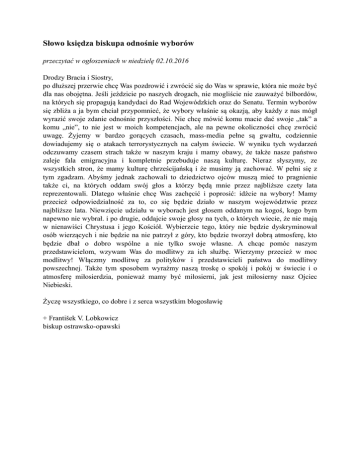 Słowo księdza biskupa odnośnie wyborów przeczytać w ogłoszeniach w niedzielę 02.10.2016 Drodzy Bracia i Siostry, po dłuższej przerwie chcę Was pozdrowić i zwrócić się do Was w sprawie, która nie może być dla nas obojętna. Jeśli jeździcie po naszych drogach, nie mogliście nie zauważyć bilbordów, na których się propagują kandydaci do Rad Wojewódzkich oraz do Senatu. Termin wyborów się zbliża a ja bym chciał przypomnieć, że wybory właśnie są okazją, aby każdy z nas mógł wyrazić swoje zdanie odnośnie przyszłości. Nie chcę mówić komu macie dać swoje „tak” a komu „nie”, to nie jest w moich kompetencjach, ale na pewne okoliczności chcę zwrócić uwagę. Żyjemy w bardzo gorących czasach, mass-media pełne są gwałtu, codziennie dowiadujemy się o atakach terrorystycznych na całym świecie. W wyniku tych wydarzeń odczuwamy czasem strach także w naszym kraju i mamy obawy, że także nasze państwo zaleje fala emigracyjna i kompletnie przebuduje naszą kulturę. Nieraz słyszymy, ze wszystkich stron, że mamy kulturę chrześcijańską i że musimy ją zachować. W pełni się z tym zgadzam. Abyśmy jednak zachowali to dziedzictwo ojców muszą mieć to pragnienie także ci, na których oddam swój głos a którzy będą mnie przez najbliższe czety lata reprezentowali. Dlatego właśnie chcę Was zachęcić i poprosić: idźcie na wybory! Mamy przecież odpowiedzialność za to, co się będzie działo w naszym województwie przez najbliższe lata. Niewzięcie udziału w wyborach jest głosem oddanym na kogoś, kogo bym napewno nie wybrał. i po drugie, oddajcie swoje głosy na tych, o których wiecie, że nie mają w nienawiści Chrystusa i jego Kościół. Wybierzcie tego, który nie będzie dyskryminował osób wierzących i nie będzie na nie patrzył z góry, kto będzie tworzył dobrą atmosferę, kto będzie dbał o dobro wspólne a nie tylko swoje własne. A chcąc pomóc naszym przedstawicielom, wzywam Was do modlitwy za ich służbę. Wierzymy przecież w moc modlitwy! Włączmy modlitwę za polityków i przedstawicieli państwa do modlitwy powszechnej. Także tym sposobem wyraźmy naszą troskę o spokój i pokój w świecie i o atmosferę miłosierdzia, ponieważ mamy być miłosierni, jak jest miłosierny nasz Ojciec Niebieski. Życzę wszystkiego, co dobre i z serca wszystkim błogosławię + František V. Lobkowicz biskup ostrawsko-opawski