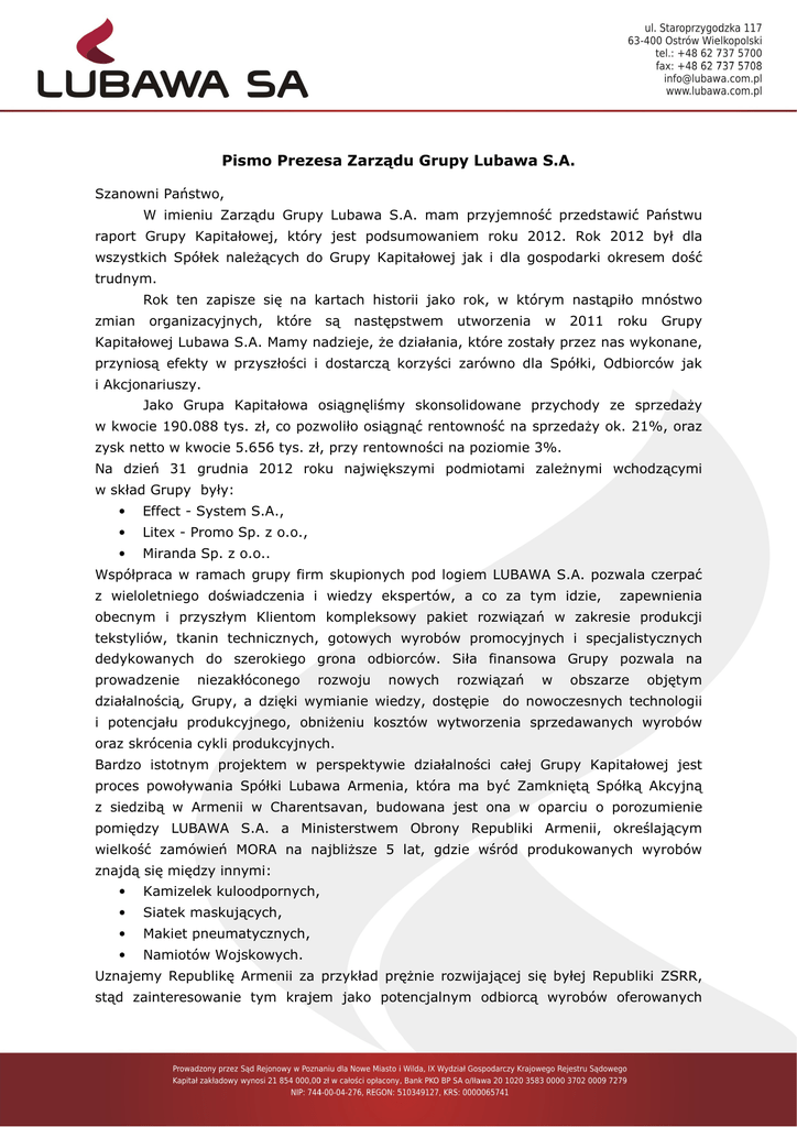 Pismo Prezesa Zarządu Grupy Lubawa S.A. Szanowni Państwo, W imieniu Zarządu Grupy Lubawa S.A. mam przyjemność przedstawić Państwu raport Grupy Kapitałowej, który jest podsumowaniem roku 2012. Rok 2012 był dla wszystkich Spółek należących do Grupy Kapitałowej jak i dla gospodarki okresem dość trudnym. Rok ten zapisze się na kartach historii jako rok, w którym nastąpiło mnóstwo zmian organizacyjnych, które są następstwem utworzenia w 2011 roku Grupy Kapitałowej Lubawa S.A. Mamy nadzieje, że działania, które zostały przez nas wykonane, przyniosą efekty w przyszłości i dostarczą korzyści zarówno dla Spółki, Odbiorców jak i Akcjonariuszy. Jako Grupa Kapitałowa osiągnęliśmy skonsolidowane przychody ze sprzedaży w kwocie 190.088 tys. zł, co pozwoliło osiągnąć rentowność na sprzedaży ok. 21%, oraz zysk netto w kwocie 5.656 tys. zł, przy rentowności na poziomie 3%. Na dzień 31 grudnia 2012 roku największymi podmiotami zależnymi wchodzącymi w skład Grupy były: • Effect - System S.A., • Litex - Promo Sp. z o.o., • Miranda Sp. z o.o.. Współpraca w ramach grupy firm skupionych pod logiem LUBAWA S.A. pozwala czerpać z wieloletniego doświadczenia i wiedzy ekspertów, a co za tym idzie, zapewnienia obecnym i przyszłym Klientom kompleksowy pakiet rozwiązań w zakresie produkcji tekstyliów, tkanin technicznych, gotowych wyrobów promocyjnych i specjalistycznych dedykowanych do szerokiego grona odbiorców. Siła finansowa Grupy pozwala na prowadzenie niezakłóconego rozwoju nowych rozwiązań działalnością, Grupy, a dzięki wymianie wiedzy, dostępie w obszarze objętym do nowoczesnych technologii i potencjału produkcyjnego, obniżeniu kosztów wytworzenia sprzedawanych wyrobów oraz skrócenia cykli produkcyjnych. Bardzo istotnym projektem w perspektywie działalności całej Grupy Kapitałowej jest proces powoływania Spółki Lubawa Armenia, która ma być Zamkniętą Spółką Akcyjną z siedzibą w Armenii w Charentsavan, budowana jest ona w oparciu o porozumienie pomiędzy LUBAWA S.A. a Ministerstwem Obrony Republiki Armenii, określającym wielkość zamówień MORA na najbliższe 5 lat, gdzie wśród produkowanych wyrobów znajdą się między innymi: • Kamizelek kuloodpornych, • Siatek maskujących, • Makiet pneumatycznych, • Namiotów Wojskowych. Uznajemy Republikę Armenii za przykład prężnie rozwijającej się byłej Republiki ZSRR, stąd zainteresowanie tym krajem jako potencjalnym odbiorcą wyrobów oferowanych przez Grupę Lubawa S.A. Chcielibyśmy aby rozpoczęcie tej współpracy było również początkiem ekspansji eksportowej Grupy na tereny Republik kaukaskich. Pragnę również zwrócić uwagę na fakt, że dzięki nieustannie trwającym pracom w zakresie badań i rozwoju Grupa Lubawa S.A. wprowadza na rynek nowe wyroby o wysokim poziomie jakościowym. Potwierdzeniem tego może być między innymi uzyskana podczas MSPO 2012 prestiżowa nagroda DEFENDER dla Kamizelkę Lifeguard Spec QR, która miała swoją premierę podczas Międzynarodowego Salonu Przemysłu Obronnego w Kielcach. Reasumując, działania podjęte w 2012 roku pozwoliły i dały szansę ogromnego rozwoju Spółkom należącym do Grupy Lubawa S.A. oraz długoterminowej perspektywy wzrostu ich wartości, którą powinniśmy i będziemy chcieli w najbliższych latach jak najlepiej wykorzystywać. Prezes Zarządu Grupy LUBAWA S.A. Marcin Kubica