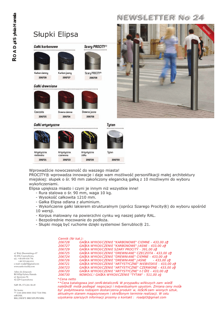ROAD.pl Sylwia Hamala Słupki Elipsa Wprowadźcie nowoczesność do waszego miasta! PROCITY® wprowadza innowacje i daje wam możliwość personifikacji małej architektury miejskiej: słupek o śr. 90 mm zakończony elegancką gałką z 10 możliwymi do wyboru wykończeniami. Elipsa upiększa miasto i czyni je innym niż wszystkie inne! - Rura stalowa o śr. 90 mm, waga 10 kg. - Wysokość całkowita 1210 mm. - Gałka Elipsa odlana z aluminium. - Wykończenie gałki lakierem strukturalnym (oprócz Szarego Procity®) do wyboru spośród 10 wersji. - Korpus malowany na powierzchni cynku wg naszej palety RAL. - Bezpośrednie mocowanie do podłoża. - Słupki mogą być ruchome dzięki systemowi Serrubloc® 21. ul. Wały Dwernickiego 87 42-202, Częstochowa, tel.: +48 690 034 796 +48 515 666 614 e-mail: [email protected] www.sankt.weebly.com Adres do doręczeń: ROAD.pl Sylwia Hamala ul. Sportowa 96 42-229 Częstochowa NIP: PL 573-241-58-49 Nr. konta: 77 1140 2004 0000 3502 7518 5986 mBANK BIG/SWIFT: BREXPLPWMBK Cennik (Nr kat.): 206728 GAŁKA WYKOŃCZENIE "KARBONOWE" CIEMNE - 433,00 zł* 206727 GAŁKA WYKOŃCZENIE "KARBONOWE" JASNE - 433,00 zł* 206729 GAŁKA WYKOŃCZENIE SZARY PROCITY - 391,00 zł* 206725 GAŁKA WYKOŃCZENIE "DREWNIANE" CZECZOTA - 433,00 zł* 206724 GAŁKA WYKOŃCZENIE "DREWNIANE" CIEMNE - 433,00 zł* 206726 GAŁKA WYKOŃCZENIE "DREWNIANE" JASNE - 433,00 zł* 206721 GAŁKA WYKOŃCZENIE "ARTYSTYCZNE" NIEBIESKIE - 433,00 zł* 206723 GAŁKA WYKOŃCZENIE "ARTYSTYCZNE" CZERWONE - 433,00 zł* 206720 GAŁKA WYKOŃCZENIE "ARTYSTYCZNE" ŻÓŁTE - 433,00 zł* 206730 NOWOŚĆ! GAŁKA WYKOŃCZENIE "TYTAN" - 511,00 zł *Cena netto **Cena katalogowa jest ceną detaliczną. W przypadku większych zamówień należność może podlegać negocjacji i indywidualnym upustom. Zmiana ceny może być podyktowana rodzajem dostarczenia produktów, ilością zamówionych sztuk, aktualnym stanem magazynowym i określonym terminie realizacji. W celu uzyskania szerszych informacji prosimy o kontakt : [email protected]