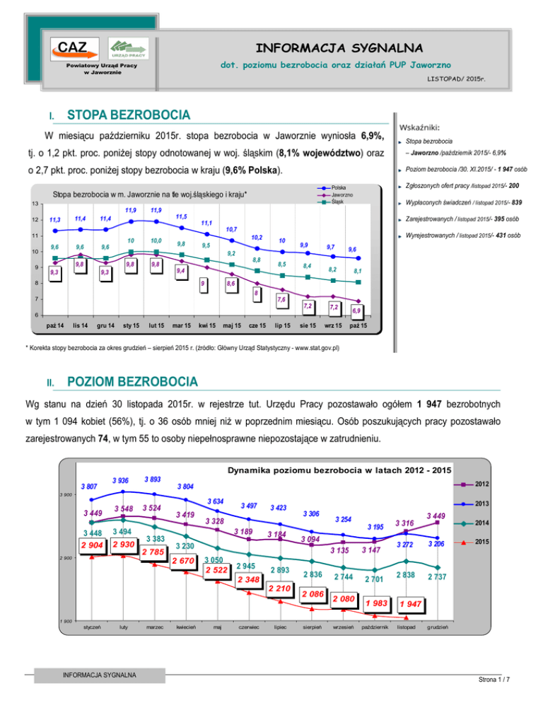 INFORMACJA SYGNALNA dot. poziomu bezrobocia oraz działań PUP Jaworzno Powiatowy Urząd Pracy w Jaworznie LISTOPAD/ 2015r. STOPA BEZROBOCIA I. W miesiącu październiku 2015r. stopa bezrobocia w Jaworznie wyniosła 6,9%, tj. o 1,2 pkt. proc. poniżej stopy odnotowanej w woj. śląskim (8,1% województwo) oraz o 2,7 pkt. proc. poniżej stopy bezrobocia w kraju (9,6% Polska). 13 12 11 10 9 8 11,3 11,4 11,4 9,6 9,6 9,6 9,8 9,3 11,9 10 9,8 9,3 11,9 10,0 9,8 11,5 9,8 9,4 11,1 10,2 9,2 9 8,8 8,6 8 7 6 paź 14 lis 14 gru 14 sty 15 lut 15 mar 15 kwi 15 – Jaworzno /październik 2015/- 6,9% Poziom bezrobocia /30. XI.2015/ - 1 947 osób Wypłaconych świadczeń / listopad 2015/- 839 Zarejestrowanych / listopad 2015/- 395 osób 10,7 9,5 Stopa bezrobocia Zgłoszonych ofert pracy /listopad 2015/- 200 Polska Jaworzno Śląsk Stopa bezrobocia w m. Jaworznie na tle woj.śląskiego i kraju* Wskaźniki: maj 15 cze 15 10 8,5 7,6 lip 15 9,9 8,4 9,7 Wyrejestrowanych / listopad 2015/- 431 osób 9,6 8,2 7,2 7,2 sie 15 wrz 15 8,1 6,9 paź 15 * Korekta stopy bezrobocia za okres grudzień – sierpień 2015 r. (źródło: Główny Urząd Statystyczny - www.stat.gov.pl) II. POZIOM BEZROBOCIA Wg stanu na dzień 30 listopada 2015r. w rejestrze tut. Urzędu Pracy pozostawało ogółem 1 947 bezrobotnych w tym 1 094 kobiet (56%), tj. o 36 osób mniej niż w poprzednim miesiącu. Osób poszukujących pracy pozostawało zarejestrowanych 74, w tym 55 to osoby niepełnosprawne niepozostające w zatrudnieniu. 3 900 3 807 3 449 3 448 2 900 1 900 2 904 styczeń 3 936 3 893 3 548 3 524 3 494 2 930 luty INFORMACJA SYGNALNA 3 383 2 785 marzec 3 804 3 419 3 230 2 670 kwiecień Dynamika poziomu bezrobocia w latach 2012 - 2015 3 634 3 328 3 050 2 522 maj 3 497 3 189 2 945 2 348 czerwiec 3 423 3 184 2 893 2 210 lipiec 3 306 3 094 2 836 2 086 sierpień 3 254 3 135 2 744 2 080 wrzesień 3 195 3 147 2 701 1 983 październik 3 316 3 449 3 272 3 206 2 838 2 737 2012 2013 2014 2015 1 947 listopad grudzień Strona 1 / 7 PŁYNNOŚĆ BEZROBOCIA, PODJĘCIA PRACY W okresie styczeń – listopad 2014r. Zarejestrowano osób bezrobotnych: 2015r. 4 109 4 993 Wyłączono z ewidencji osób bezrobotnych: 5 361 Podjęć pracy: -884 -462 4 899 2 328 Zgłoszono ofert pracy: dynamika 2015/2014 -108 2 220 2 618 2 054 564 REJESTRACJE 600 z yc st eń ty lu m ze ar c kw eń ci ie m aj cz w er c ie 1 c ie si er eń pi w i es rz eń p dz aź ie ik rn 2014 800 39 5 40 6 44 36 9 32 4 lip 48 6 51 45 0 37 4 31 8 35 8 40 8 38 0 3 32 6 1 34 100 WYŁĄCZENIA IV. 37 43 35 2 200 41 3 300 6 4 400 54 9 63 7 500 0 to lis d pa 2015 700 200 100 0 OFERTY PRACY y st eń cz 52 9 43 1 41 2 44 7 42 6 44 8 51 2 50 2 46 3 49 2 58 8 52 8 44 1 32 6 39 5 300 39 0 48 6 52 4 400 52 6 500 60 6 600 28 5 Status osoby bezrobotnej w listopadzie br. utraciło ogółem 431 osób, w tym m.in.: 245 osób z powodu podjęcia pracy (57% ogółu) 70 osób z powodu braku gotowości do podjęcia pracy (16% ogółu). 2015 700 45 2 W miesiącu listopadzie br. zarejestrowano 395 bezrobotnych, w tym: 327 osób poprzednio pracujących (83% ogółu) 52 osoby z prawem do zasiłku (13%). 2014 800 50 3 III. t lu y c ze ar m kw ń ie iec aj m er cz ec wi c ie li p eń pi er si ń ie es rz w ik rn zie źd a p to li s d pa W miesiącu listopadzie br. zgłoszono 200 wolnych miejsc pracy i miejsc aktywizacji zawodowej. Oferty pracy niesubsydiowanej zgłaszano m.in. w zawodach: pracownik produkcji, pakowacz, barman/ kelner, sprzedawca (książeczka do celów sanitarno – epidemiologicznych), sprzątaczka, kasjer, kucharz, pomoc kuchenna (książeczka do celów sanitarno – epidemiologicznych), pracownik techniczny, przedstawiciel handlowy, elektryk (uprawnienia SEP), pracownik do dociepleń, kierowca (prawo jazdy kat. C+E), magazynier (upr. na wózki widłowe), stolarz meblowy, pracownik do wykładania towaru, murarz. Oferty subsydiowane dot. m.in. zawodów: pracownik biurowy, pomoc kuchenna, zaopatrzeniowiec – dostawca posiłków, agent ubezpieczeniowy. styczeń luty marzec kwiecień maj czerwiec lipiec sierpień wrzesień październik listopad razem INFORMACJA SYGNALNA Ogółem ofert 2015r. 2014r. 45 210 215 190 371 192 225 343 368 259 151 134 257 252 185 164 239 266 157 137 2618 2054 200 112 w tym: Subsydiowane 2015r. 2014r. 3 64 51 48 137 88 69 131 51 16 4 91 115 101 58 63 55 68 14 43 673 660 15 48 Niesubsydiowane 2015r. 2014r. 42 146 164 142 234 104 156 212 317 243 147 43 142 151 127 101 184 198 143 94 1945 1394 185 64 Strona 2 / 7 OSOBY BĘDĄCE W SZCZEGÓLNEJ SYTUACJI NA RYNKU PRACY V. W końcu listopada 2015 r. w ewidencji pozostawało 1639 osób bezrobotnych będących w szczególnej sytuacji na rynku pracy (tj. 84% ogółu bezrobotnych), w tym: Ilość osób /stan na 30.XI. 2015 r./ bezrobotni do 30 roku życia w tym do 25 roku życia udział w ogóle bezrobotnych 564 260 długotrwale bezrobotne 29,0% 13,4% 866 bezrobotni powyżej 50 roku życia bezrobotni posiadający co najmniej jedno dziecko do 6 roku życia 44,5% 557 28,6% 169 8,7% 308 bezrobotni niepełnosprawni 15,8% ŚWIADCZENIA DLA BEZROBOTNYCH VI. W miesiącu listopadzie br. wypłacono łącznie 839 świadczeń dla bezrobotnych, m.in.: z tytułu zasiłku dla bezrobotnych, stypendiów (za staż, szkolenie) oraz dodatków aktywizacyjnych. Luty 2015 731 737 Kwiecień 2015 778 Maj 2015 762 Czerwiec 2015 819 Wrzesień Październik 2015 2015 840 950 881 Listopad 2015 839 ogółem 8 858 37 32 45 50 42 0 45 1 19 8 45 5 32 3 27 1 49 0 73 44 19 0 54 4 53 63 13 5 500 11 8 17 49 9 600 786 58 900 700 Sierpień 2015 Świadczenia wypłacowne przez PUP w Jaworznie w danym miesiącu 2015 r. 1000 800 Lipiec 2015 48 735 Marzec 2015 27 0 Ilość wypłaconych świadczeń Styczeń 2015 0 sty-15 lut-15 mar-15 ZASIŁKI INFORMACJA SYGNALNA kw i-15 maj-15 cze-15 STYPENDIA lip-15 sie-15 38 2 39 8 45 0 46 7 100 46 8 50 7 200 54 9 300 49 1 400 55 0 Miesiąc w rz-15 paź-15 lis-15 DODATKI AKTYWIZACYJNE Strona 3 / 7 Programy i projekty przeciwdziałania bezrobociu reali