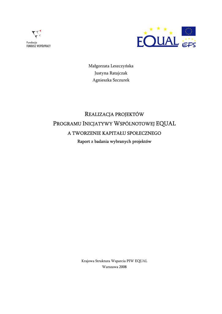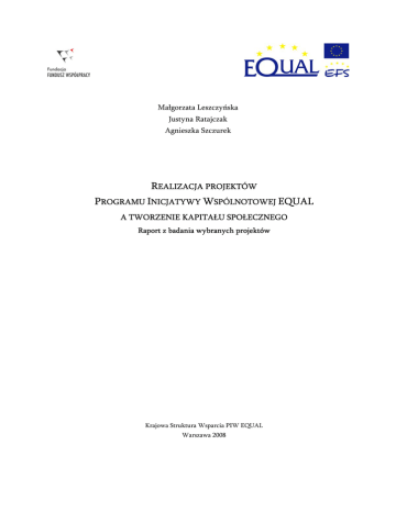 Małgorzata Leszczyńska Justyna Ratajczak Agnieszka Szczurek REALIZACJA PROJEKTÓW PROGRAMU INICJATYWY WSPÓLNOTOWEJ EQUAL A TWORZENIE KAPITAŁU SPOŁECZNEGO Raport z badania wybranych projektów Krajowa Struktura Wsparcia PIW EQUAL Warszawa 2008 Wydawca: Fundacja Fundusz Współpracy, ul. Górnośląska 4a, 00-444 Warszawa www.cofund.org.pl Publikacja sfinansowana z udziałem środków Europejskiego Funduszu Społecznego w ramach realizacji Programu Inicjatywy Wspólnotowej EQUAL 2 Spis treści Słowo wstępne…………………………………………………………………………………4 1. Sprawozdania ze studiów przypadku ............................................................................... 5 Wirtualny Inkubator Gospodarki Społecznej - model funkcjonowania w sieci współpracy 6 Krótki opis badanego projektu ............................................................................................. 6 Informacja o badaniu ............................................................................................................ 8 Sytuacja przed projektem...................................................................................................... 8 Sytuacja w trakcie trwania projektu .................................................................................... 9 Efekty projektu.................................................................................................................... 11 Sytuacja obecna ................................................................................................................... 14 Czynniki specyficzne dla PIW EQUAL wpływające na zmiany kapitału społecznego .. 19 Partnerstwo dla Zawidawia. Program Zakrzów - Peryferie lokomotywą dla Wrocławia 22 Krótki opis badanego projektu ........................................................................................... 22 Informacja o badaniu .......................................................................................................... 25 Sytuacja przed projektem.................................................................................................... 25 Sytuacja w trakcie trwania projektu .................................................................................. 27 Efekty projektu.................................................................................................................... 29 Sytuacja obecna – po zakończeniu projektu ...................................................................... 34 Czynniki specyficzne dla PIW EQUAL wpływające na zmiany kapitału społecznego .. 37 Centrum Zielonych Technologii............................................................................................ 39 Krótki opis badanego projektu ........................................................................................... 39 Informacja o badaniu .......................................................................................................... 41 Sytuacja przed projektem.................................................................................................... 41 Sytuacja w trakcie trwania projektu .................................................................................. 43 Efekty projektu.................................................................................................................... 47 Sytuacja obecna ................................................................................................................... 49 2. Raport metodologiczny z pilotażu.................................................................................. 55 I. Pilotaż............................................................................................................................... 55 A. Przygotowanie badania .............................................................................................. 55 B. Metodologia................................................................................................................. 56 C. Realizacja badania....................................................................................................... 58 II. Zmodyfikowane założenia i metodologia badania ....................................................... 61 Założenia badania............................................................................................................ 61 Opis przedmiotu badania ................................................................................................ 63 Pytania kluczowe ............................................................................................................ 64 Metodologia ..................................................................................................................... 65 Narzędzia badawcze ........................................................................................................ 66 3 Słowo wstępne Utworzenie Partnerstwa na rzecz Rozwoju (PRR) było warunkiem koniecznym realizacji projektu w ramach Programu Inicjatywy Wspólnotowej EQUAL (PIW EQUAL). Partnerstwa takie były dobrowolnymi porozumieniami podmiotów z różnych sektorów tworzonymi w celu wspólnego podjęcia próby zdiagnozowania i rozwiązania problemów skutkujących nierównością czy wręcz dyskryminacją określonych grup na rynku pracy. W badaniu, którego podsumowanie tu przedstawiamy, przyjęto założenie, że w wyniku formalnej współpracy w ramach Partnerstwa zauważalne może być przyczynianie się efektów projektu do tworzenia kapitału społecznego w powstałej sieci współpracy (w gronie formalnych partnerów i innych podmiotów oraz osób związanych z działaniami Partnerstwa). Wziąwszy pod uwagę, że badanie było prowadzone po zakończeniu realizacji projektów, miało również na celu przedstawienie pierwszych obserwacji dotyczących trwałości tego rodzaju powiązań. Konkluzje dotyczące tych zagadnień zawarte zostały w części przedsta