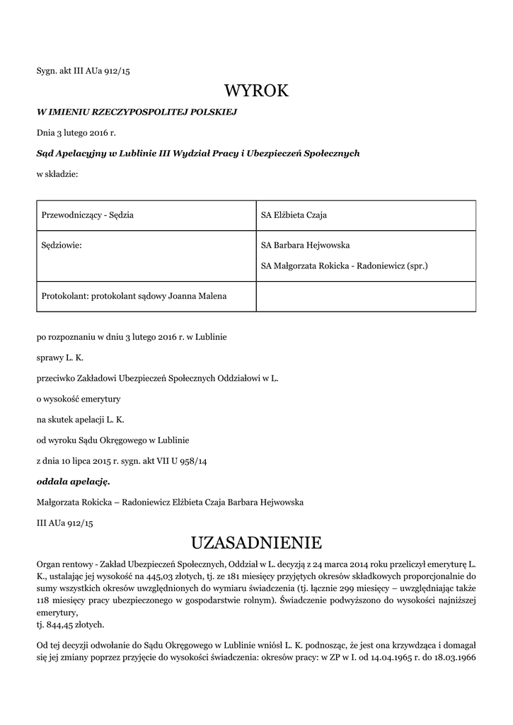 Sygn. akt III AUa 912/15 WYROK W IMIENIU RZECZYPOSPOLITEJ POLSKIEJ Dnia 3 lutego 2016 r. Sąd Apelacyjny w Lublinie III Wydział Pracy i Ubezpieczeń Społecznych w składzie: Przewodniczący - Sędzia SA Elżbieta Czaja Sędziowie: SA Barbara Hejwowska SA Małgorzata Rokicka - Radoniewicz (spr.) Protokolant: protokolant sądowy Joanna Malena po rozpoznaniu w dniu 3 lutego 2016 r. w Lublinie sprawy L. K. przeciwko Zakładowi Ubezpieczeń Społecznych Oddziałowi w L. o wysokość emerytury na skutek apelacji L. K. od wyroku Sądu Okręgowego w Lublinie z dnia 10 lipca 2015 r. sygn. akt VII U 958/14 oddala apelację. Małgorzata Rokicka – Radoniewicz Elżbieta Czaja Barbara Hejwowska III AUa 912/15 UZASADNIENIE Organ rentowy - Zakład Ubezpieczeń Społecznych, Oddział w L. decyzją z 24 marca 2014 roku przeliczył emeryturę L. K., ustalając jej wysokość na 445,03 złotych, tj. ze 181 miesięcy przyjętych okresów składkowych proporcjonalnie do sumy wszystkich okresów uwzględnionych do wymiaru świadczenia (tj. łącznie 299 miesięcy – uwzględniając także 118 miesięcy pracy ubezpieczonego w gospodarstwie rolnym). Świadczenie podwyższono do wysokości najniższej emerytury, tj. 844,45 złotych. Od tej decyzji odwołanie do Sądu Okręgowego w Lublinie wniósł L. K. podnosząc, że jest ona krzywdząca i domagał się jej zmiany poprzez przyjęcie do wysokości świadczenia: okresów pracy: w ZP w I. od 14.04.1965 r. do 18.03.1966 r. oraz w ZK w K. od 16.12.1968 r. do 09.06.1970 r. i ZK w C. od grudnia1970 r. do lutego 1971 r.; okresu pracy w gospodarstwie rolnym w szerszym wymiarze, tj. 14 lat, 3 miesięcy i 27 dni; okresu opłacania składek na rzecz KRUS, w szczególności za 1991 rok; a także zarobków z lat 1979 – 1988. Sąd Okręgowy w Lublinie wyrokiem z dnia 10 lipca 2015 r. oddalił odwołanie. Sąd Okręgowy ustalił, że L. K., urodzony (...), wniosek o emeryturę złożył 14 grudnia 2007 roku. Powyższy wniosek został załatwiony decyzją odmowną i w ślad za odwołaniem L. K. prawo do emerytury zostało mu ustalone wyrokiem tutejszego sądu z dnia 16 grudnia 2008 roku, wydanym w sprawie VIII U 2795/08, na podstawie art. 29 ust. 1 pkt 2 ustawy o emeryturach i rentach z FUS, w oparciu o doliczenie okresu pracy w gospodarstwie rolnym rodziców po ukończeniu16 lat (której łączny okres sąd ustalił od 06.10.1962 r. do 01.02.1977 r.) do udowodnionych już przed organem rentowym 13 lat, 2 miesięcy i 27 dni okresu składkowego (zatrudnienia w ramach stosunku pracy), co skutkowało ustaleniem, że wnioskodawca legitymuje się wymaganym stażem emerytalnym 25 lat (pozostałe przesłanki nabycia prawa do świadczenia nie były w powołanej sprawie sporne). W chwili wydania powyższego wyroku L. K. był już uprawniony do stałej renty rolniczej, jednak przy ustalaniu prawa do tego świadczenia nie uwzględniono wspomnianego okresu pracy w gospodarstwie rolnym. Prezes KRUS przyjął natomiast m. in. okresy opłacania przez L. K. składek na ubezpieczenie społeczne rolników: od 01.01.1983 r. do 31.12.1988 r. oraz od 01.01.1992 r. do 30.09.2004 r. Składki za okres od 01.05.1990 r. do 31.12.1991 r. zostały odpisane jako przedawnione. Decyzją z 3 lutego 2009 r. organ rentowy wykonał wyrok sądu, przyznając L. K. emeryturę, do wymiaru której przyjęto zarobki wnioskodawcy z lat 1987-96, 13 lat i 2 miesiące (158 miesięcy) okresów składkowych (pełne miesiące z uwzględnionych do stażu 13 lat, 2 miesięcy i 27 dni) oraz 11 lat i 9 miesięcy (141 miesięcy) okresów pracy w gospodarstwie rolnym. Wysokość świadczenia (z uwzględnieniem waloryzacji) wyniosła wówczas 388,44 złote i zostało ono podwyższone do pułapu najniższej emerytury, tj. 636,29 złotych brutto. Od tej decyzji wnioskodawca również wniósł odwołanie, domagając się uwzględnienia w podstawie wymiaru świadczenia zarobków z lat 1980-1989 jako korzystniejszych. Odwołanie zostało oddalone wyrokiem Sądu Okręgowego w Lublinie z dnia 14 kwietnia 2009 r. w sprawie VIII U 1030/09. Następnie L. K. domagał się uwzględnienia do wymiaru świadczenia wszystkich lat pracy w gospodarstwie rolnym (tj. 14 lat. 3 miesiące i 27 dni), jednak temu organ również odmówił, wydając decyzję z 28.05.2010 r. Odwołanie od niej oddalono wyrokiem sądu z dnia 13 października 2010 r., w sprawie VIII U 2272/10 a jego apelacja została oddalona wyrokiem Sądu Apelacyjnego w Lublinie z 30 marca 2011 r. W dniu 5 marca 2014 r. wnioskodawca zwrócił się o przeliczenie emerytury z uwzględnieniem okresów pracy w zakładach penitencjarnych, załączając zaświadczenia, potwierdzające, że był zatrudniony w ZK w G. od 20.11.1967 r. do 14.06.1968 r. oraz w ZK w C. od 26.08.1969 r. do 09.12.1970 r. Z innych dokumentów, jakie wnioskodawca wówczas złożył, wynika, że w okresie od 14.04.1965 r. do 18.06.1966 r. był wychowankiem Zakładu (...) w I. oraz, że we wskazanych tam okresach i placówkach odbywał karę pozbawienia wolności. Na podstawie tych dokumentów została wydana zaskarżona decyzja. L. K. odbywał zatrudnienie, będąc osadzonym w kilku jednostkach penitencjarnych. Jako podopieczny Zakładu (...) w I. był zatrudniony w Zakładach (...), które świadczyły usługi na zlecenie Stoczni (...). Wykonywał przy pomocy prasy uchwyty do montażu instalacji elektrycznej na statkach. Będąc osadzonym w ZK w G. zajmował się okopywaniem ziemniaków oraz pracą w pralni. Z kolei z ZK w C. skierowany był do prac porządkowych na stadionie, natomiast z ZK w K. oddelegowano go do pracy w charakterze woźnego w szkole. Powyższy stan faktyczny – w odniesieniu do okoliczności ustalenia świadczenia wnioskodawcy oraz jego wysokości – sąd ustalił na podstawie dokumentów z akt emerytalnych, a w odniesieniu do okoliczności osadzenia wnioskodawcy w jednostkach penitencjarnych, sąd oparł się na jego zeznaniach. Co do ogólnych stwierdzeń w nich zawartych dotyczących sameg