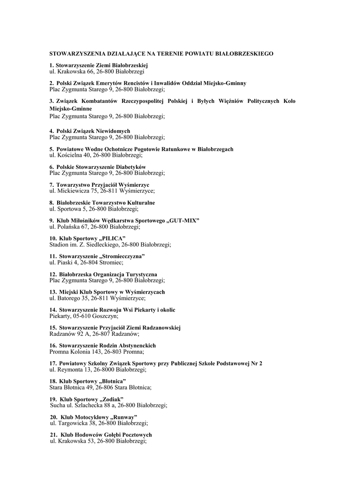 STOWARZYSZENIA DZIAŁAJĄCE NA TERENIE POWIATU BIAŁOBRZESKIEGO 1. Stowarzyszenie Ziemi Białobrzeskiej ul. Krakowska 66, 26-800 Białobrzegi 2. Polski Związek Emerytów Rencistów i Inwalidów Oddział Miejsko-Gminny Plac Zygmunta Starego 9, 26-800 Białobrzegi; 3. Związek Kombatantów Rzeczypospolitej Polskiej i Byłych Więźniów Politycznych Koło Miejsko-Gminne Plac Zygmunta Starego 9, 26-800 Białobrzegi; 4. Polski Związek Niewidomych Plac Zygmunta Starego 9, 26-800 Białobrzegi; 5. Powiatowe Wodne Ochotnicze Pogotowie Ratunkowe w Białobrzegach ul. Kościelna 40, 26-800 Białobrzegi; 6. Polskie Stowarzyszenie Diabetyków Plac Zygmunta Starego 9, 26-800 Białobrzegi; 7. Towarzystwo Przyjaciół Wyśmierzyc ul. Mickiewicza 75, 26-811 Wyśmierzyce; 8. Białobrzeskie Towarzystwo Kulturalne ul. Sportowa 5, 26-800 Białobrzegi; 9. Klub Miłośników Wędkarstwa Sportowego „GUT-MIX” ul. Polańska 67, 26-800 Białobrzegi; 10. Klub Sportowy „PILICA” Stadion im. Z. Siedleckiego, 26-800 Białobrzegi; 11. Stowarzyszenie „Stromiecczyzna” ul. Piaski 4, 26-804 Stromiec; 12. Białobrzeska Organizacja Turystyczna Plac Zygmunta Starego 9, 26-800 Białobrzegi; 13. Miejski Klub Sportowy w Wyśmierzycach ul. Batorego 35, 26-811 Wyśmierzyce; 14. Stowarzyszenie Rozwoju Wsi Piekarty i okolic Piekarty, 05-610 Goszczyn; 15. Stowarzyszenie Przyjaciół Ziemi Radzanowskiej Radzanów 92 A, 26-807 Radzanów; 16. Stowarzyszenie Rodzin Abstynenckich Promna Kolonia 143, 26-803 Promna; 17. Powiatowy Szkolny Związek Sportowy przy Publicznej Szkole Podstawowej Nr 2 ul. Reymonta 13, 26-8000 Białobrzegi; 18. Klub Sportowy „Błotnica” Stara Błotnica 49, 26-806 Stara Błotnica; 19. Klub Sportowy „Zodiak” Sucha ul. Szlachecka 88 a, 26-800 Białobrzegi; 20. Klub Motocyklowy „Runway” ul. Targowicka 38, 26-800 Białobrzegi; 21. Klub Hodowców Gołębi Pocztowych ul. Krakowska 53, 26-800 Białobrzegi; 22. Stowarzyszenie Użytkowników Ogrodów Rekreacyjnych „RELAX” ul. Żeromskiego 41/16, 26-800 Białobrzegi; 23. Białobrzeskie Stowarzyszenie Sportowe ul. 11 Listopada 38, 26-800 Białobrzegi; 24. Klub Pomocy Wzajemnej „Energia” ul. Reymonta 46, 26-800 Białobrzegi; 25. Klub Sportowy „Radzanów” Czarnocin 58, 26-807 Radzanów; 26. Stowarzyszenie Osób Niepełnosprawnych „Wspierajmy się” ul. Kościelna 31, 26-800 Białobrzegi 27. Klub Sportowy „UKS Promna” Urząd Gminy w Promnie, 26-803 Promna; 28. Koło Przyjaciół Harcerstwa w Białobrzegach ul. Reymonta 11, 26-800 Białobrzegi 29. Stowarzyszenie „Wygrane Marzenia” ul. Reymonta 11, 26-800 Białobrzegi 30. Stowarzyszenie Ludzi z Inicjatywą „Postęp” Branica 12, 26-807 Radzanów 31. Klub Sportowy „GKS Stromiec” Wola Stromiecka 41 a 32. Katolickie Stowarzyszenie Serca dla Serc w Jasionie Jasionna 32, 26-800 Białobrzegi 33. Lokalna Grupa Działania „Zapilicze” Plac Zygmunta Starego 9, 26-800 Białobrzegi 34. Stowarzyszenie „Szczytowiaki” Szczyty 45A, 26-800 Białobrzegi 35. Stowarzyszenie „Brzeźce nad Pilicą” ul. Relaksowa 9, Brzeźce, 26-800 Białobrzegi 36. Stowarzyszenie Sportowo-Rekreacyjne „Trytfa” ul. Krakowska 35, 26-800 Białobrzegi 37. Koło Gospodyń Wiejskich 26-604 Stromiec 38. Stowarzyszenie Strzeleckie im. Cichociemnych AK ul. Dojazdowa 4, Brzeźce, 26-800 Białobrzegi 39. Stowarzyszenie „Nasza Mala Ojczyzna” ul. Reymonta 32/34, 26-800 Białobrzegi 40. Stowarzyszenie „JEDYNKA KEN” ul. Rzemieślnicza 21/31, 26-800 Białobrzegi 41. Stowarzyszenie Rozwoju Wsi Rykały i Okolic Rykały 49, 05-610 Goszczyn 42. Stowarzyszenie „Wszystkie razem" ul. Główna 55, Dobieszyn, 26-804 Stromiec 43. Stowarzyszenie „Kobiety dla Starej Błotnicy" 26-806 Stara Błotnica 23 44. Stowarzyszenie Mieszkańców Wsi Stary Kobylnik i Okolice „Nasza Wieś" 26-806 Stara Błotnica, Stary Kobylnik
