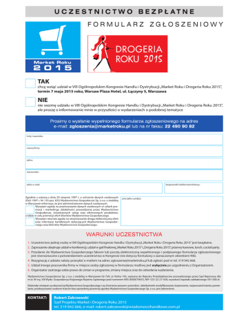 UCZESTNICTWO BEZPŁ ATNE FORMULARZ ZGŁOSZENIOWY TAK chcę wziąć udział w VIII Ogólnopolskim Kongresie Handlu i Dystrybucji „Market Roku i Drogeria Roku 2015”, termin 7 maja 2015 roku, Warsaw Plaza Hotel, ul. Łączyny 5, Warszawa NIE nie wezmę udziału w VIII Ogólnopolskim Kongresie Handlu i Dystrybucji „Market Roku i Drogeria Roku 2015”, ale proszę o informowanie mnie w przyszłości o wydarzeniach o podobnej tematyce Prosimy o wysłanie wypełnionego formularza zgłoszeniowego na adres e-mail: [email protected] lub na nr faksu: 22 490 90 82 imię i nazwisko: nazwa firmy: adres: stanowisko: adres e-mail: bezpośredni telefon komórkowy: Zgodnie z ustawą z dnia 29 sierpnia 1997 r. o ochronie danych osobowych (DzU 1997 r. Nr 133 poz. 833) Wydawnictwo Gospodarcze Sp. z o.o. z siedzibą w Warszawie informuje, że jest administratorem danych osobowych. Wyrażam zgodę na przetwarzanie danych osobowych w celach promocji i marketingu działalności prowadzonej przez Wydawnictwo Gospodarcze, świadczonych usług oraz oferowanych produktów, a także w celu promocji ofert klientów Wydawnictwa Gospodarczego. Wyrażam również zgodę na otrzymywanie drogą elektroniczną ofert oraz informacji handlowych dotyczących Wydawnictwa Gospodarczego oraz klientów Wydawnictwa Gospodarczego. pieczątka i podpis: WARUNKI UCZESTNICTWA 1. Uczestnictwo jednej osoby w VIII Ogólnopolskim Kongresie Handlu i Dystrybucji „Market Roku i Drogeria Roku 2015” jest bezpłatne. 2. Zaproszenie obejmuje udział w konferencji, udział w gali finałowej „Market Roku 2015” i „Drogeria Roku 2015”, przerwy kawowe, lunch, coctail party. 3. Przesłanie do Wydawnictwa Gospodarczego faksem lub pocztą elektroniczną wypełnionego i podpisanego formularza zgłoszeniowego jest równoznaczne z potwierdzeniem uczestnictwa w Kongresie (nie dotyczy formularzy z zaznaczonym okienkiem NIE). 4. Rezygnację z udziału należy przesyłać e-mailem na adres: [email protected] lub zgłosić pod nr tel. 519 042 666. 5. Udział innego pracownika firmy w miejsce osoby zgłoszonej w formularzu możliwy jest wyłącznie po uzgodnieniu z Organizatorem. 6. Organizator zastrzega sobie prawo do zmian w programie, zmiany miejsca oraz do odwołania wydarzenia. Wydawnictwo Gospodarcze Sp. z o.o. z siedzibą w Warszawie 02-729, ul. Rolna 195, wpisana do Rejestru Przedsiębiorców prowadzonego przez Sąd Rejonowy dla m.st. W-wy, XIII Wydz. Gospodarczy Krajowego Rejestru Sądowego pod numerem KRS 0000079655, NIP: 525-22-27-438, wysokość kapitału zakładowego 591 000 zł. Materiały niniejsze są własnością Wydawnictwa Gospodarczego i są chronione prawem autorskim. Jakiekolwiek modyfikowanie, kopiowanie, rozpowszechnianie, powielanie, przekazywanie osobom trzecim bez uprzedniej pisemnej zgodny Wydawnictwa Gospodarczego Sp. z o.o. jest zabronione. KONTAKT: Robert Zakrzewski Szef Projektu Market i Drogeria Roku 2015 tel. 519 042 666, e-mail: [email protected]
