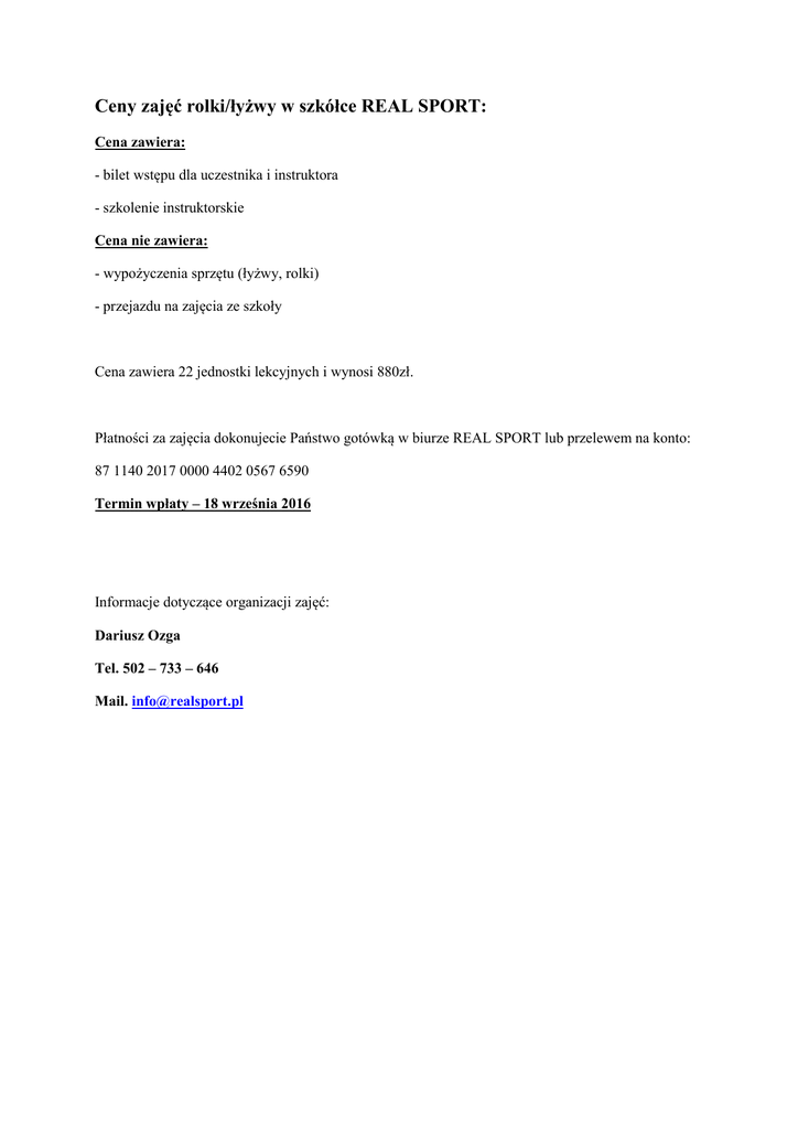 Ceny zajęć rolki/łyżwy w szkółce REAL SPORT: Cena zawiera: - bilet wstępu dla uczestnika i instruktora - szkolenie instruktorskie Cena nie zawiera: - wypożyczenia sprzętu (łyżwy, rolki) - przejazdu na zajęcia ze szkoły Cena zawiera 22 jednostki lekcyjnych i wynosi 880zł. Płatności za zajęcia dokonujecie Państwo gotówką w biurze REAL SPORT lub przelewem na konto: 87 1140 2017 0000 4402 0567 6590 Termin wpłaty – 18 września 2016 Informacje dotyczące organizacji zajęć: Dariusz Ozga Tel. 502 – 733 – 646 Mail. [email protected]