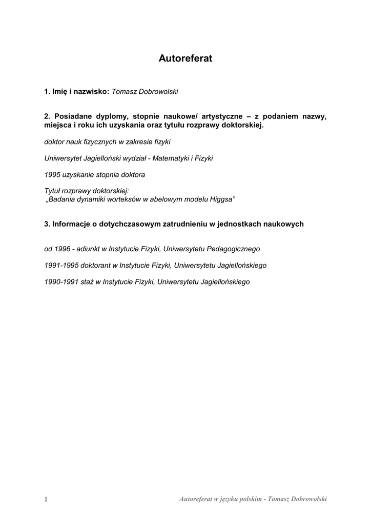 Autoreferat 1. Imię i nazwisko: Tomasz Dobrowolski 2. Posiadane dyplomy, stopnie naukowe/ artystyczne – z podaniem nazwy, miejsca i roku ich uzyskania oraz tytułu rozprawy doktorskiej. doktor nauk fizycznych w zakresie fizyki Uniwersytet Jagielloński wydział - Matematyki i Fizyki 1995 uzyskanie stopnia doktora Tytuł rozprawy doktorskiej: „Badania dynamiki worteksów w abelowym modelu Higgsa” 3. Informacje o dotychczasowym zatrudnieniu w jednostkach naukowych od 1996 - adiunkt w Instytucie Fizyki, Uniwersytetu Pedagogicznego 1991-1995 doktorant w Instytucie Fizyki, Uniwersytetu Jagiellońskiego 1990-1991 staż w Instytucie Fizyki, Uniwersytetu Jagiellońskiego 1 Autoreferat w języku polskim - Tomasz Dobrowolski 4. Wskazanie osiągnięcia* wynikającego z art. 16 ust. 2 ustawy z dnia 14 marca 2003 r. o stopniach naukowych i tytule naukowym oraz o stopniach i tytule w zakresie sztuki (Dz. U. nr 65, poz. 595 ze zm.): * w przypadku, gdy osiągnięciem tym jest praca/ prace wspólne, należy przedstawić oświadczenia wszystkich jej współautorów, określające indywidualny wkład każdego z nich w jej powstanie a) (autor/autorzy, tytuł/tytuły publikacji, rok wydania, nazwa wydawnictwa), TYTUŁ: "Dynamika solitonów w zakrzywionej przestrzeni oraz w układach jawnie łamiących niezmienniczość translacyjną.” Habilitację stanowi poniżej opisany cykl, w większości czysto teoretycznych prac. Prace te z jednej strony pokazują, iż opis układu zdefiniowanego na zakrzywionej powierzchni lub krzywej jest identyczny z opisem układu zawierającego niejednorodność łamiącą niezmienniczość translacyjną. Z drugiej strony, formalizm zastosowany do opisu zakrzywionych złączy Josephsona jest z powodzeniem stosowany do opisu dynamiki rozciągłych rozwiązań solitonowych. [H-01 Dobrowolski 2002] (udział własny 100%) Dobrowolski T., Kinks of arbitrary width, Physical Review E 66 (2002) 066112 (6 pages). [H-02 Dobrowolski 2008] (udział własny 60% - sformułowanie problemu, przygotowanie i przeprowadzenie symulacji numerycznych opisujących oddziaływanie kinku z domieszką) Dobrowolski T., Tatrocki P., Evolution of kink network in inhomogenous systems, Journal of Nonlinear Mathematical Physics 15 (2008) 134 - 144. [H-03 Dobrowolski 2004] (udział własny 40% - pomoc w przygotowaniu schematu numerycznego, wyznaczenie rozwiązania analitycznego modelu 4) Tatrocki P., Dobrowolski T., Defect production behind the shock wave front of an inhomogeneous quench, Physical Review E 69 (2004) 016209 (6 pages). [H-04 Dobrowolski 2008] (udział własny 100%) Dobrowolski T., Precise tuning of the kink width in the long Josephson junction, Archives of Materials Science and Engineering 33 (2008) 107 – 110. [H-05 Dobrowolski 2008] (udział własny 70% - przeprowadzenie rzutowania na mod zerowy oraz symulacji numerycznych w ramach modelu efektywnego, pomoc w sformułowaniu schematu numerycznego w ramach wyjściowego modelu teoriopolowego) Dobrowolski T., Tatrocki P., A numerical test of the collective coordinate method, Physics Letters A 372 (2008) 2834 - 2841. 2 Autoreferat w języku polskim - Tomasz Dobrowolski [H-06 Dobrowolski 2012] (udział własny 100%) Dobrowolski T., Curved Josephson Junction, Annals of Physics 327 (2012) 1336 - 1354. [H-07 Dobrowolski 2010] (udział własny 100%) Dobrowolski T., Kink motion in a curved Josephson junction, Physical Review E 79 (2009) 046601 (7 pages). [H-08 Dobrowolski 2010] (udział własny 100%) Dobrowolski T., The influence of the curvature on kink creation in a long Josephson junction, Canadian Journal of Physics 88 (2010) 627 - 633. [H-09 Dobrowolski 2011] (udział własny 100%) Dobrowolski T., The dynamics of the kink in curved large area Josephson Junction, Discrete and Continuous Dynamical Systems S 4 (2011) 1095 - 1105. [H-10 Dobrowolski 2009] (udział własny 100%) Dobrowolski T., An influence of the curvature on the kink dynamics in the spherical Josephson junction, Archives of Materials Science and Engineering 39 (2009) 116 - 120. [H-11 Dobrowolski 2009] (udział własny 100%) Dobrowolski T., Kink properties on curved manifold, Physics Letters A 373 (2009) 3867 - 3871. [H-12 Dobrowolski 2010] (udział własny 100%) Dobrowolski T., The studies on the motion of the sine-Gordon kink on a curved surface, Annalen der Physik 522 (2010) 574 - 583. [H-13 Dobrowolski 2009] (udział własny 100%) Dobrowolski T., Construction of curved global vortex, Annals of Physics 324 (2009) 2473 - 2489. [H-14 Dobrowolski 2008] (udział własny 100%) Dobrowolski T., Construction of curved domain walls, Physical Review E 77 (2008) 056608 (5 pages). 3 Autoreferat w języku polskim - Tomasz Dobrowolski b) omówienie celu naukowego ww. prac i osiągniętych wyników wraz z omówieniem ich ewentualnego wykorzystania. Pojęcie solitonu zostało wprowadzone do fizyki matematycznej przez Kruskala oraz Zabuskiego, którzy wykazali istnienie stabilnych fal biegnących, będących rozwiązaniami równań Kortewega-de Vriesa. Istnienie tak specyficznych rozwiązań jest konsekwencją zbalansowania dyspersji przez nieliniowość danego modelu. Z istnienia solitonów w przyrodzie zdano sobie sprawę znacznie wcześniej. Pierwszego opisu propagacji solitonu dokonał J. Scott Russell [Scott Russell 1845], który obserwował stabilną falę poruszającą się wzdłuż kanału Union Canal w Hermiston. Obecnie solitony pojawiają się w opisie wielu układów fizycznych, biologicznych, chemicznych, a także w innych dziedzinach nauki [Rajaraman 1987], [Remoissenet 1996]. Przykładowo w fizyce matematycznej solitony pojawiają się jako rozwiązania równań, takich jak: równanie Kortewega–de Vriesa, sinusGordona, nieliniowego równania Schrödingera oraz wielu wariacji tych modeli. W teorii pola oraz w fizyce materii skondensowanej rozpatruje się również wiele modeli, w których występują bardziej ogólne rozwiązania znane jako solitony topologiczne lub też defekty 