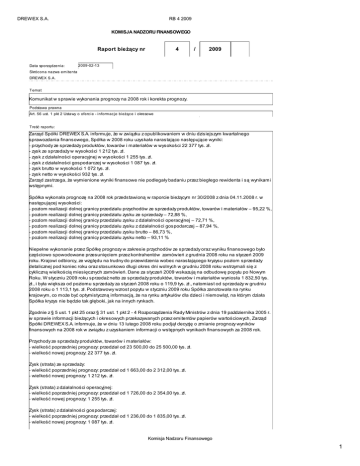 DREWEX S.A. RB 4 2009 KOMISJA NADZORU FINANSOWEGO Raport bieżący nr Data sporządzenia: 4 / 2009 2009-02-13 Skrócona nazwa emitenta DREWEX S.A. Temat Komunikat w sprawie wykonania prognozy na 2008 rok i korekta prognozy. Podstawa prawna Art. 56 ust. 1 pkt 2 Ustawy o oferc ie - informacje bieżące i okresowe Treść raportu: Zarząd Spółki DREWEX S.A. informuje, że w związku z opublikowaniem w dniu dzisiejszym kwartalnego sprawozdania finansowego, Spółka w 2008 roku uzyskała narastająco następujące wyniki: - przychody ze sprzedaży produktów, towarów i materiałów w wysokości 22 377 tys. zł. - zysk ze sprzedaży w wysokości 1 212 tys. zł. - zysk z działalności operacyjnej w wysokości 1 255 tys. zł. - zysk z działalności gospodarczej w wysokości 1 087 tys. zł. - zysk brutto w wysokości 1 072 tys. zł. - zysk netto w wysokości 932 tys. zł. Zarząd zastrzega, że wymienione wyniki finansowe nie podlegały badaniu przez biegłego rewidenta i są wynikami wstępnymi. Spółka wykonała prognozę na 2008 rok przedstawioną w raporcie bieżącym nr 30/2008 z dnia 04.11.2008 r. w następującej wysokości: - poziom realizacji dolnej granicy przedziału przychodów ze sprzedaży produktów, towarów i materiałów – 95,22 %, - poziom realizacji dolnej granicy przedziału zysku ze sprzedaży – 72,88 %, - poziom realizacji dolnej granicy przedziału zysku z działalności operacyjnej – 72,71 %, - poziom realizacji dolnej granicy przedziału zysku z działalności gospodarczej – 87,94 %, - poziom realizacji dolnej granicy przedziału zysku brutto – 86,73 %, - poziom realizacji dolnej granicy przedziału zysku netto – 93,11 % Niepełne wykonanie przez Spółkę prognozy w zakresie przychodów ze sprzedaży oraz wyniku finansowego było częściowo spowodowane przesunięciem przez kontrahentów zamówień z grudnia 2008 roku na styczeń 2009 roku. Krajowi odbiorcy, ze względu na trudny do przewidzenia wobec narastającego kryzysu poziom sprzedaży detalicznej pod koniec roku oraz stosunkowo długi okres dni wolnych w grudniu 2008 roku wstrzymali się z cykliczną wielkością miesięcznych zamówień. Dane za styczeń 2009 wskazują na odbudowę popytu po Nowym Roku. W styczniu 2009 roku sprzedaż netto ze sprzedaży produktów, towarów i materiałów wyniosła 1 832,50 tys. zł., i była większa od poziomu sprzedaży za styczeń 2008 roku o 119,9 tys. zł., natomiast od sprzedaży w grudniu 2008 roku o 1 113,1 tys. zł. Podstawowy wzrost popytu w styczniu 2009 roku Spółka zanotowała na rynku krajowym, co może być optymistyczną informacją, że na rynku artykułów dla dzieci i niemowląt, na którym działa Spółka kryzys nie będzie tak głęboki, jak na innych rynkach. Zgodnie z § 5 ust. 1 pkt 25 oraz § 31 ust. 1 pkt 2 - 4 Rozporządzenia Rady Ministrów z dnia 19 października 2005 r. w sprawie informacji bieżących i okresowych przekazywanych przez emitentów papierów wartościowych, Zarząd Spółki DREWEX S.A. informuje, że w dniu 13 lutego 2008 roku podjął decyzję o zmianie prognozy wyników finansowych na 2008 rok w związku z uzyskaniem informacji o wstępnych wynikach finansowych za 2008 rok. Przychody ze sprzedaży produktów, towarów i materiałów: - wielkość poprzedniej prognozy: przedział od 23 500,00 do 25 500,00 tys. zł. - wielkość nowej prognozy: 22 377 tys. zł. Zysk (strata) ze sprzedaży: - wielkość poprzedniej prognozy: przedział od 1 663,00 do 2 312,00 tys. zł. - wielkość nowej prognozy: 1 212 tys. zł. Zysk (strata) z działalności operacyjnej: - wielkość poprzedniej prognozy: przedział od 1 726,00 do 2 354,00 tys. zł. - wielkość nowej prognozy: 1 255 tys. zł. Zysk (strata) z działalności gospodarczej: - wielkość poprzedniej prognozy: przedział od 1 236,00 do 1 835,00 tys. zł. - wielkość nowej prognozy: 1 087 tys. zł. Komisja Nadzoru Finansowego 1 DREWEX S.A. RB 4 2009 Zysk (strata) brutto: - wielkość poprzedniej prognozy: przedział od 1 236,00 do 1 835,00 tys. zł. - wielkość nowej prognozy: 1 072 tys. zł. Zysk (strata) netto: - wielkość poprzedniej prognozy: przedział od 1 001,00 do 1 487,00 tys. zł. - wielkość nowej prognozy: 932 tys. zł. DREWEX SPÓŁKA AKCYJNA (peł na nazwa emitenta) DREWEX S.A. Drzewny (drz) (skrócona nazwa emitenta) 30-383 (sektor wg. klasyfikac ji GPW w W-wie) Kraków (kod pocztowy) (miejsc owość) Obozowa 42A/2 (ulic a) (numer) 033 087 47 80 033 873 47 83 (tel efon) (fax) (e-mail) (www) 6792904110 120307910 (NIP) (REGON) PODPISY OSÓB REPREZENTUJĄCYCH SPÓŁKĘ Data Imię i Nazwisko Stanowisko/Funkcja 2009-02-13 Jacek Szczur Jacek Szczur Podpis Komisja Nadzoru Finansowego 2