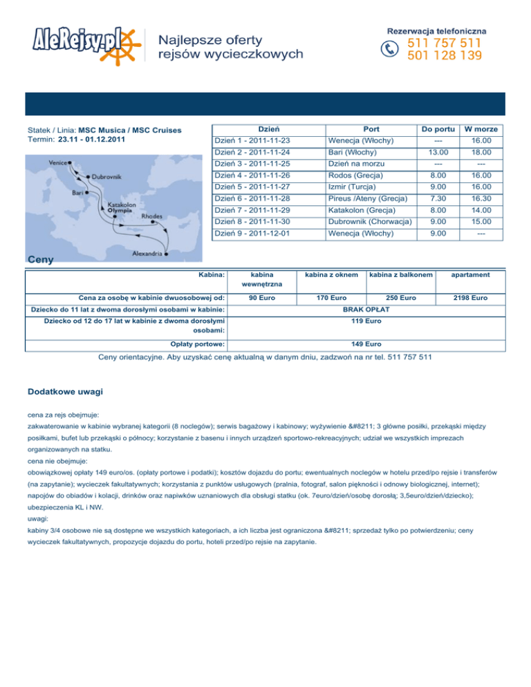 Statek / Linia: MSC Musica / MSC Cruises Termin: 23.11 - 01.12.2011 Dzień Port Do portu W morze --- 16.00 13.00 18.00 --- --- Rodos (Grecja) 8.00 16.00 Dzień 5 - 2011-11-27 Izmir (Turcja) 9.00 16.00 Dzień 6 - 2011-11-28 Pireus /Ateny (Grecja) 7.30 16.30 Dzień 7 - 2011-11-29 Katakolon (Grecja) 8.00 14.00 Dzień 8 - 2011-11-30 Dubrownik (Chorwacja) 9.00 15.00 Dzień 9 - 2011-12-01 Wenecja (Włochy) 9.00 --- Dzień 1 - 2011-11-23 Wenecja (Włochy) Dzień 2 - 2011-11-24 Bari (Włochy) Dzień 3 - 2011-11-25 Dzień na morzu Dzień 4 - 2011-11-26 Ceny Kabina: Cena za osobę w kabinie dwuosobowej od: kabina wewnętrzna kabina z oknem kabina z balkonem apartament 90 Euro 170 Euro 250 Euro 2198 Euro Dziecko do 11 lat z dwoma dorosłymi osobami w kabinie: BRAK OPŁAT Dziecko od 12 do 17 lat w kabinie z dwoma dorosłymi osobami: 119 Euro Opłaty portowe: 149 Euro Ceny orientacyjne. Aby uzyskać cenę aktualną w danym dniu, zadzwoń na nr tel. 511 757 511 Dodatkowe uwagi cena za rejs obejmuje: zakwaterowanie w kabinie wybranej kategorii (8 noclegów); serwis bagażowy i kabinowy; wyżywienie – 3 główne posiłki, przekąski między posiłkami, bufet lub przekąski o północy; korzystanie z basenu i innych urządzeń sportowo-rekreacyjnych; udział we wszystkich imprezach organizowanych na statku. cena nie obejmuje: obowiązkowej opłaty 149 euro/os. (opłaty portowe i podatki); kosztów dojazdu do portu; ewentualnych noclegów w hotelu przed/po rejsie i transferów (na zapytanie); wycieczek fakultatywnych; korzystania z punktów usługowych (pralnia, fotograf, salon piękności i odnowy biologicznej, internet); napojów do obiadów i kolacji, drinków oraz napiwków uznaniowych dla obsługi statku (ok. 7euro/dzień/osobę dorosłą; 3,5euro/dzień/dziecko); ubezpieczenia KL i NW. uwagi: kabiny 3/4 osobowe nie są dostępne we wszystkich kategoriach, a ich liczba jest ograniczona – sprzedaż tylko po potwierdzeniu; ceny wycieczek fakultatywnych, propozycje dojazdu do portu, hoteli przed/po rejsie na zapytanie. MSC Musica MSC Musica Tonaż: 89.600 ton Rok budowy:2006 Długość: 293,8 m Szerokość: 32,2 m Szybkość: 23 węzły Pokłady pasażerskie: 13 Załoga: 987 Pasażerowie: 3.000 Basen: 2 (4 jacuzzi i basen dla dzieci) Waluta: EURO Do dyspozycji: 4 restauracje, bary, sushi bar, wine bar, kasyno, pokój cygar, pokój gier, dyskoteka, sala widowiskowa, kino, salon odnowy biologicznej, sauna, fitness center, boisko (kort tenisowy), symulator do gry w golfa, trasa do joggingu, pokój zabaw dla dzieci, punkt medyczny, biblioteka, kawiarenka internetowa, sala gier video, salon piękności, butiki, sklep wolnocłowy, centrum konferencyjne. Kabiny: 1275 kabin wyposażonych w łazienkę (prysznic, wc, suszarka), klimatyzację (indywidualnie sterowaną), radio pokładowe, telefon do użytku wewnętrznego, sejf, mini bar, TV. 809 kabin posiada balkony. Większość kabin ma 2 pojedyncze łóżka, które na zmówienie można połączyć w 1 podwójne. 18 Kabin typu suite (25m2) łóżko małżeńskie, które na zamówienie można rozłączyć na 2 pojedyncze. Od chwili gdy wejdziesz na pokład MSC Musica poczujesz muzykę w powietrzu. Jej nowoczesny wystrój prezentuje perfekcyjne wyważenie design w najlepszym smaku, eleganckie otoczenie oraz przepiękne detale. Goście z całego świata będą cieszyć się kosmopolityczną atmosferą i ośrodkami rozrywki które obejmują pokładowy kort do tenisa, mini-golfa oraz dobrze wyposażone centrum SPA i siłownie. Dobra włoska kuchnia, międzynarodowe przysmaki, posiłki na werandzie czy bar Sushi zaspokoją twój apetyt.